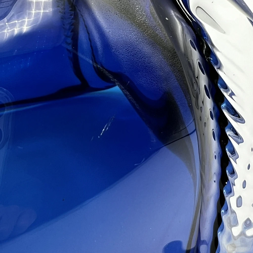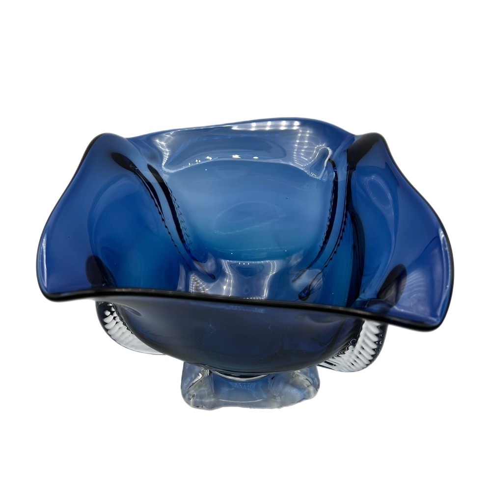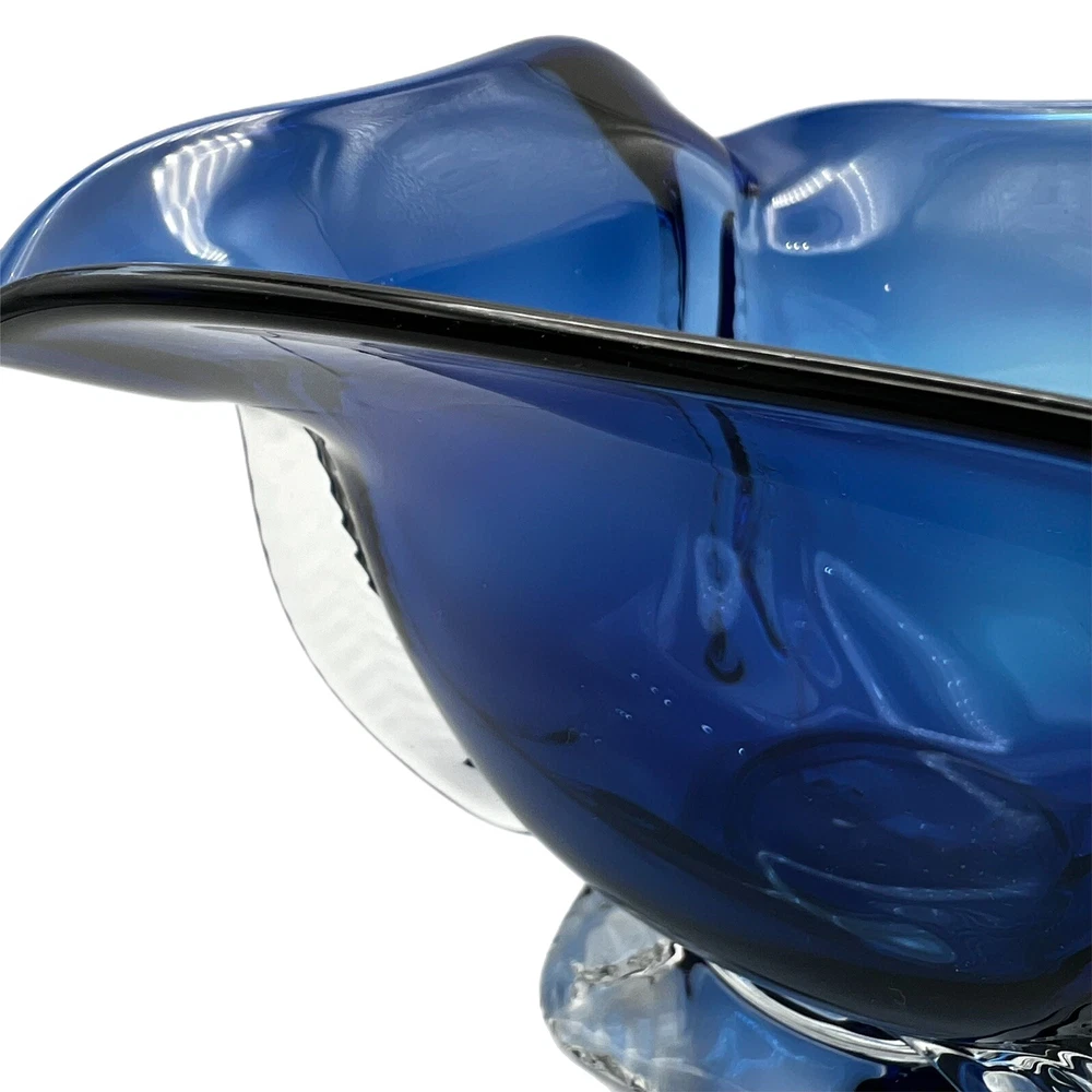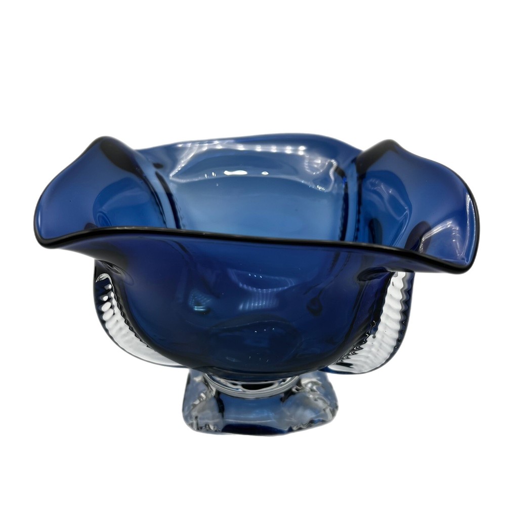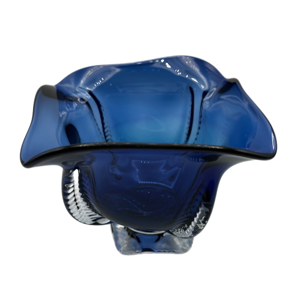 Listed is Cobalt Blue Studio Art Glass Ruffled Pedestal Bowl Signed Robinson Scott 1999. This bowl is in good pre-owned condition with no chips or cracks. There is a scratch measuring about 1/4" on one side as seen in the photos. Please see photos.