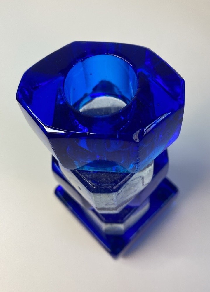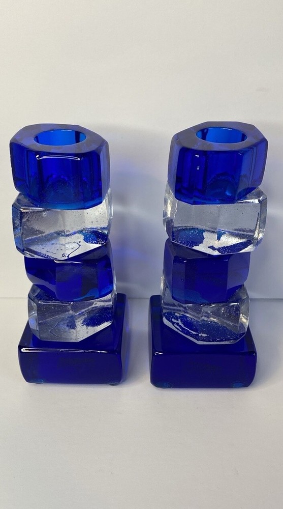 Unique Set of 2 Colorful Glass Candle holders by Riverside Studios in Pittsburg, PA. They measure 5” tall. They are marked Riverside Studios, USA. They are new old stock. Bubbles in glass. There may be imperfections due to being hand made. Keywords Modern contemporary abstract