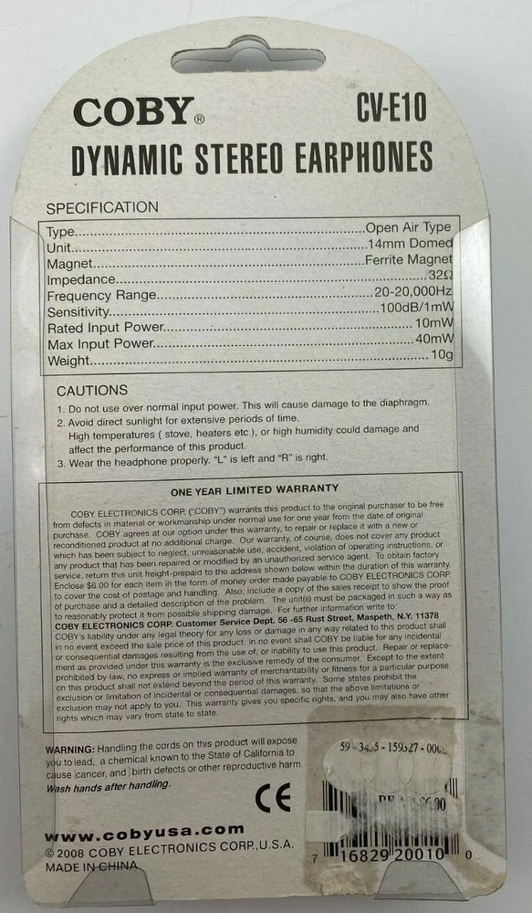 Coby CV-E10 Dynamic Stereo Earphones NIP Type: Open Air Type Unit: 14mm Domed Magnet: Ferriite Magnet Impedance: 32 Frequency Range: 20-20,000 Hz Sensitivity: 100dB/ 1mW Rated Input Power: 10 mW Max. Input Power: 40 mW Please review the photo's as they are a part of the description. ☺