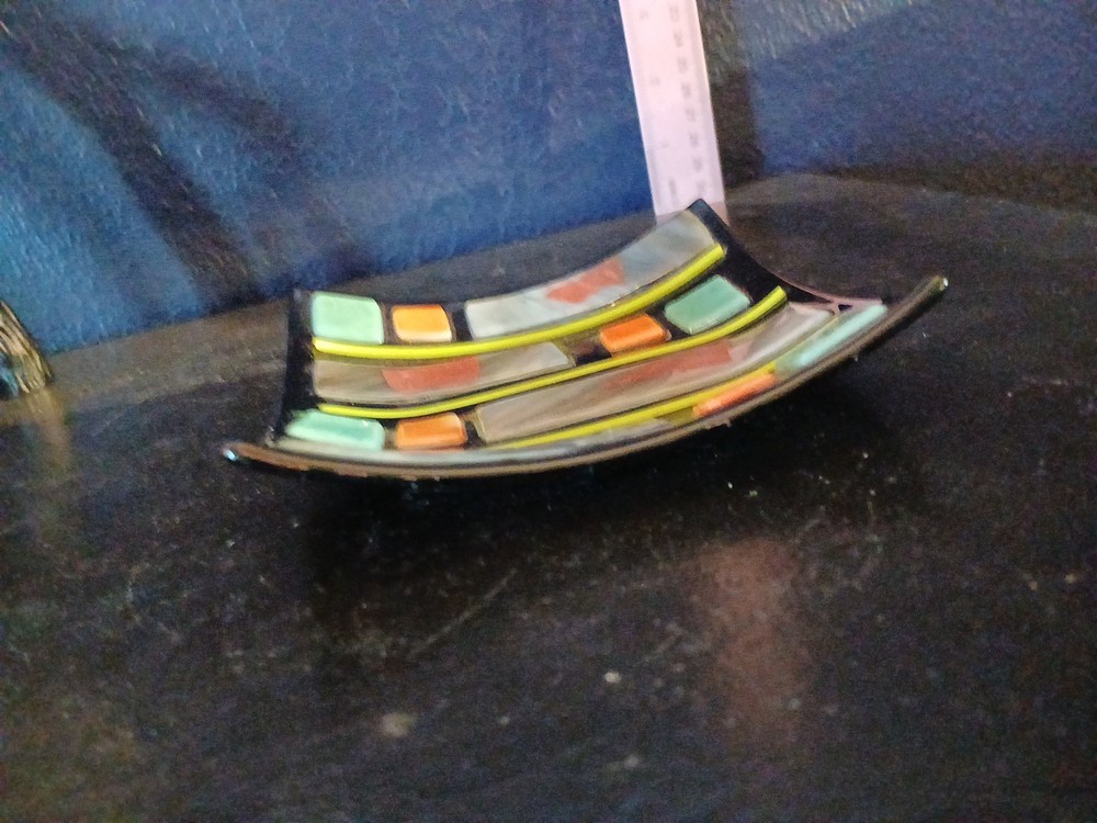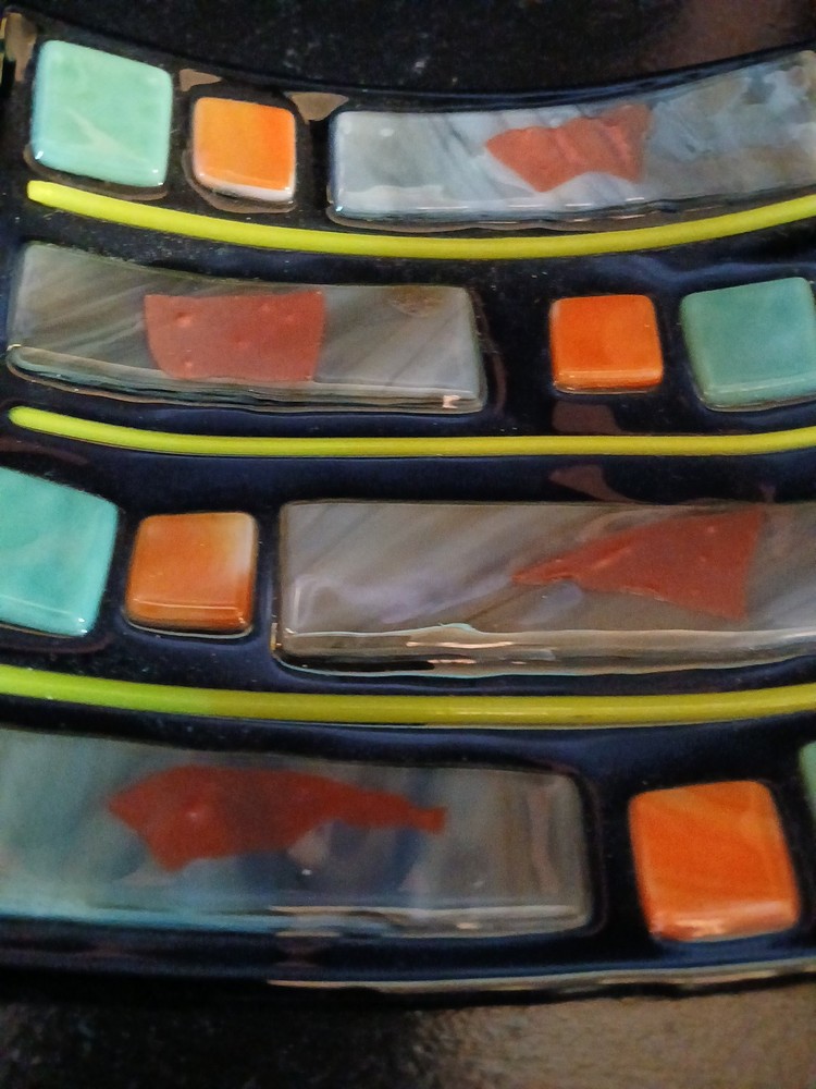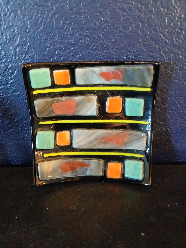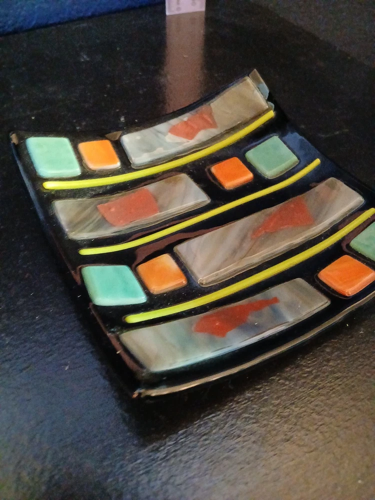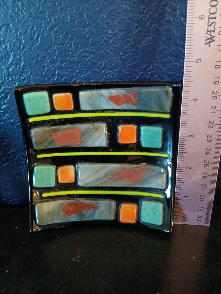 This stunning little tray is a true work of art! The vibrant colors and geometric patterns pop beautifully, making it perfect for displaying jewelry, serving small treats, or just adding a cheerful accent to any space. The craftsmanship is impressive—you can tell it's handmade with care. The size is ideal for small decorative uses, and the fused glass gives it a lovely weight and durability. A unique, eye-catching piece that adds personality to any room!