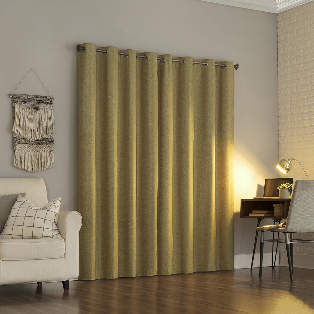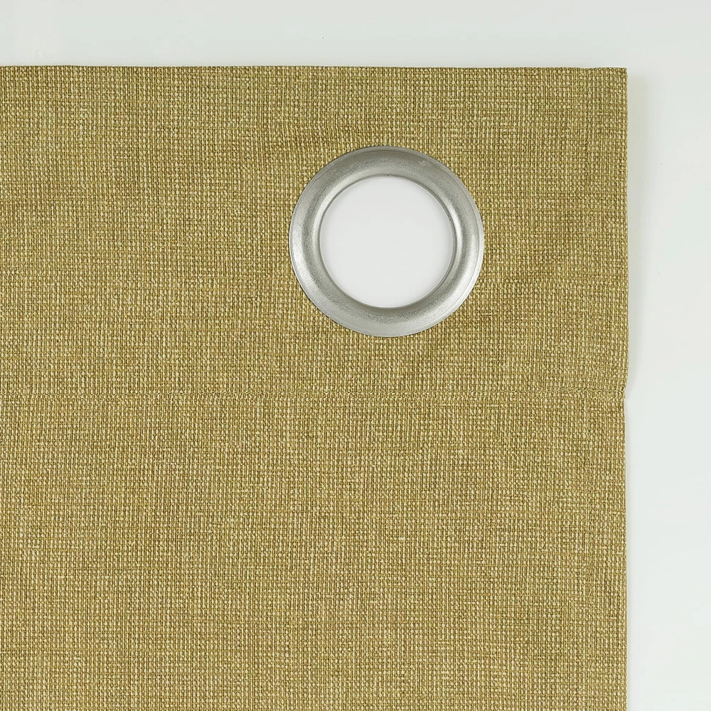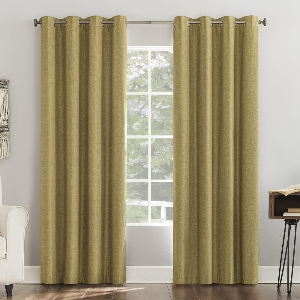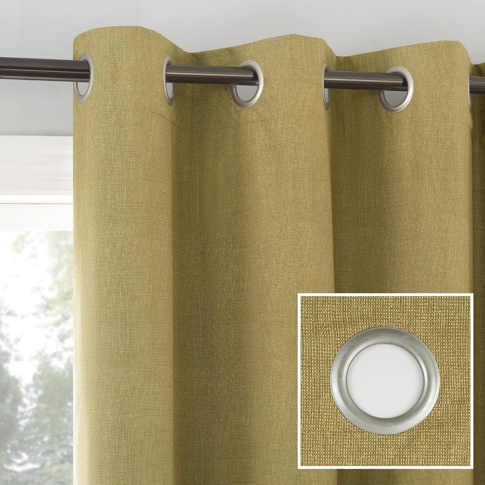 Columbia Thermal Energy Saving 100% Blackout Grommet Curtain Panel Pairs provide the ultimate in light blocking technology to keep out even the harshest of light while bringing a subtle texture to any room of your home. Total Blackout technology is laboratory tested to block out 100% of light, reduce outside noise by up to 35%, and decrease energy lost through your windows by up to 35%. Comfort is optimized with thermal insulation that helps keep summer heat and winter chill out of your home. Equipped with built-in metal grommets for easy hanging on standard curtain rods up to 1.5" in diameter. Hang in your entertainment room to eliminate screen glare and reduce distracting outside noise, or in your bedroom for enhanced privacy and a sounder, more uninterrupted sleep. Pair includes 2 gold panels, each measuring 50" width by 84" length. Measure carefully before selecting your desired size and quantity. Rod not included. Machine wash cold on gentle cycle. Use non-chlorine bleach when needed. Tumble dry on low heat. Total Blackout technology blocks out 100% of outside light while enhancing privacy Thermal insulation helps keep summer heat and winter chill out of your home Energy efficient design reduces energy lost through your windows by up to 35% Noise reduction up to 35% helps you get a sounder, more uninterrupted sleep Built-in metal grommets fit curtain rods up to 1.5" in diameter Pair includes 2 panels