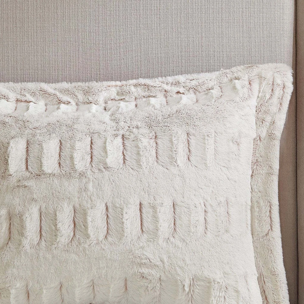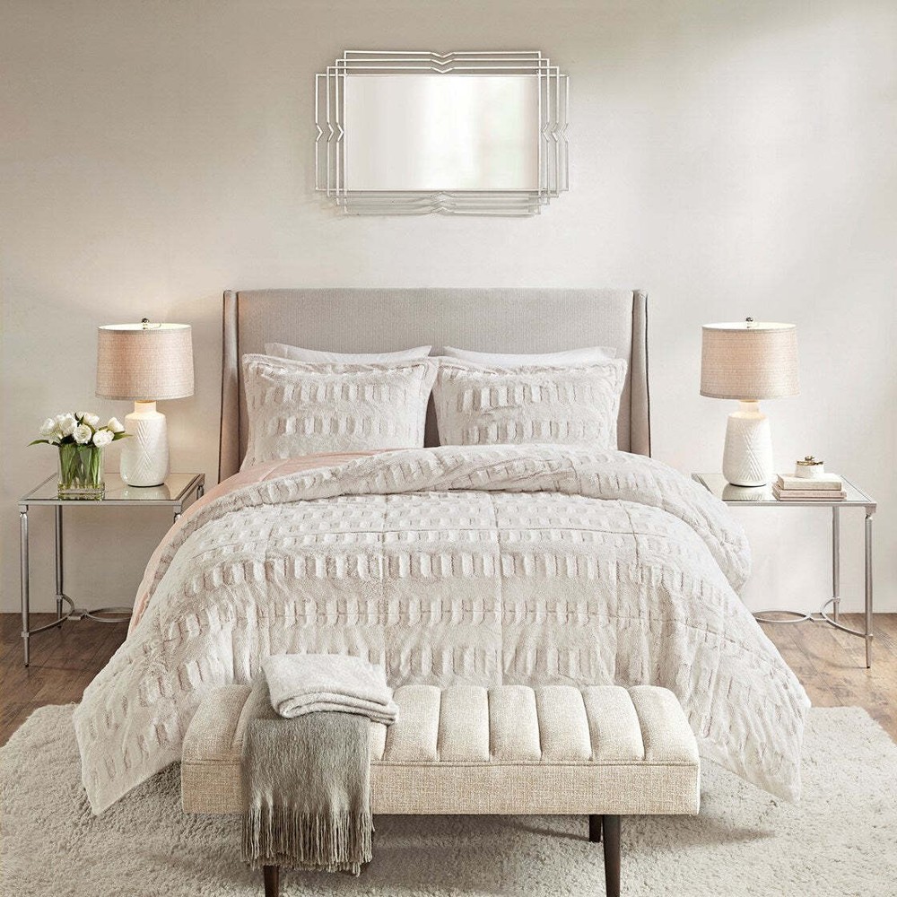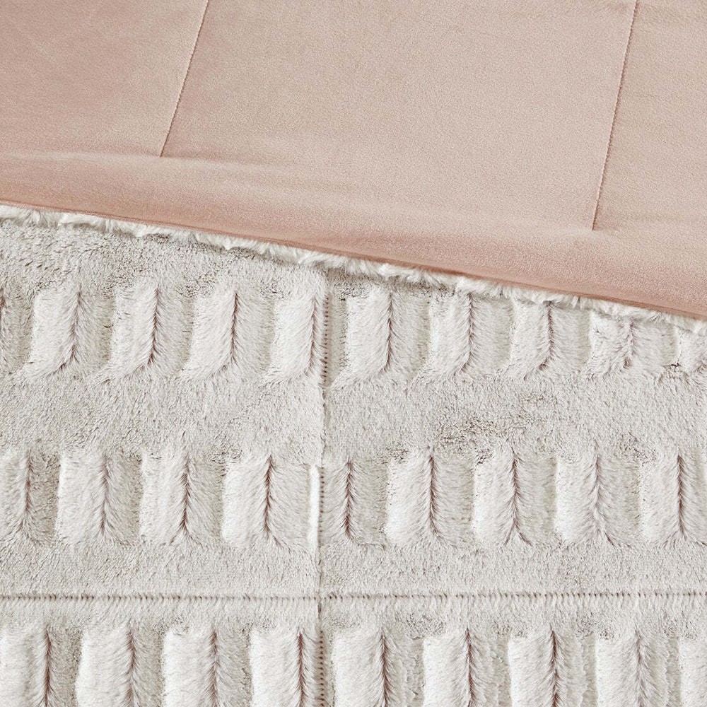 Specification Bed Size:King Main Color:White Main Material:Polyester Details Product Features: Stylish brushed faux fur Soft faux mink reverse 2 shams included (1 sham for twin size) with 2-inch flange Hypoallergenic polyester filling End-to-end box sewn keeps fill in place Machine wash separately in large capacity washer with cold water on gentle cycle, do not use fabric softener or bleach Tumble dry separately in large capacity dryer on low heat Minor shedding is expected with faux fur material and should subside after 3-4 washes Oeko-Tex Certified, includes no harmful substances or chemicals Description: Description Sleep in the pure softness and comfort of the Gia Back Print Long Fur Comforter Mini Set. The ultra-soft blush comforter flaunts a stylish brushed faux fur on the face that flips to a soft faux mink reverse, for a luxurious look and feel. Matching shams (1 sham for Twin sizes) mirror the design of the comforter and feature a 2-inch flange to complete the comforter set. Hypoallergenic filling in the faux fur comforter provides exceptional warmth and comfort, while the end-to-end box stitching keeps the filling in place. Incredibly soft, this reversible long fur comforter mini set brings the perfect amount of comfort and glamorous style to your bedroom decor. This comforter set is also OEKO-TEX certified, meaning it does not contain any harmful substances or chemicals to ensure quality comfort and wellness. Product Details King/Cal King1 Comforter:104"W x 90"L2 King Shams:20"W x 36"L + 2"D (2) Material Comforter: back print long fur to solid mink, 6D Poly Fiber FillingSham: back print long fur to solid mink Listing and template services provided by inkFrog