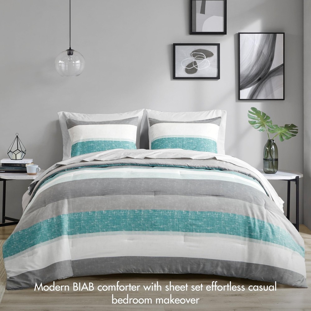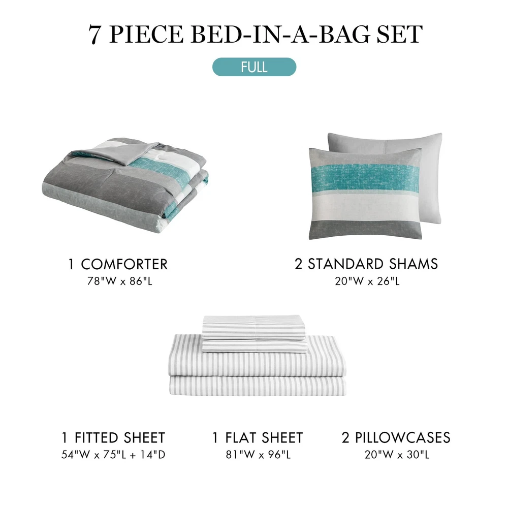 CASUAL DESIGN - This modern casual grey comforter set features a stripe pattern in alternating grey, navy, and blue colors that’s pair with a solid grey reverse to create a casual vibe BED IN A BAG - Effortless makeover to revamp your bedroom style with the Essentials Jaxon 7 piece bed in a bag comforter with sheet set SOFT - Soft brushed microfiber stripes comforter complemented with stripes sheet set for modern and casual complete bedding makeover, OEKO-TEX certified for superior COMFORT and WELLNESS, as they are free from any substances or chemicals Set include: 1 Comforter: 78"W x 86"L, 2 Standard Shams: 20"W x 26"L, 1 Flat Sheet: 81"W x 96"L, 1 Fitted Sheet: 54"W x 75"L + 14"D, 2 Standard Pillowcases: 20"W x 30"L CARE INSTRUCTIONS - Machine washable. Use large capacity washer and dryer for best results. Cold/delicate cycle, low/no heat dry. Comes in compressed packaging, fluff up items as needed. Steam iron for wrinkles