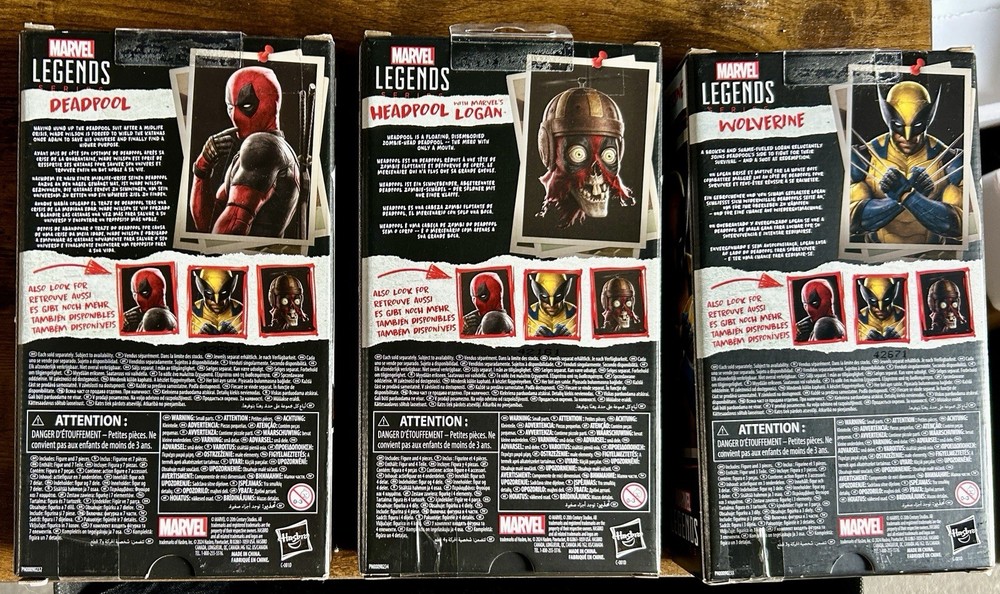 The product is a complete set of 3 action figures featuring characters from the Deadpool and Wolverine franchises. The set includes Deadpool, Wolverine, and Headpool, all in a 1:12 scale and made of plastic material. These authentic Hasbro figures are part of the Marvel Legend series, based on the X-Men TV show and movies. The figures are not signed and are not personalized, making them a perfect addition to any collector's display. With recognizable actors such as Ryan Reynolds and Hugh Jackman featured in the franchise, these action figures are a must-have for fans of the iconic characters.