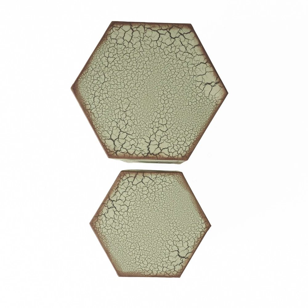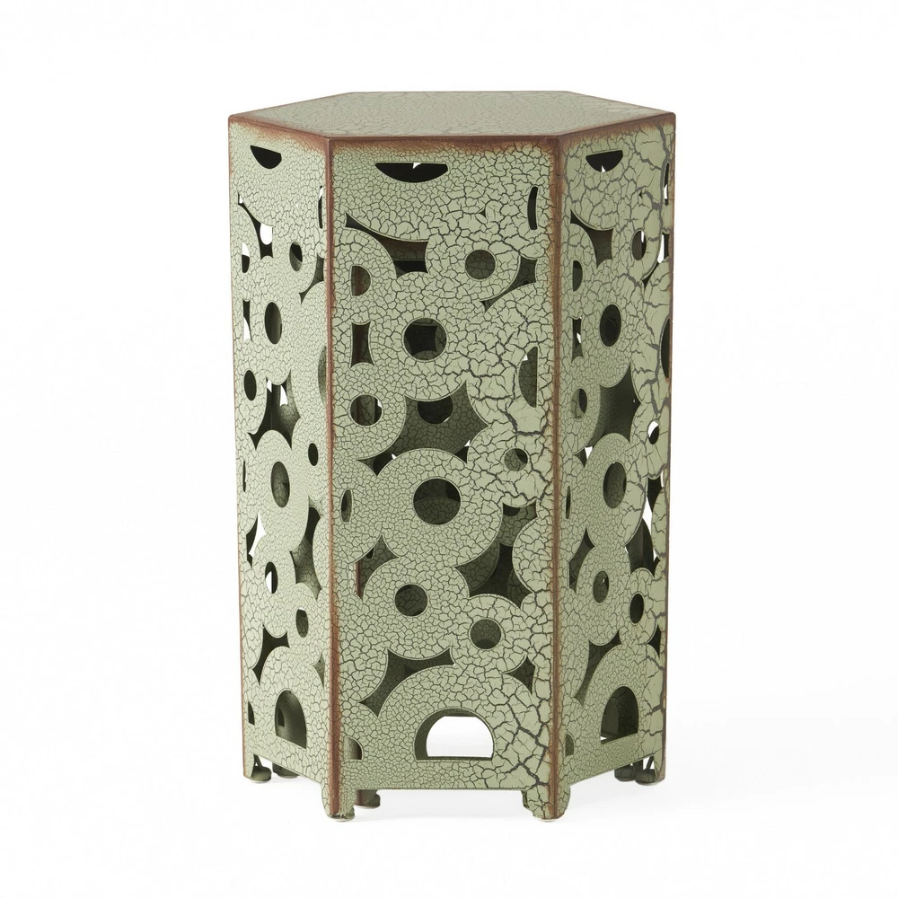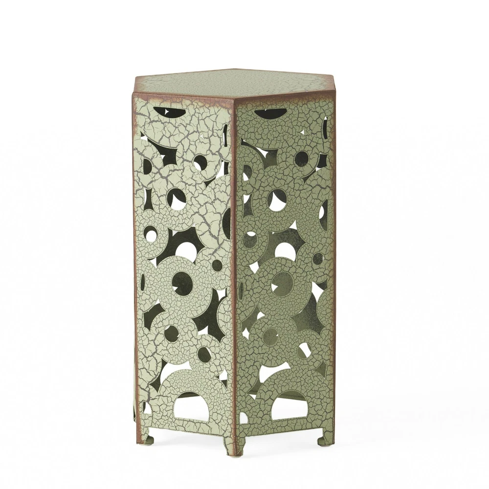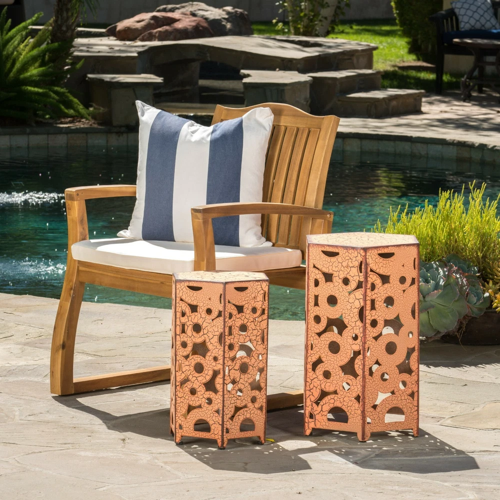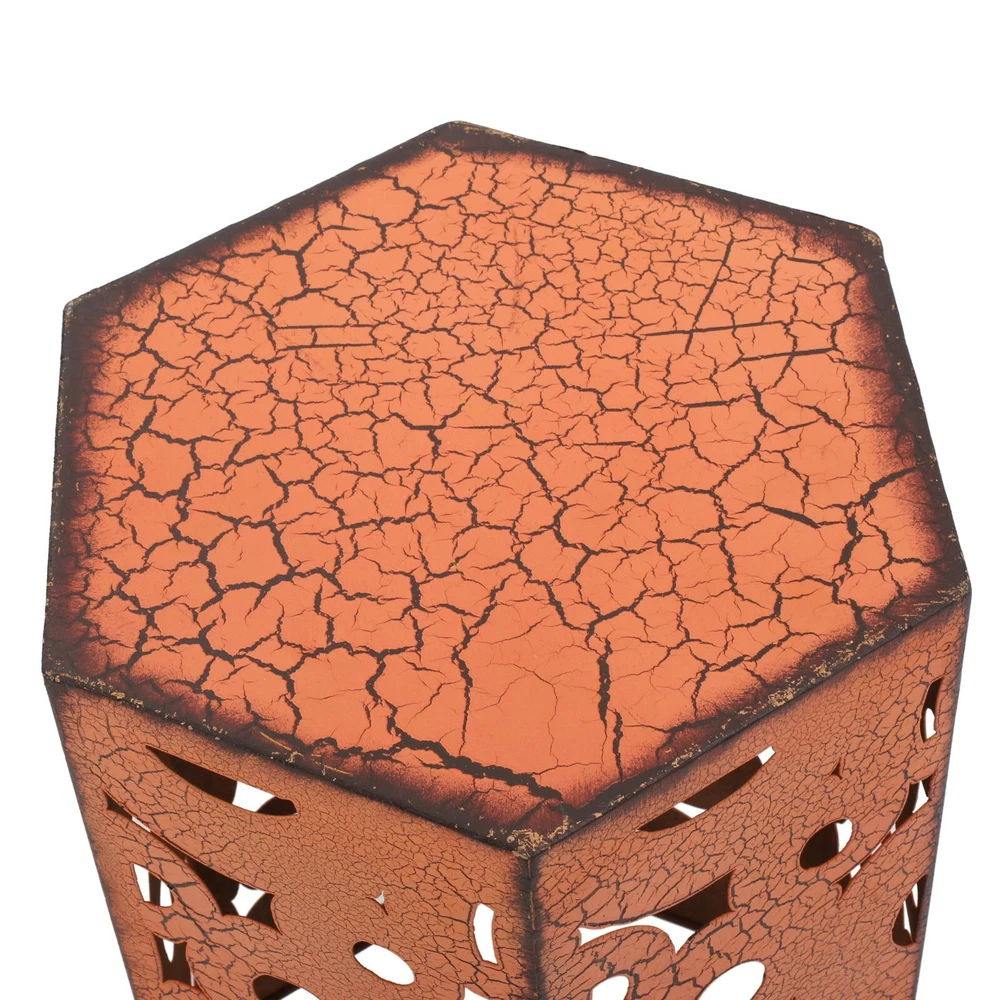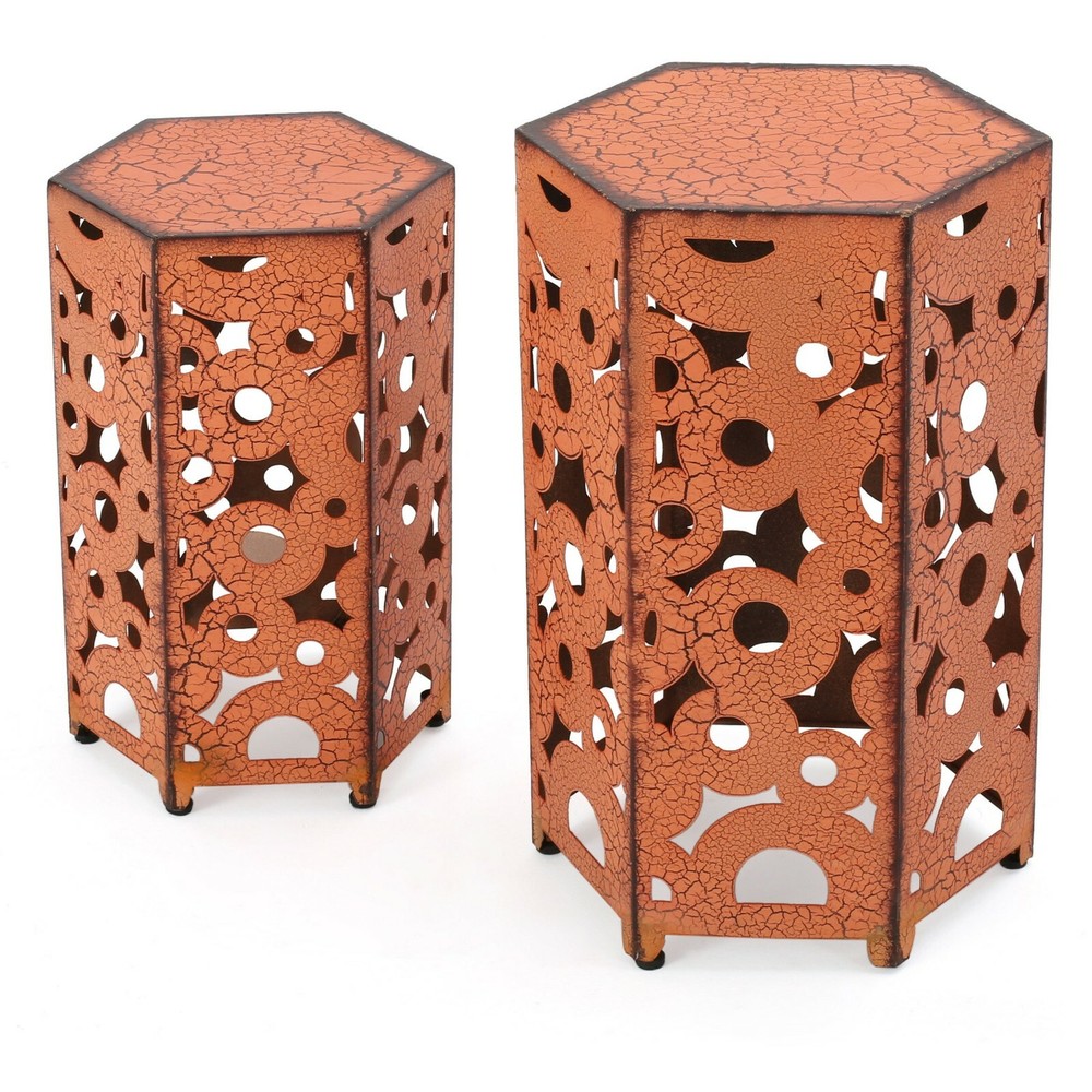 Looking to liven up your indoor or outdoor space? Then look no further than the Utica accent tables. These stylish tables are sure to get the conversation flowing and intrigue all of your guests as to which antique store you must have gotten it from. The intricate patterning of the fleur-de-lis on the tables gives them an air of history, as if they were taken straight out of French history. Features: Two (2) accent tables Constructed of powder coated iron Color : Orange / Green Dimensions: Large Table: 14.25"D x 12.50"W x 22"H Small Table: 12"D x 10.50"W x 18.25"H