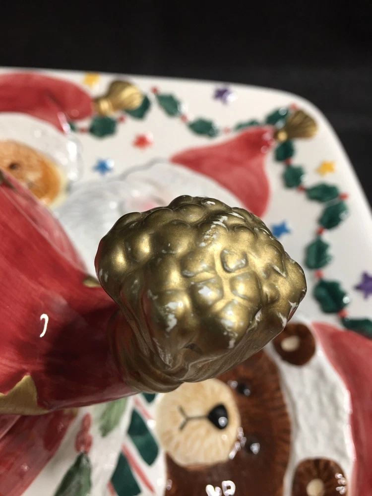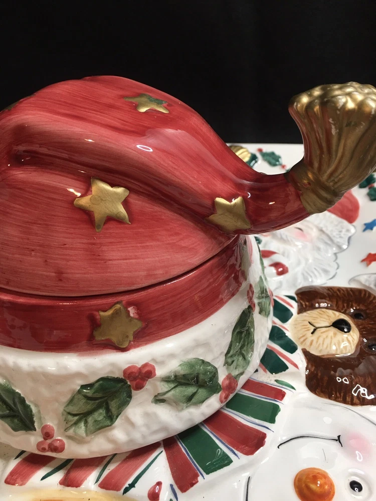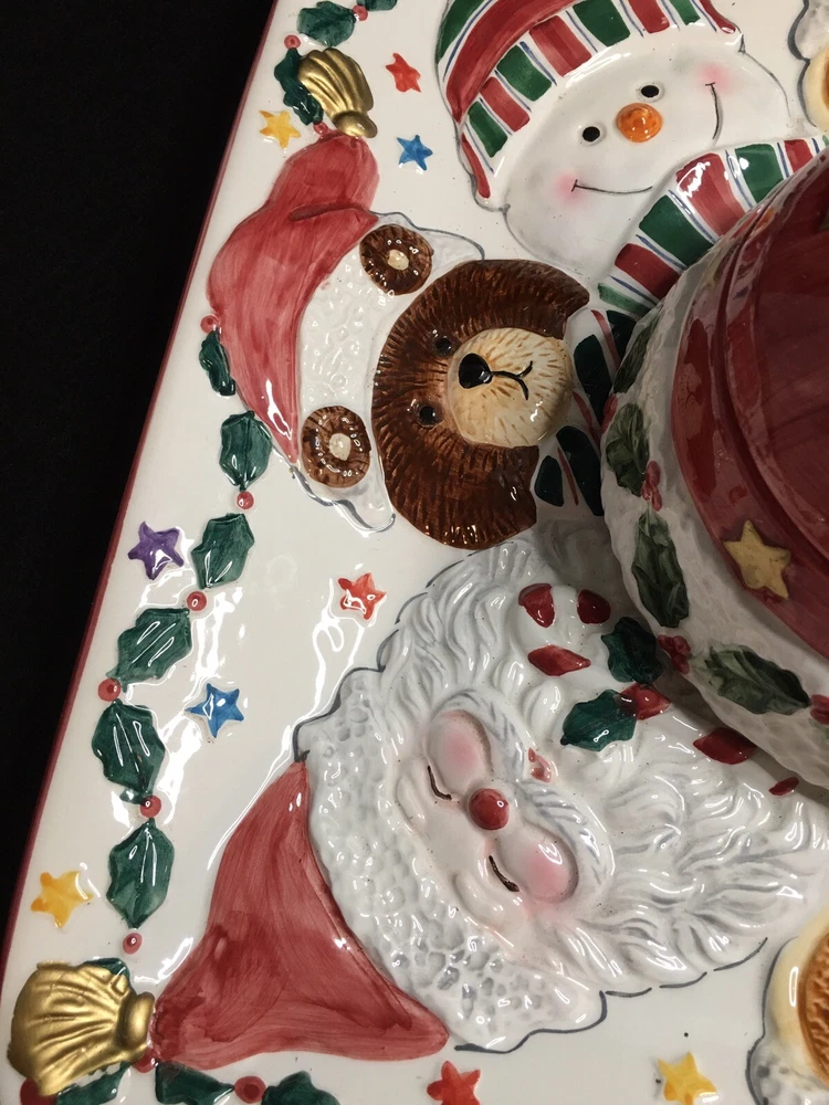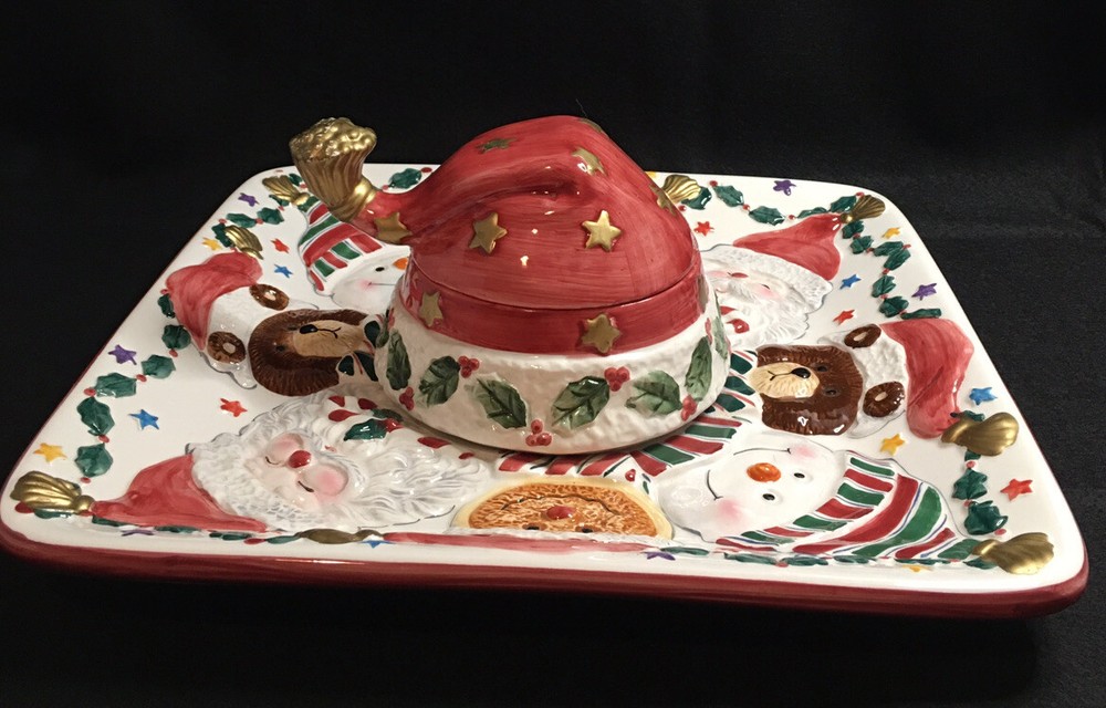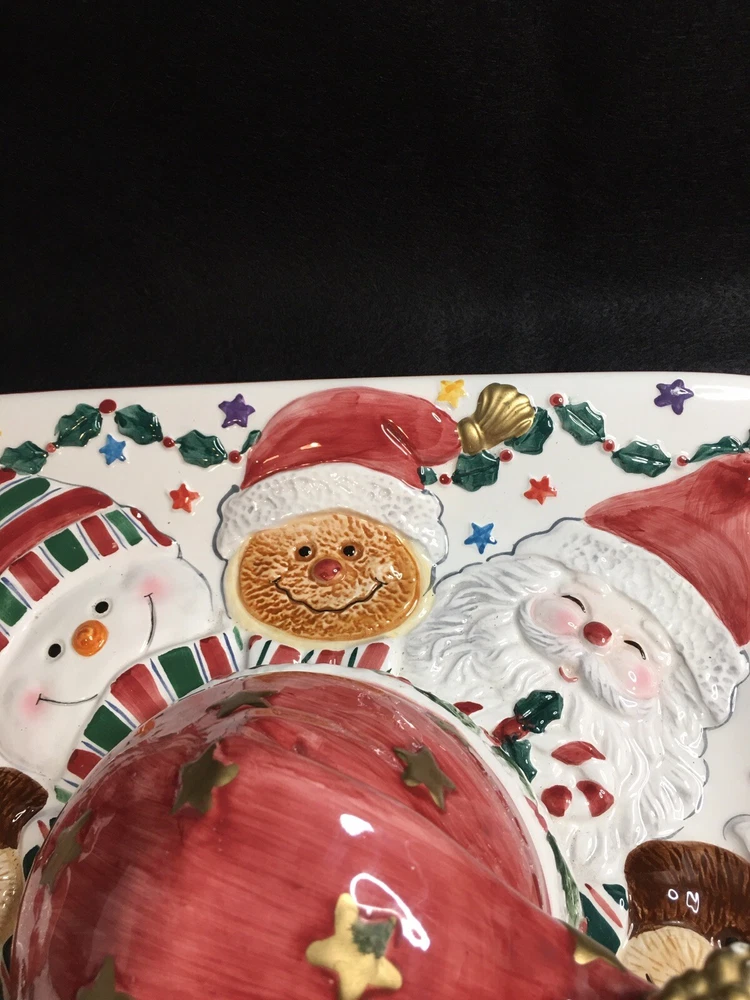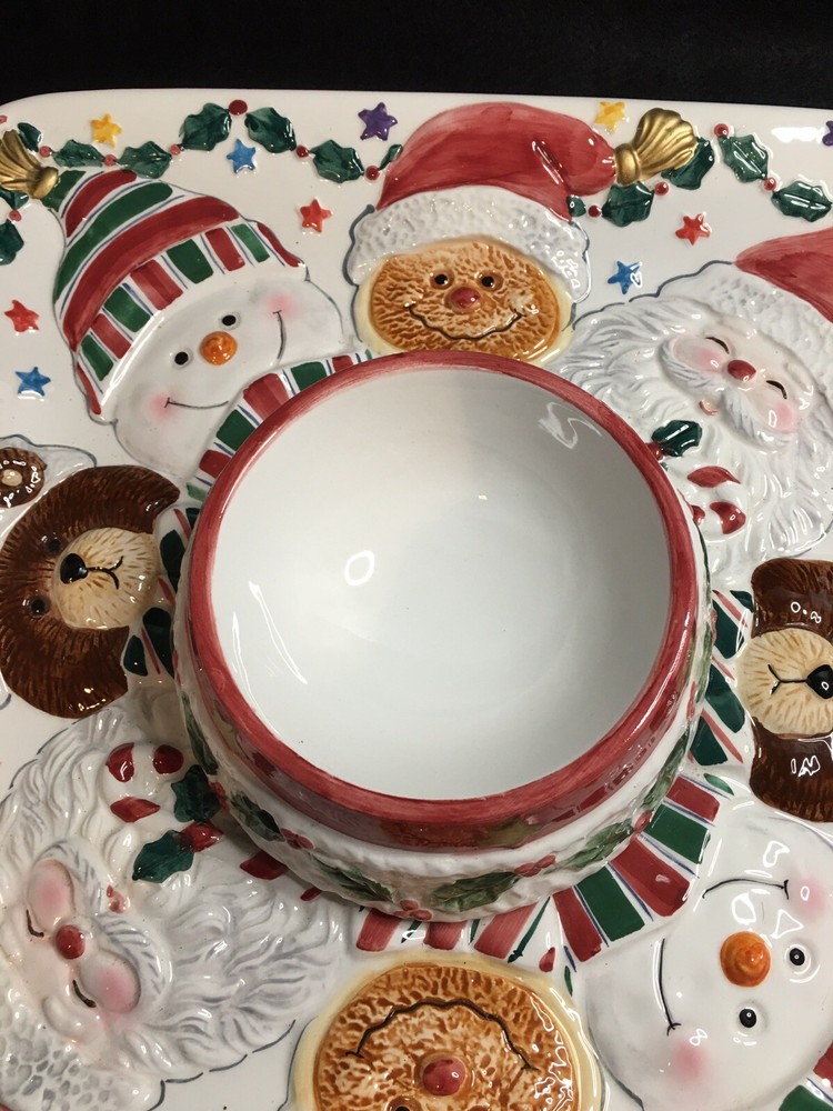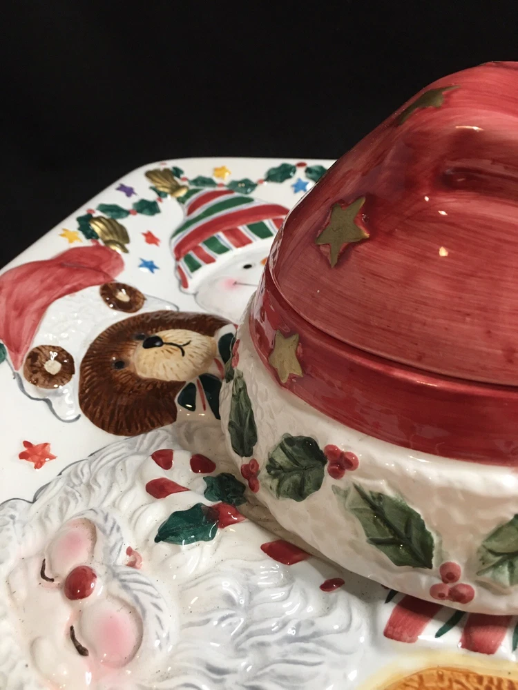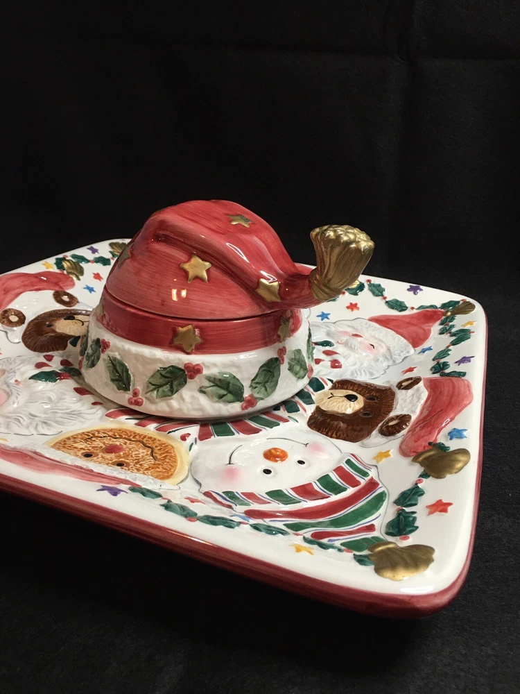Cookie Or Chips And Dip Christmas Ceramic Platter. World Bazaar Inc. Condition is Used. Adorable Christmas platter. Measures 13.5” by 13.5”. No chips or cracks. Gold paint on tassel of Santa hat which is the lid has some wear, see pictures. YT-E. L A 30% restocking fee will be charged on all returned itemsThere is a 30% restocking fee on all returned items