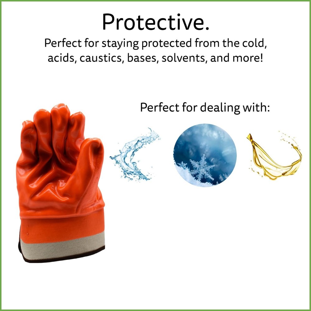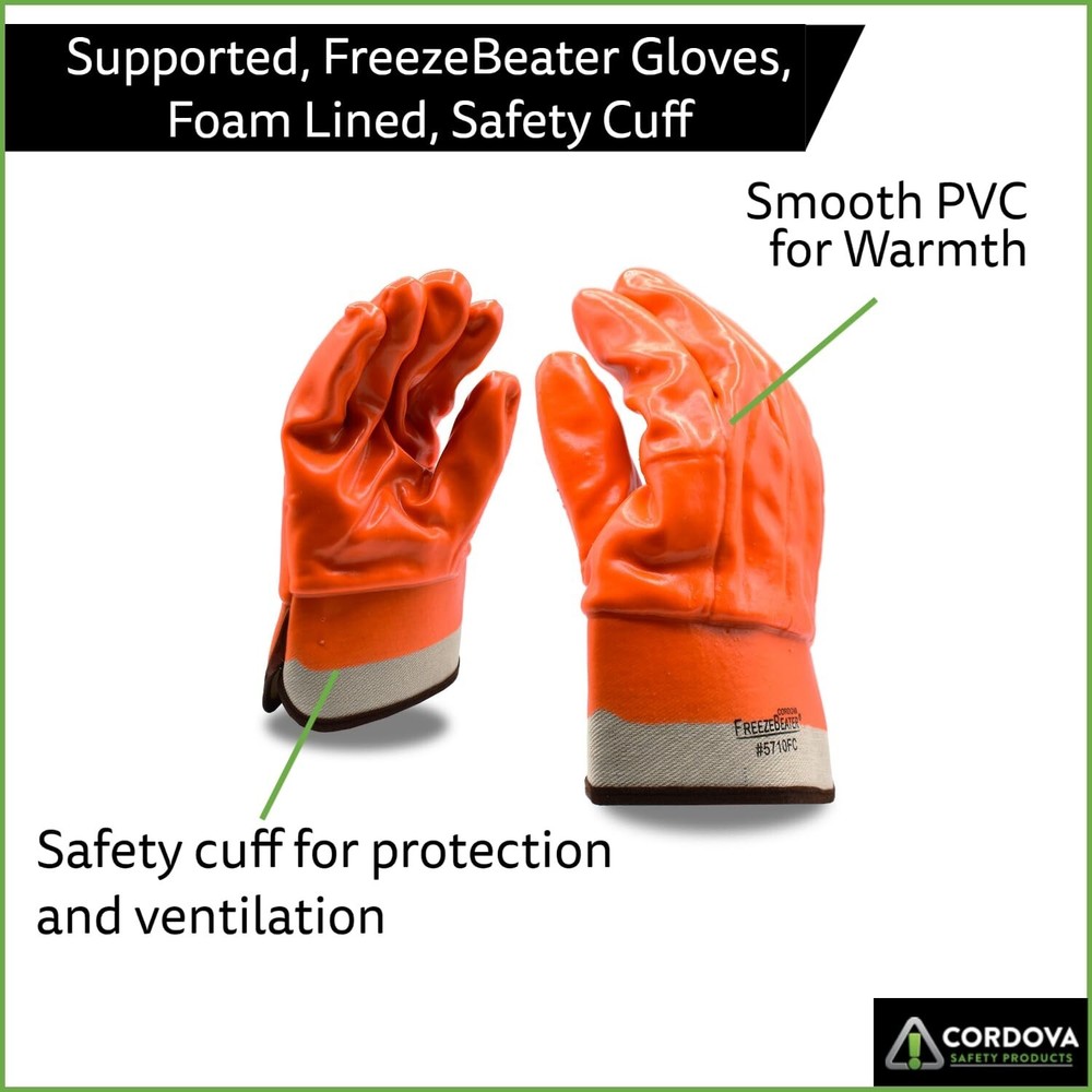 Cordova 5710F/C Hi-Vis Orange Cold Weather Gloves, Single Dipped, Foam Insulated PVC, Textured Finish, Safety Cuff, Large, 12-Pack Bulk Thermal Gloves Product Details Style: Single-dipped Brand: Cordova MPN: 5710F/C UPC: 796326571064 EAN: 0796326571064 Material: PVC, Foam-insulation Brand: Cordova Size: Large Color: Orange Special Feature: Insulated Manufacturer: Cordova Safety Products Part Number: 5710F/C Item Weight: 6.85 pounds Product Dimensions: 10 x 8 x 6 inches Country of Origin: China Item model number: 5710F/C Size: Large Color: Orange Style: Single-dipped Material: PVC, Foam-insulation Power Source: electric Item Package Quantity: 12 Number Of Pieces: 12 Measurement System: Metric Special Features: Insulated Included Components: Single-Dipped, Gloves, Work, PVC, Orange Batteries Required?: No Date First Available: April 14, 2016 FIT FOR THE JOB: These hi-vis gloves are perfect for work in cold environments, chemical handling, oil handling, fishing, general maintenance, janitorial, metal fabrication, and plumbing/HVAC PROTECTIVE: Double-dipped PVC for extra strength and durability; foam-insulation and PVC provide protection against most acids, oils, animal fats, caustics, detergents, solvents, petroleum hydrocarbons, and alcohols COMFORTABLE: These Large gloves have foam-insulated lining and a knit wrist to keep your hand warm and comfy while working BETTER GRIP: Textured finish increases your gripping power 12-PACK: Always be prepared or get your team the gear they need to do their best Cordova's supported glove series could very well be the most comfortable and customer-focused work gloves on the market today. This orange PVC single- dipped work glove is designed to protect your hands against any acids, bases, detergents or solvents. This item also features a smooth finish to increase dexterity, a foam insulated lining for comfort and a safety cuff on the wrist for added protection. It is sold by the dozen. Grab yours today.