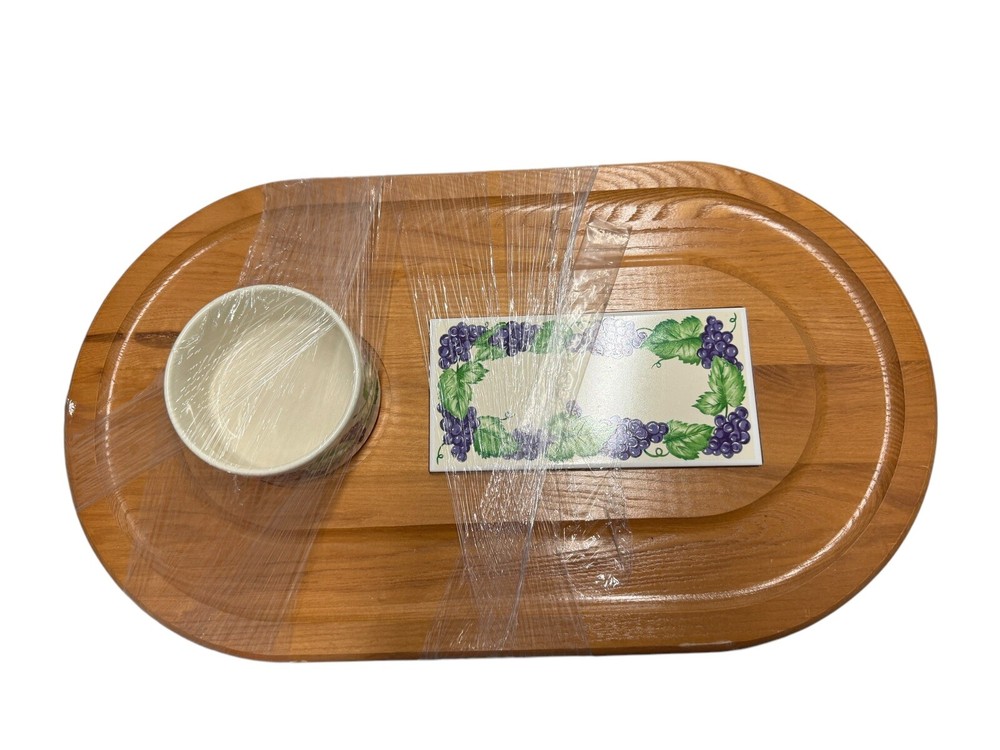 A beautiful vintage cheese tray with a ceramic dish and decorative tile. The tile and dish are decorated with a colorful grape design. The cheese plate is in excellent vintage condition with no chips, cracks. Just a few scratches since it is vintage but very gentle. The board measures 21-1/2" long by 12" wide with the tile being 7-3/4" by 3-7/8". The ceramic dish measures 4-1/4" by 2-1/2" deep. W6