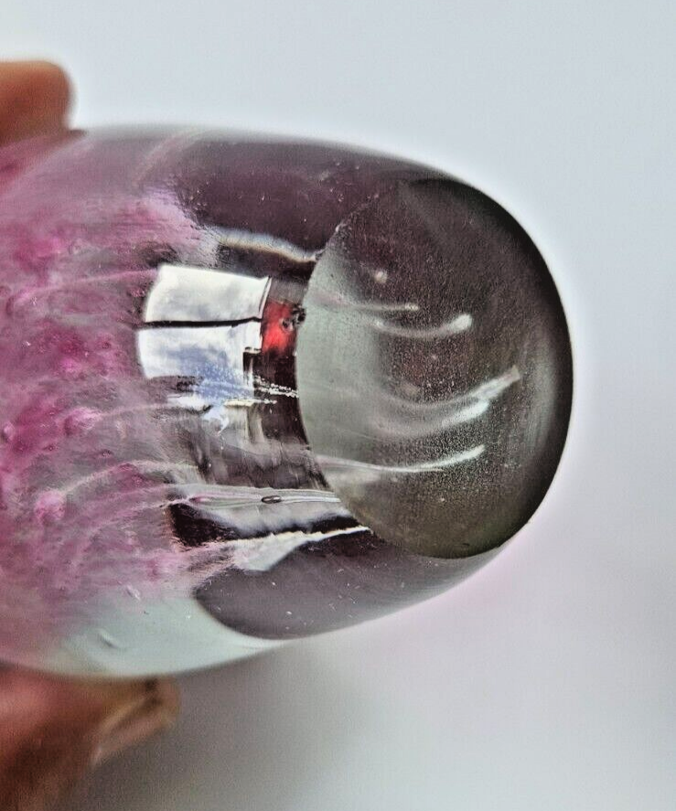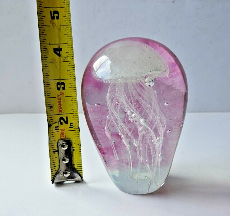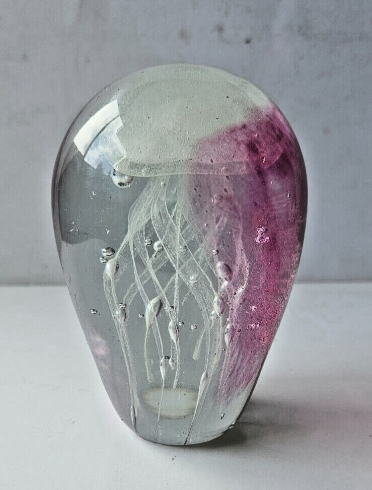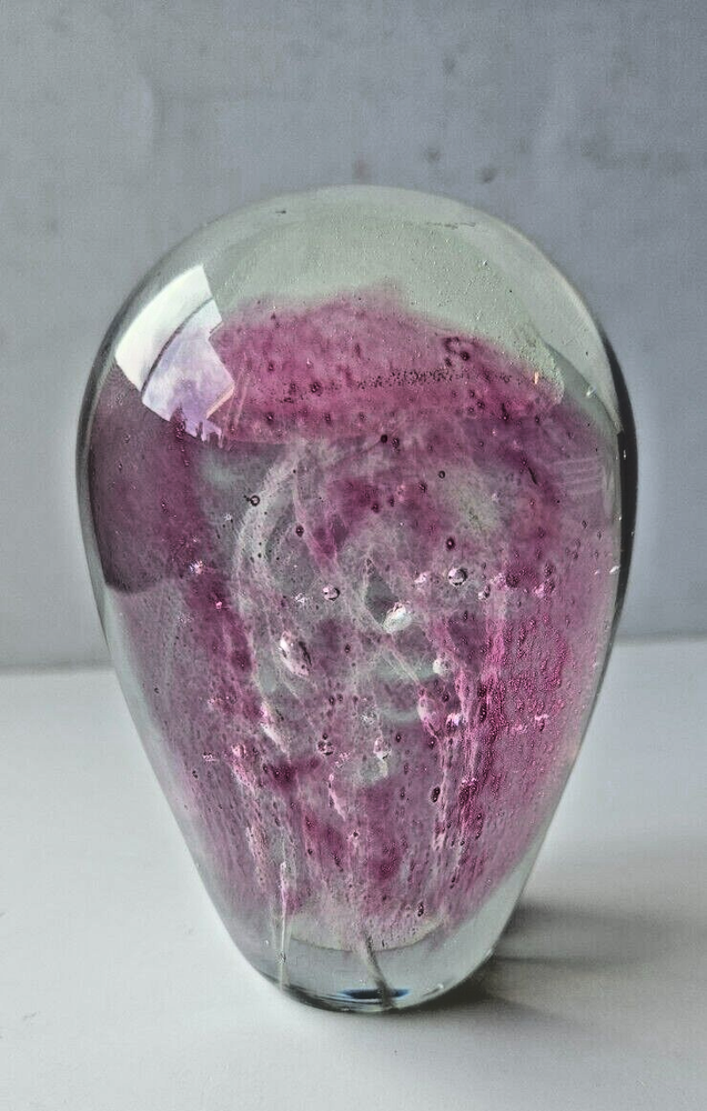 Cosmic Pink Jelly Fish Studio Art Glass Paperweight 4" Egg Shaped. Excellent display item. Small "Flea bite" nick on the bottom but does not effect the visual beauty. See photos for condition and size. Packed and shipped with care.