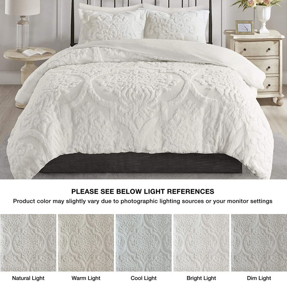 The Viola 3 Piece Tufted Cotton Chenille Damask Comforter Set offers the perfect touch of elegance to your bedroom décor. A damask chenille design is beautifully displayed the 100% cotton face of the white comforter, while matching shams complement the top of the bed for stunning blend of shabby chic and traditional styles. Naturally breathable and lightweight cotton fabric paired with a perfect all season bedding. Set includes: 1 Comforter: 104"W x 92"L, 2 King Shams: 20"W x 36"L Care instructions: Machine wash cold, gentle cycle, and separately. Do not bleach. Tumble dry low, remove promptly. Do not iron. Spot clean pillows. If there is no free movement in the washer or dryer, use large capacity commercial washer/dryer.