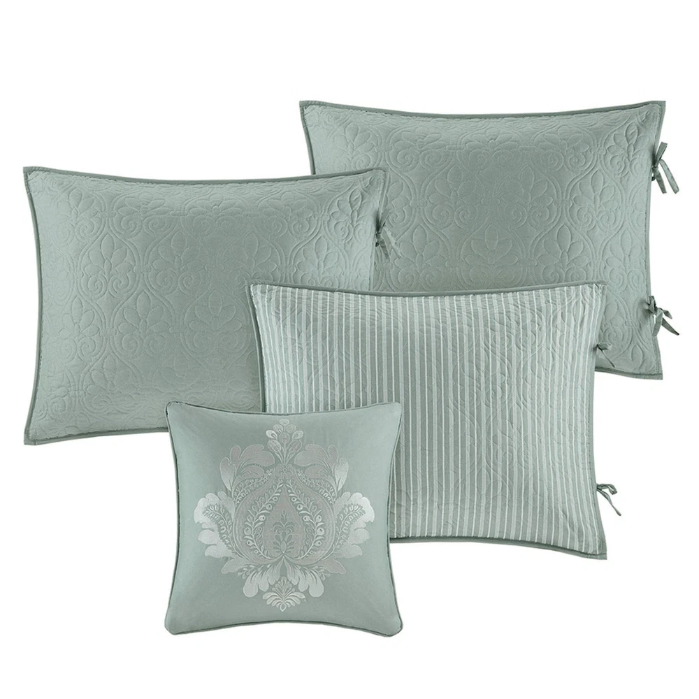 Quilted ogee Daybed Set Includes: daybed cover, 3 reversible shams, bedskirt, dec pillow Daybed Cover/Sham: 100% polyester solid face and brushed microfiber print back, 240g/m2 90% cotton, 10% polyester Bedskirt: 100% polyester printed, 100% polyester platform Pillows: 100% polyester shell, polyester fill 1 Daybed Cover:75x39" 3 Standard Shams:20x26" (3) 1 Bedskirt:39x75+15" 1 Decorative Pillow:16x16" MACHINE WASH COLD, GENTLE CYCLE, AND SEPARATELY. DO NOT BLEACH. TUMBLE DRY LOW, REMOVE PROMPTLY, DO NOT IRON. IF THERE IS NO FREE MOVEMENT IN THE WASHER OR DRYER, USE LARGE CAPACITY COMMERCIAL WASHER/DRYER.