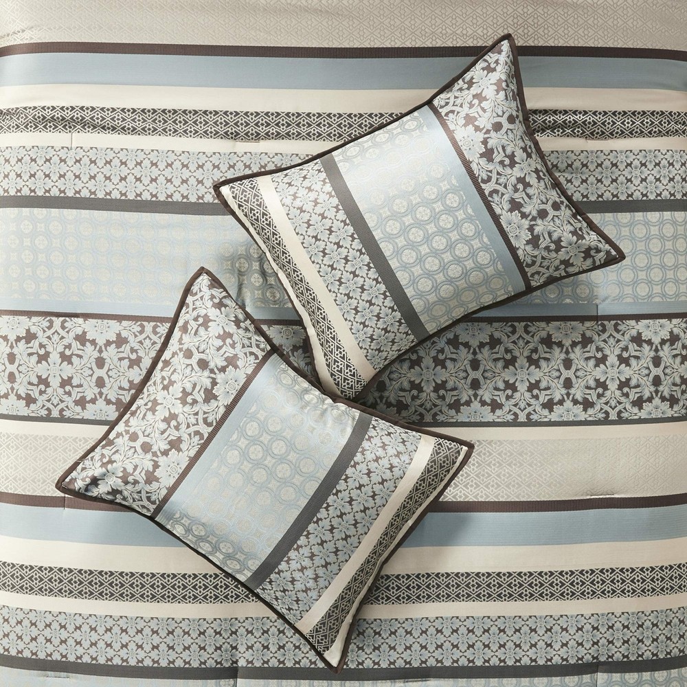 To add a touch of richness to your current décor, the 7 Piece Princton Comforter Set offers a luxurious update to your room PRINCETON creates character with intricate geometric and damask prints in a mix of subtle color creating a beautiful contrast. Jacquard fabric comes with a natural sheen creating a lustrous and luxurious design Set includes: 1 Comforter: 90"W x 90"L, 1 Bed Skirt: 60"W x 80"L + 15"D, 3 Decorative Pillows: 18"W x 18"L/16"W x 16"L/12"W x 18"L, 2 Standard Shams: 20"W x 26"L + 0.5"D Care instructions: Machine wash cold, gentle cycle, and separately. Do not bleach. Tumble dry low, remove promptly. Do not iron. Spot clean pillow. If there is no free movement in the washer or dryer, use large capacity commercial washer/dryer.