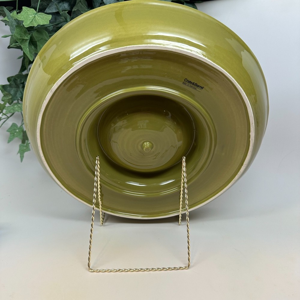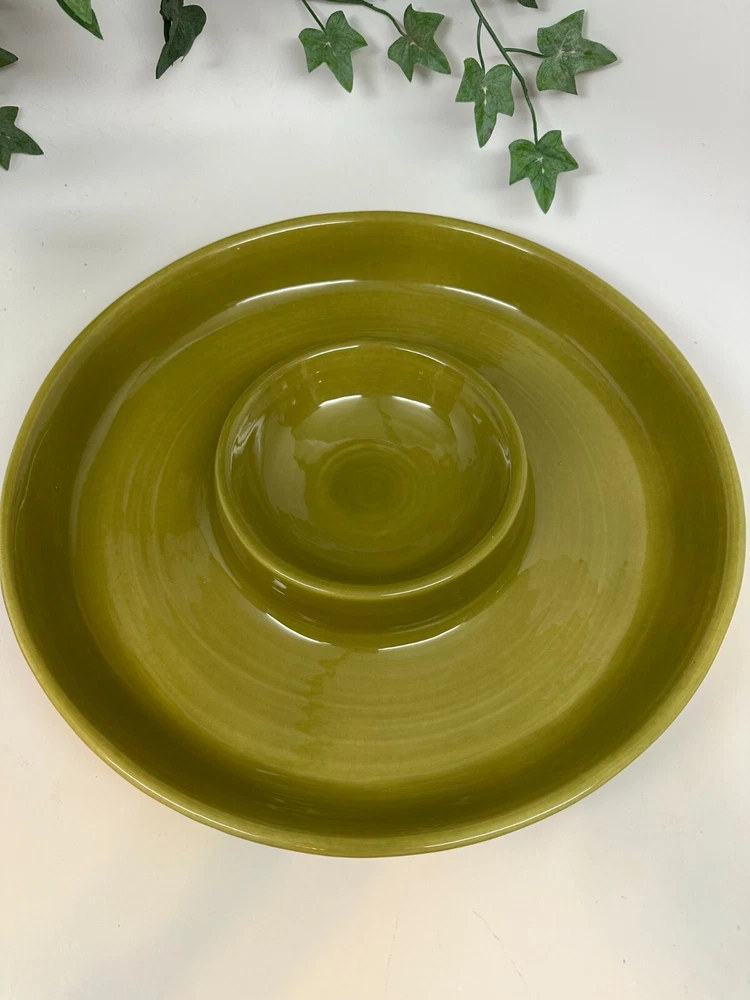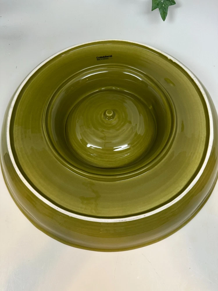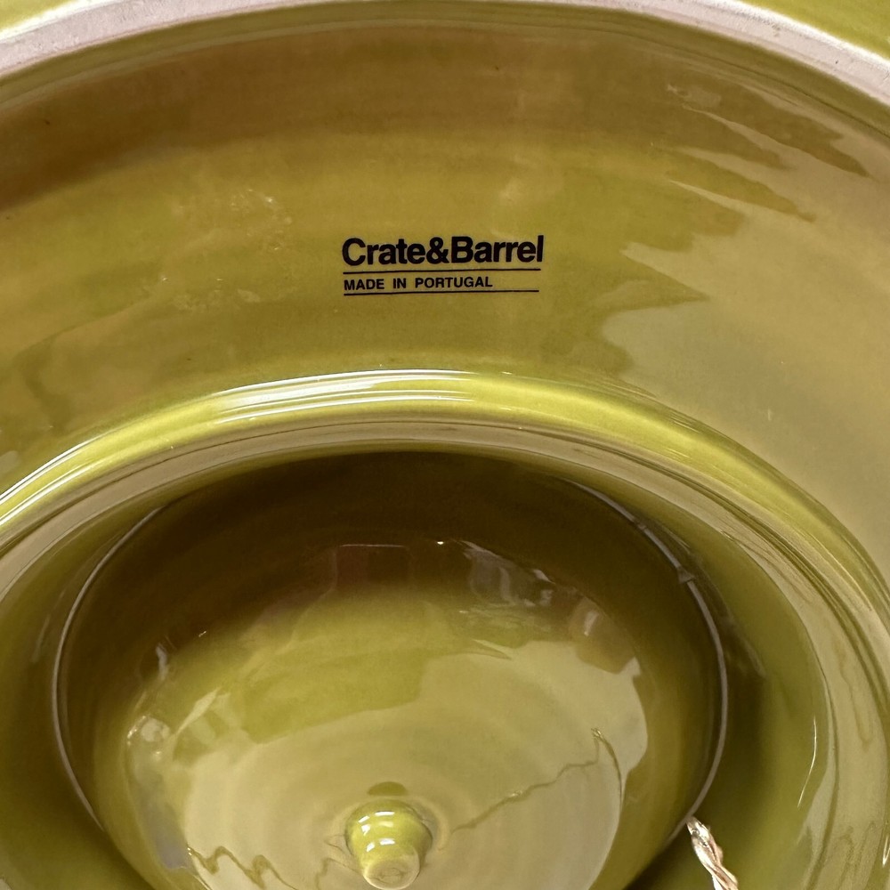 Spice up your next party with this beautiful Crate and Barrel serving bowl. This round ceramic bowl, made in Portugal, is large enough to hold all of your favorite snacks and has a center bowl for dips of your choice or salsa. Measuring approximately 15 inches in diameter, with a 6 1/2" bowl in the center this avocado green platter is sure to catch the eye of your guests. Whether you're hosting a holiday party or a summer barbecue, this bowl is the perfect addition to your dinnerware collection. Don't miss out on the opportunity to add some color and fun to your next gathering! Perfect condition. Looks brand new. From a smoke free home. Feel free to ask any questions. Thanks so much.