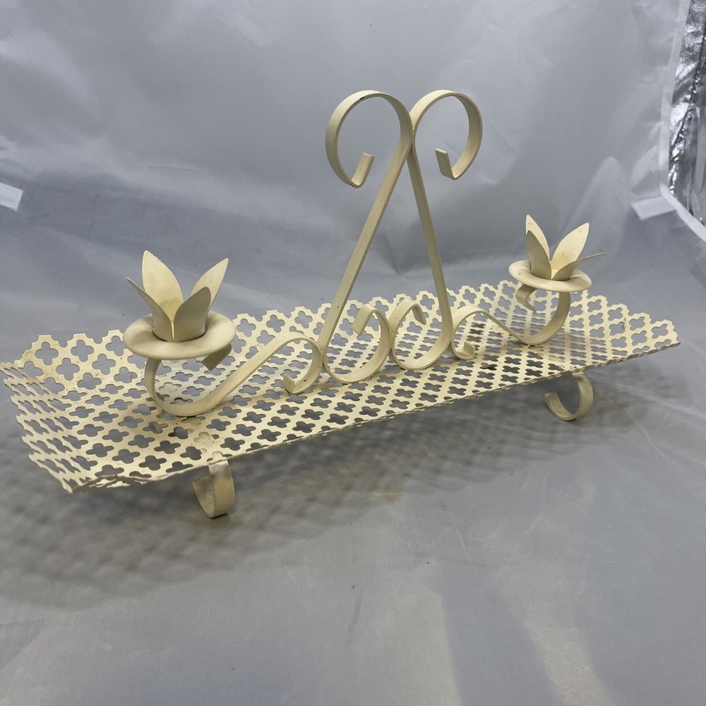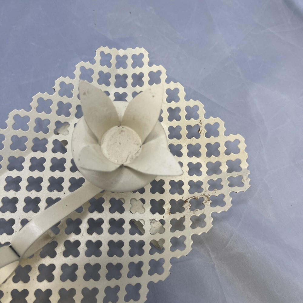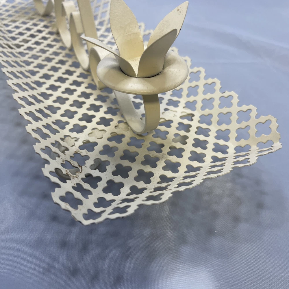 Cracking of paint in one of the candle holders and a few scratches and stains. It’s a nice retro piece as is.