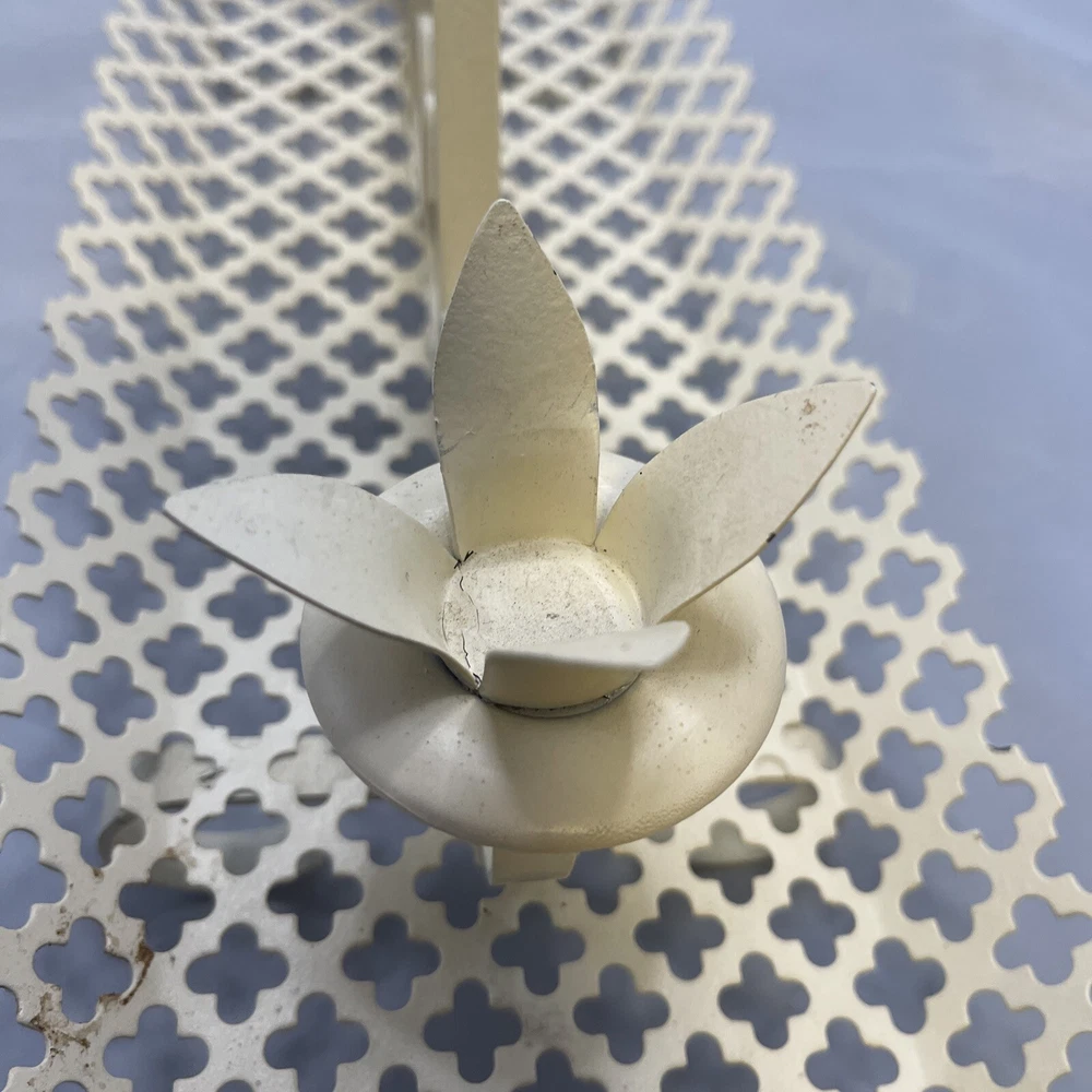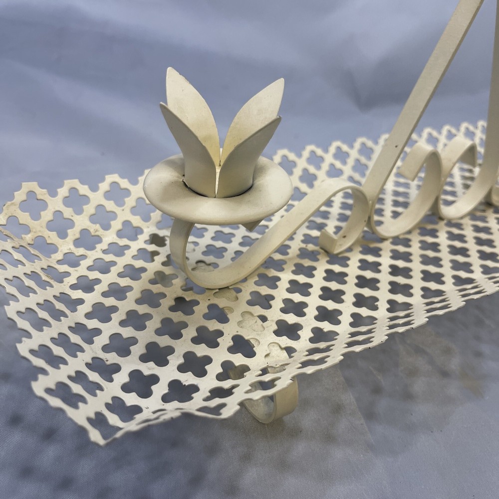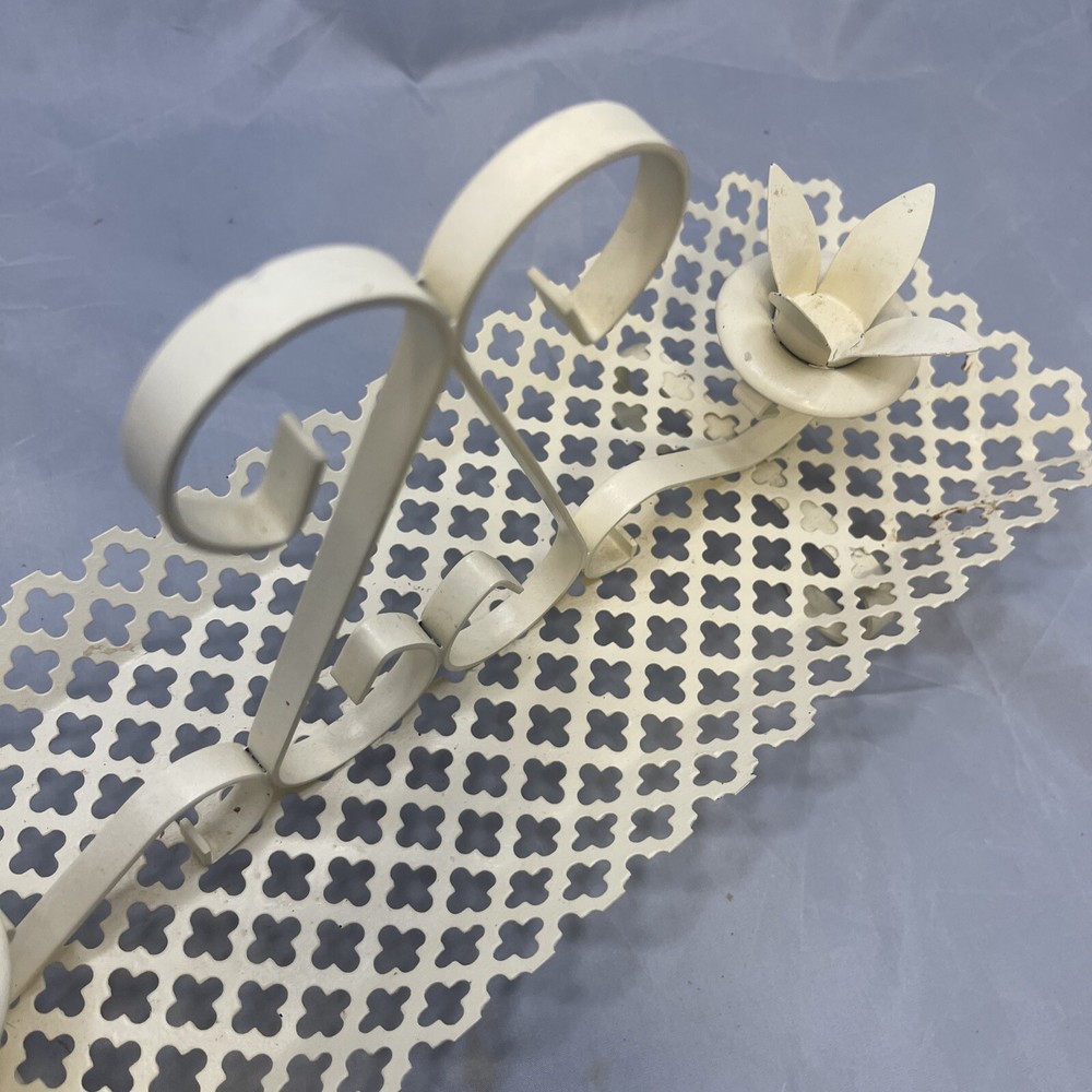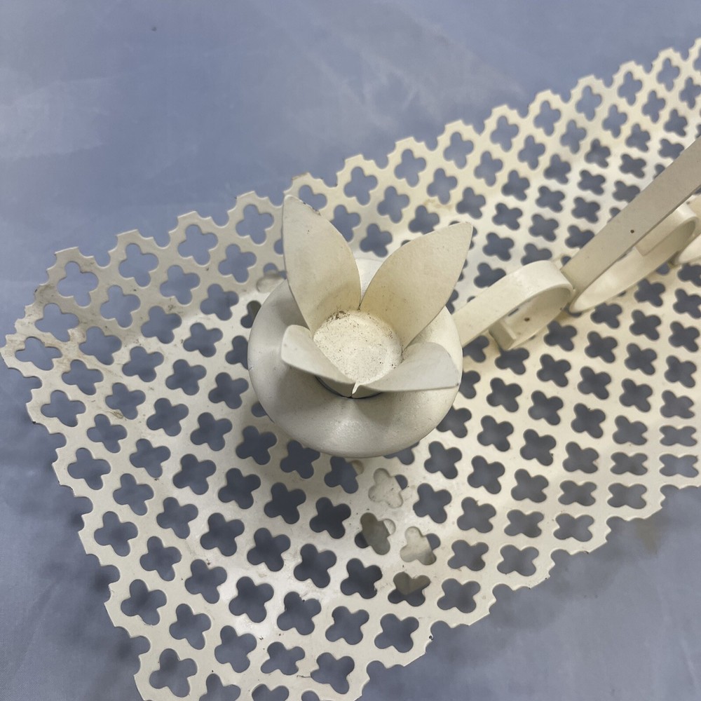 Cracking of paint in one of the candle holders and a few scratches and stains. It’s a nice retro piece as is.