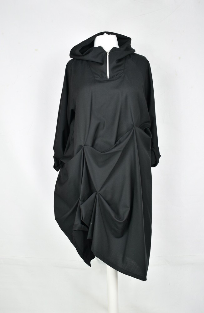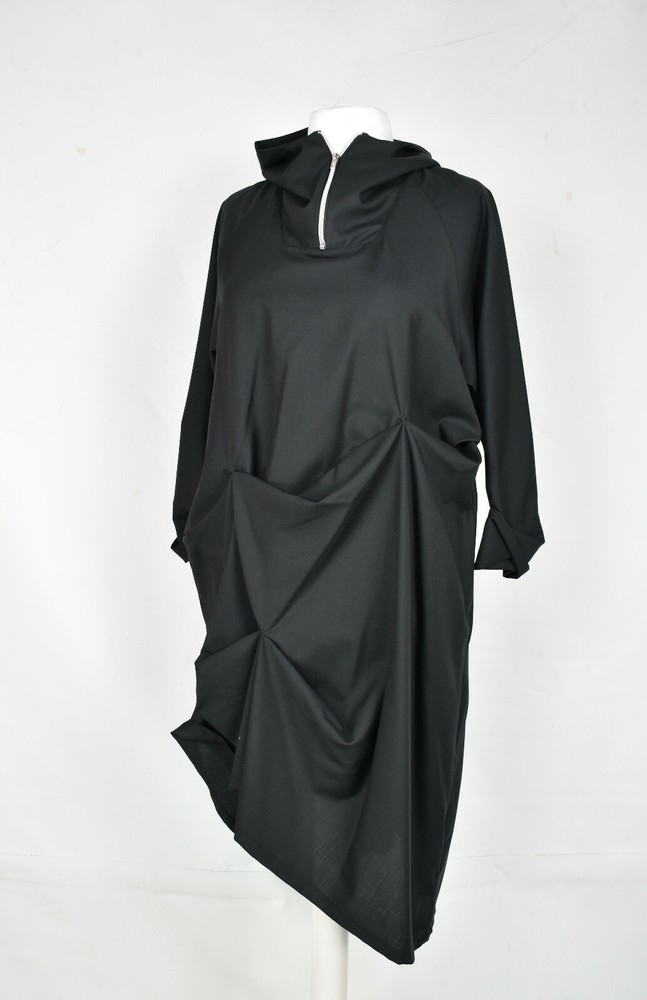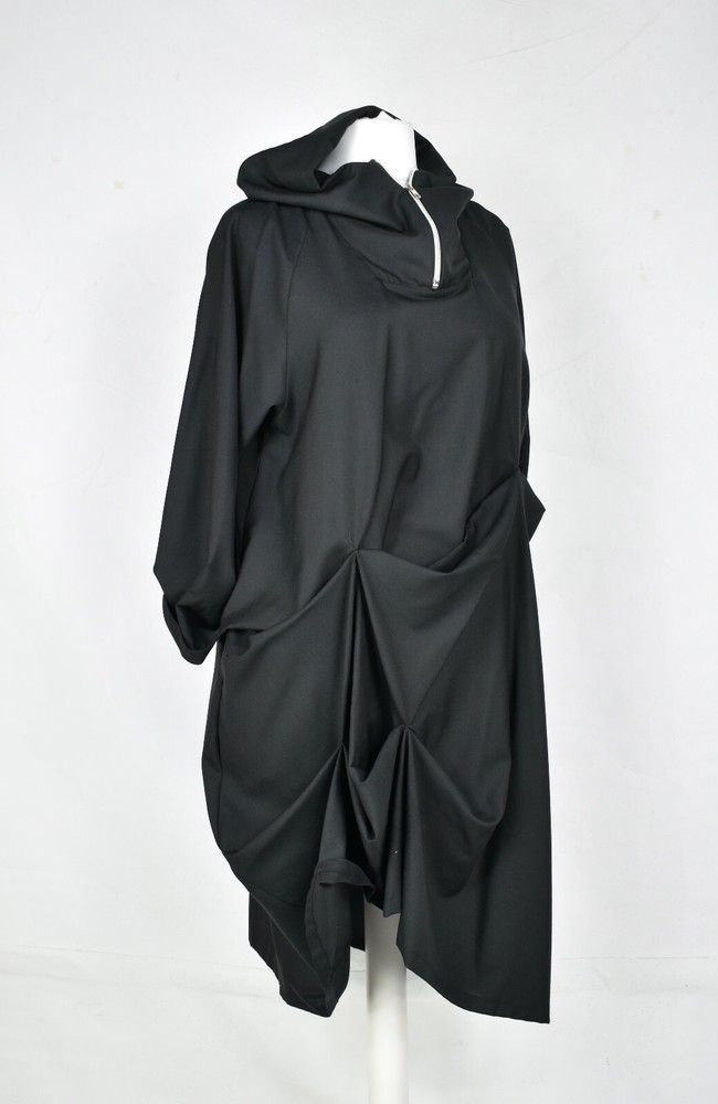 CREARE structured hitched 'More' dip parachute dress fabulous cool wool zip detail to the neckline hitched body absolutely gorgeous concealed side pockets jet black in colour 40% below rrp SIZE: L/XL Length from shoulder to hem measures 48 inch Underarm to underarm measures 24 inch across the front