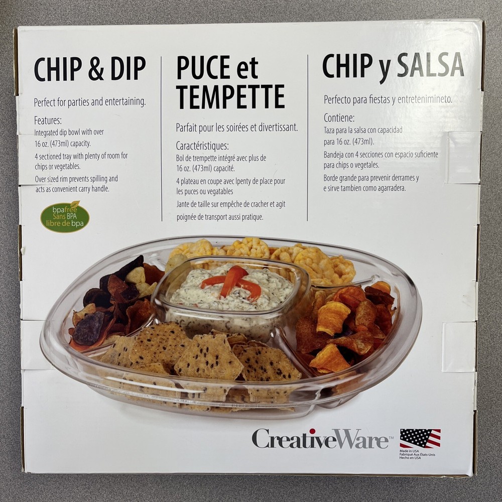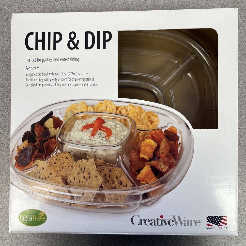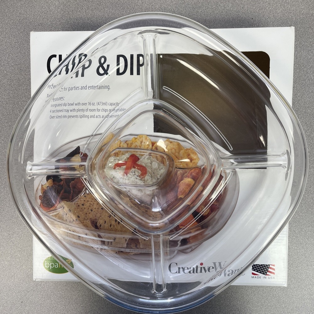 This Creative Ware chip and dip tray is the perfect addition to any party or gathering. With five compartments, you can easily hold all your favorite dips and chips in one convenient location. The square shape and clear color make it a great choice for any occasion, from bachelorette parties to weddings. Measuring 14 inches in both length and width, this tray is made of durable plastic and weighs only 1.25 lbs. It features a clear finish and comes with a unit quantity of one. Whether you're hosting a party or just need a tray for serving chips and dip, this Creative Ware tray is sure to impress.