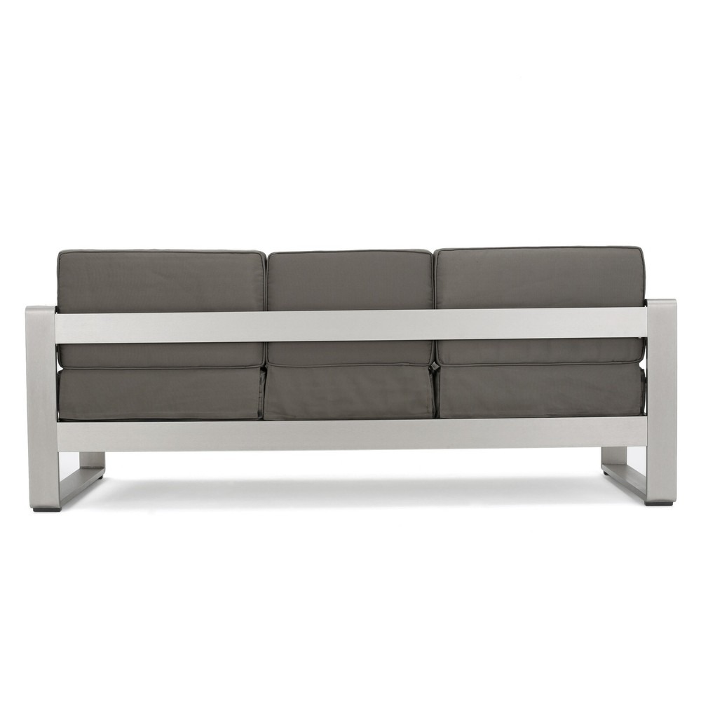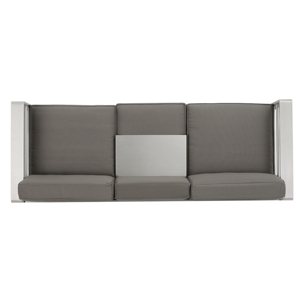 Allow your outdoor space to reflect the same refined, modern design you've chosen for your interior, and use this chic outdoor sofa to complete the look. Made of aluminum, this streamlined seating option is durable and high-quality. A removable tray insert gives you the option of converting from a loveseat with a table to a three-seater sofa, and water-resistant cushions give you all the comfort you need for maximum relaxation. Relax, kick back, let your worries melt away from the comfort of this chic sofa.e. MODERN DESIGN: With clean, precise lines, our convertible sofa is the ideal modern accessory for your outdoor space. Finished with a sleek aluminum frame, this sofa not only offers a chic, minimalistic look but also provides incredible structure. CONVERTIBLE: This sofa includes a U-shaped tray insert that you can place over the middle seat, turning the piece into a loveseat with tablespace. When you need your seating back, simply remove the tray. ALUMINUM FRAME: This accessory is built with lightweight aluminum, creating a versatile yet durable frame. This material is rust-resistant which will further extend the life of your product. WATER-RESISTANT CUSHIONS: Our cushions are covered with a non-porous material that makes cleaning any spill a breeze. Please note that these cushions are water-resistant and not waterproof. Please cover when not in use and do not submerge in water. DIMENSIONS: Choose an accessory that is the perfect size for you and your furniture. This sofa is 76.50" W x 27.50" D x 24.50" H. You will love how much your space can transform with the simple addition of this charming sofa. Includes: One (1) Sofa Frame Material: Aluminum Cushion Material: Water Resistant Fabric Multiple Color Options Assembly Required All Dimensions Exclude Cushion Measurements Dimensions: 27.50 inches deep x 76.25 inches wide x 24.50 inches high Seat Dimensions: 26.75 inches deep x 69.25 inches wide x 10.25 inches high Weight Capacity: 1200 lbs Arm Height: 24.50 inches