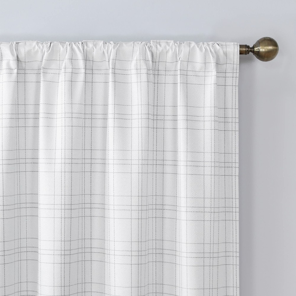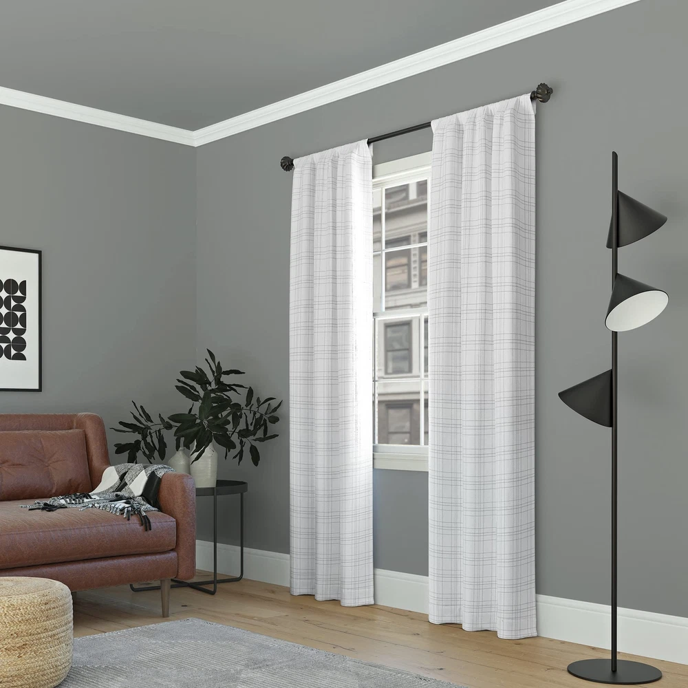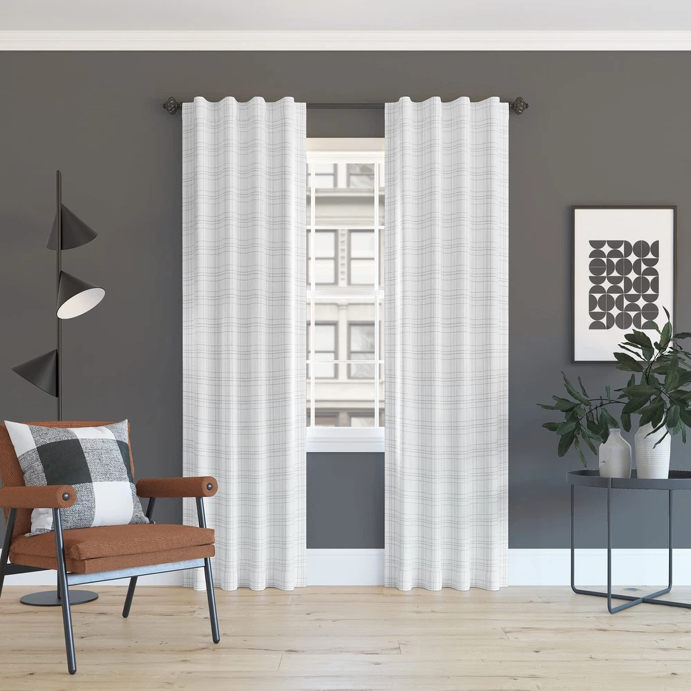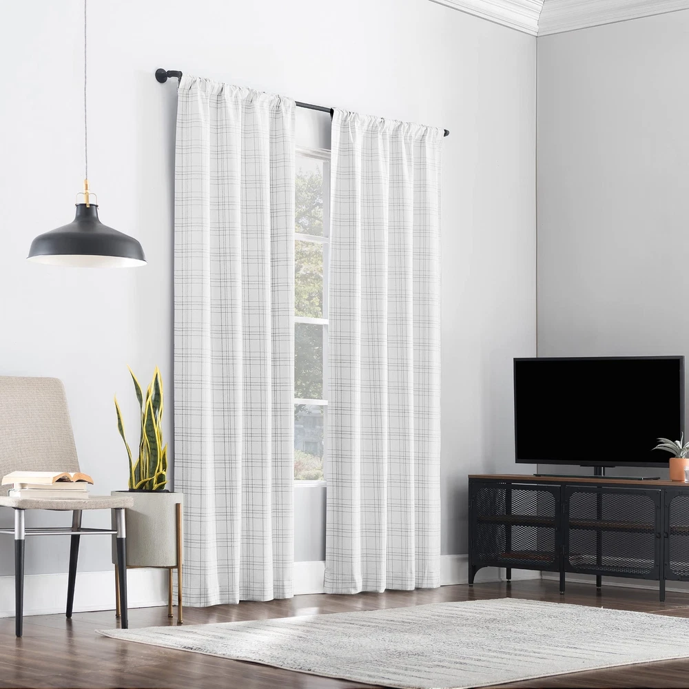 With a casual woven plaid pattern, Crestwood curtains provide the ultimate in light blocking technology to keep out even the harshest of light. Total Blackout technology is laboratory tested to block out 100% of light, reduce outside noise by up to 35%, and decrease energy lost through your windows by up to 35%. Comfort is optimized with thermal properties that help keep summer heat and winter chill out of your home. built-in metal grommets allow for easy slide-through installation on curtain rods up to 1.5" in diameter. Hang in your entertainment room to eliminate screen glare and reduce distracting outside noise, or in your bedroom for enhanced privacy and a sounder, more uninterrupted sleep. Plaid print on heathered texture fabric adds casual warmth to your space Thermal Total Blackout technology blocks out 100% of outside light Thermal properties help keep summer heat and winter chill out of your home Noise reduction by up to 40% helps you get a sounder, more uninterrupted sleep Built-in metal grommets fit curtain rods up to 1 ½" in diameter