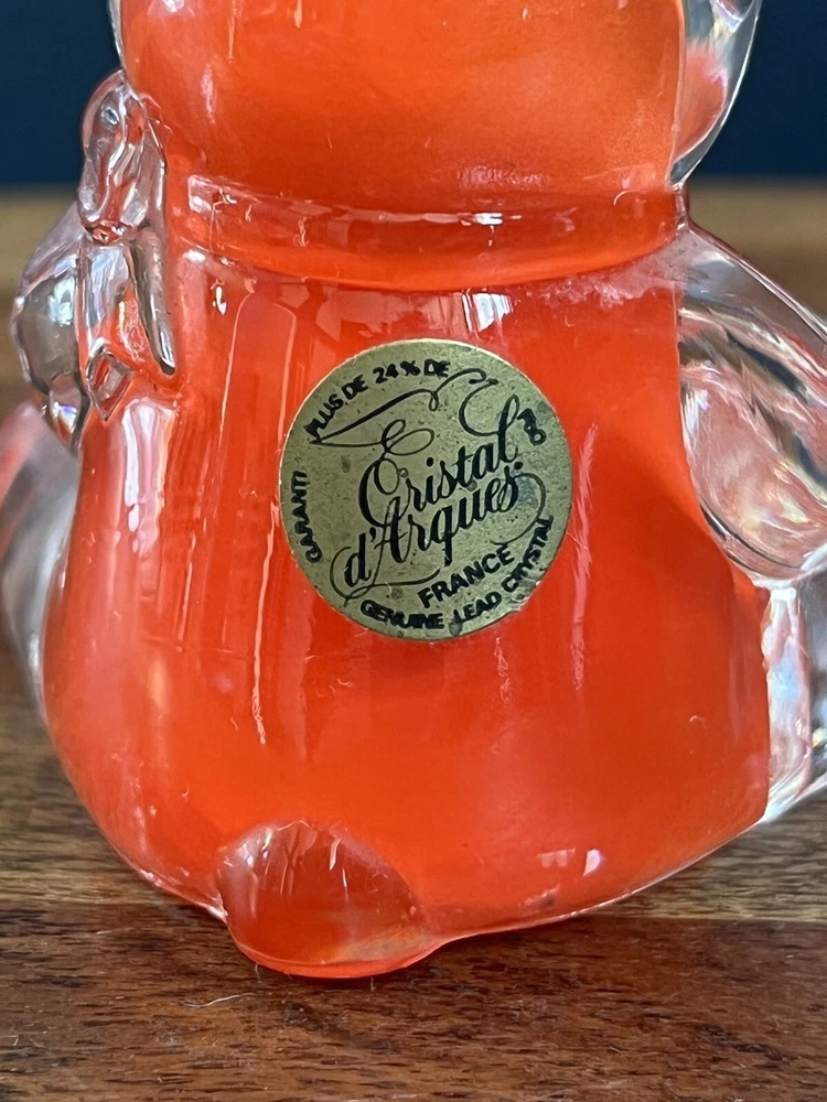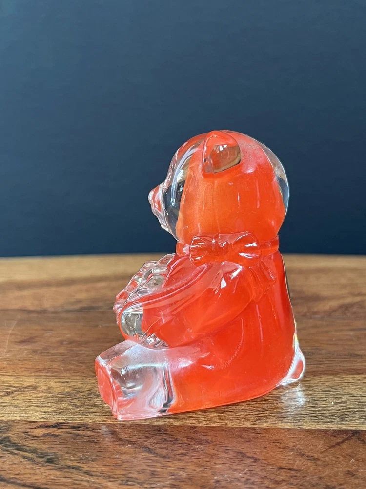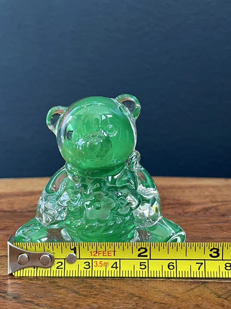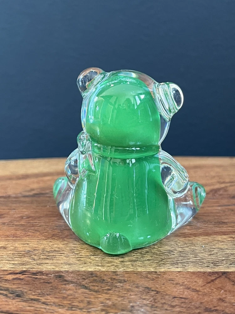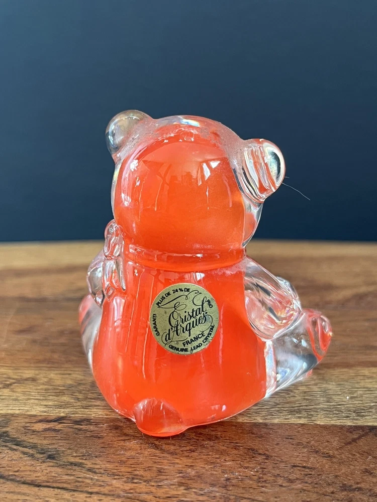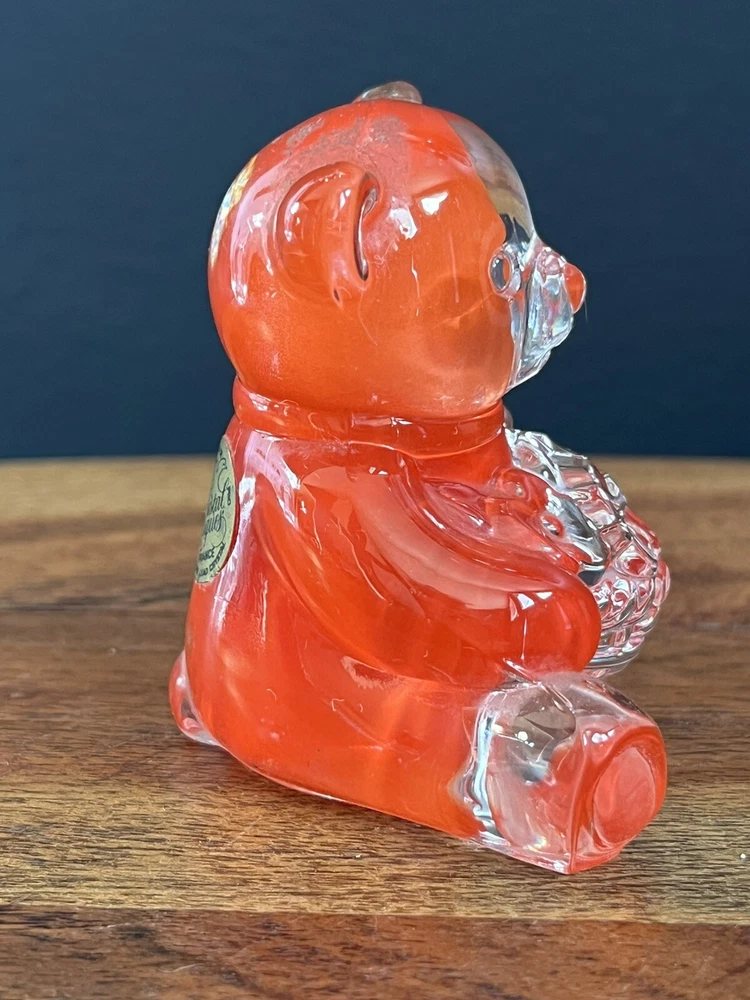 This pair of beautiful paperweights is a unique addition to your collection. Crafted by Cristal d'Arque in France, these colorful teddy bear shaped paperweights feature a beautiful green and orange floral basket. French made with high-quality crystal, this vintage piece is perfect for decoration and adds a touch of luxury to any room.