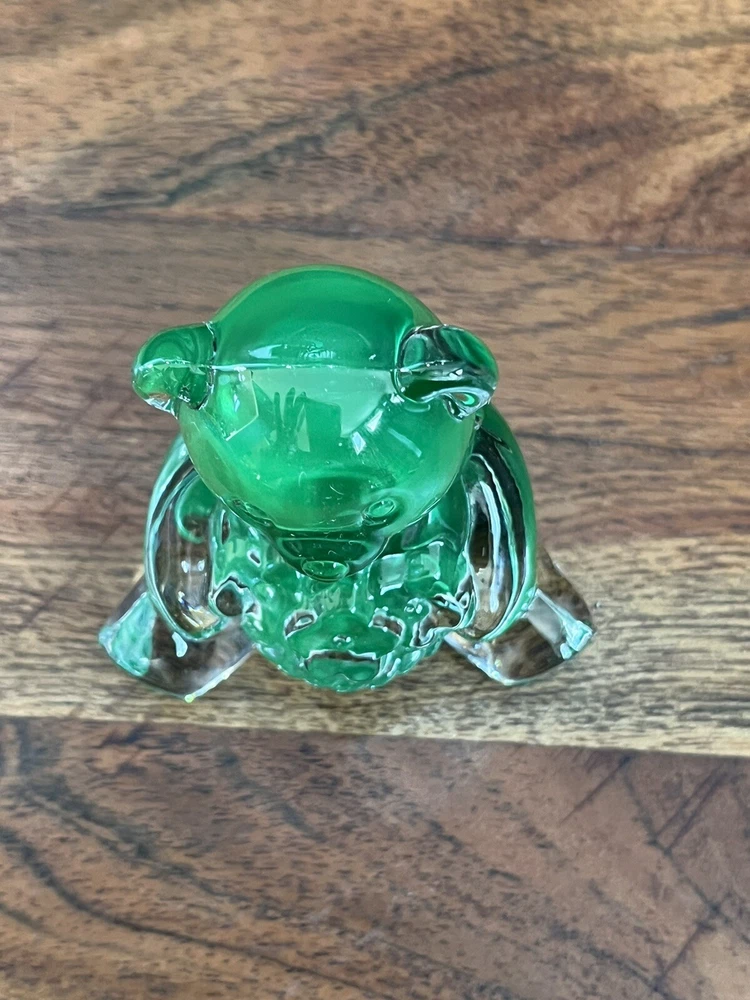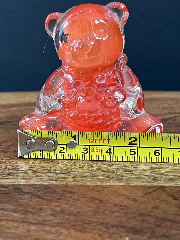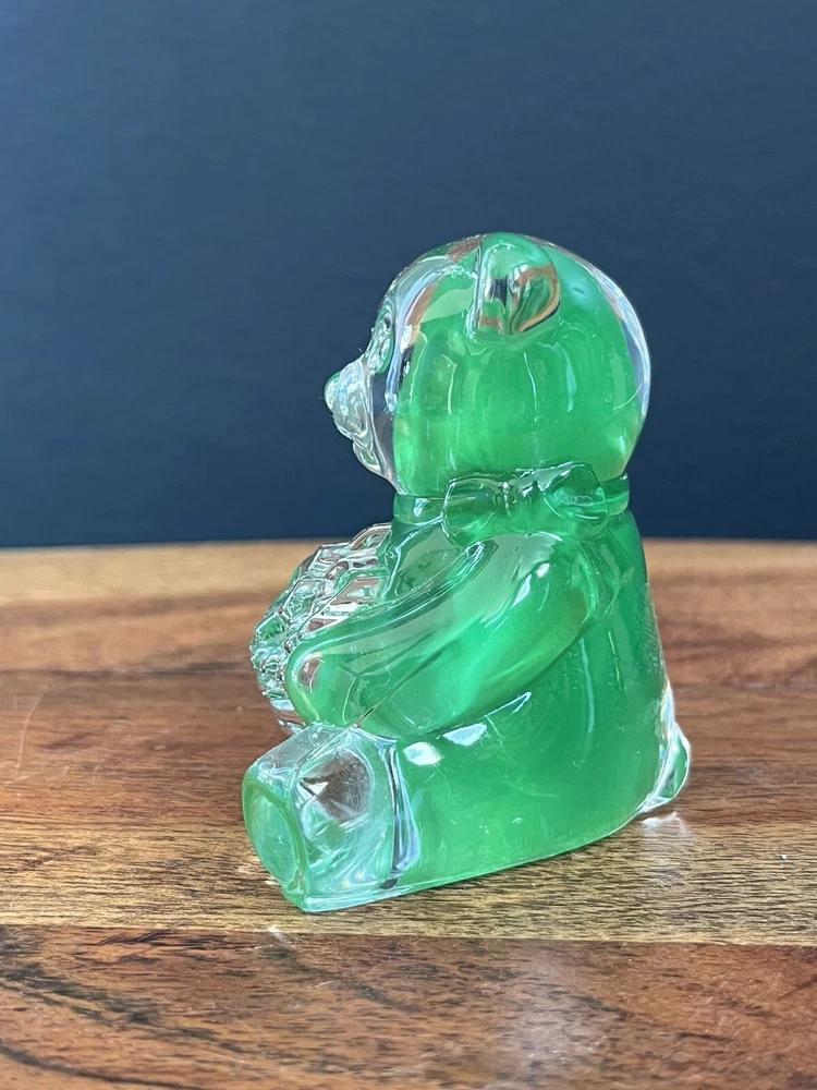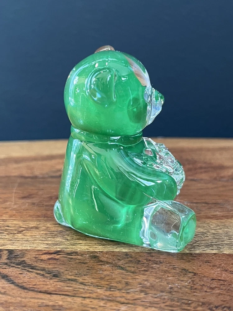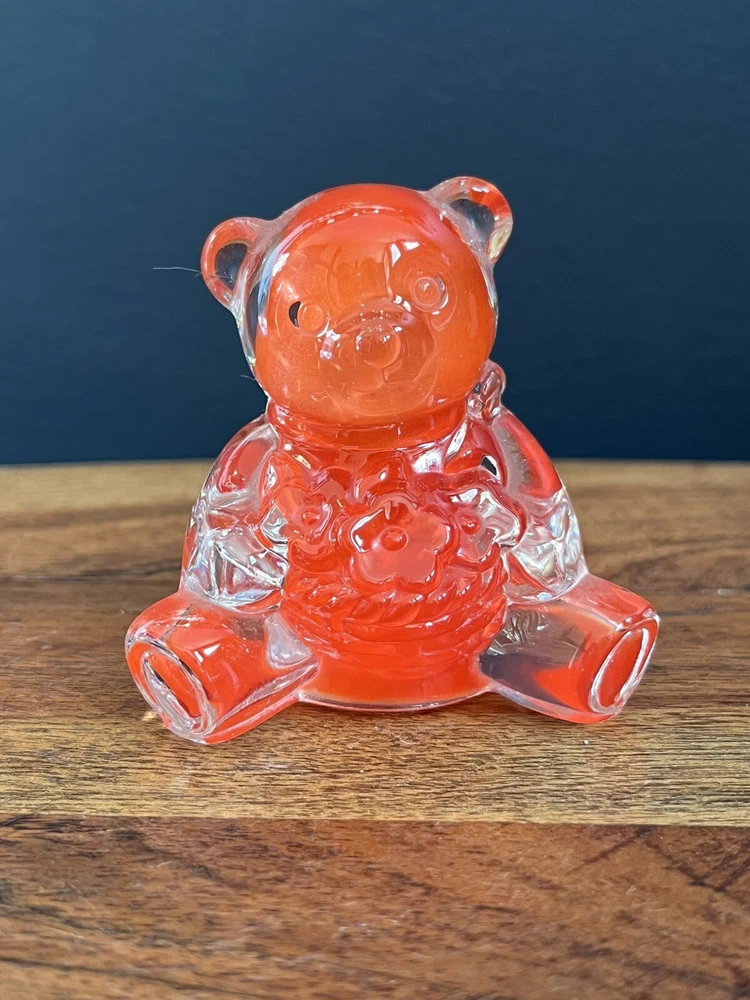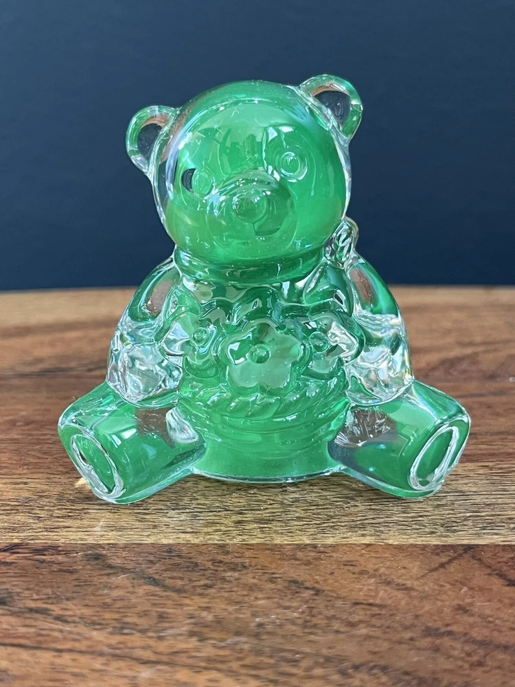 This pair of beautiful paperweights is a unique addition to your collection. Crafted by Cristal d'Arque in France, these colorful teddy bear shaped paperweights feature a beautiful green and orange floral basket. French made with high-quality crystal, this vintage piece is perfect for decoration and adds a touch of luxury to any room.