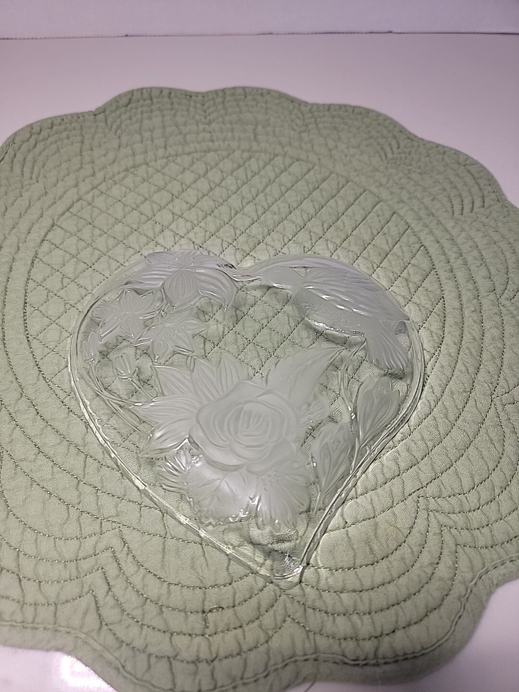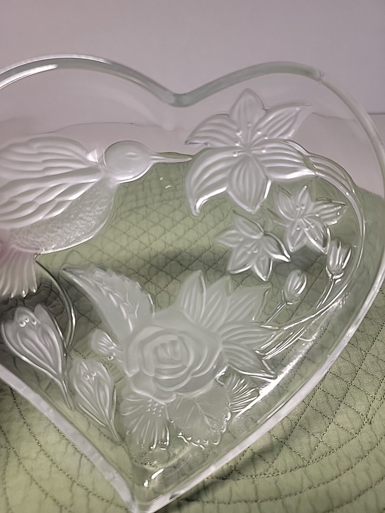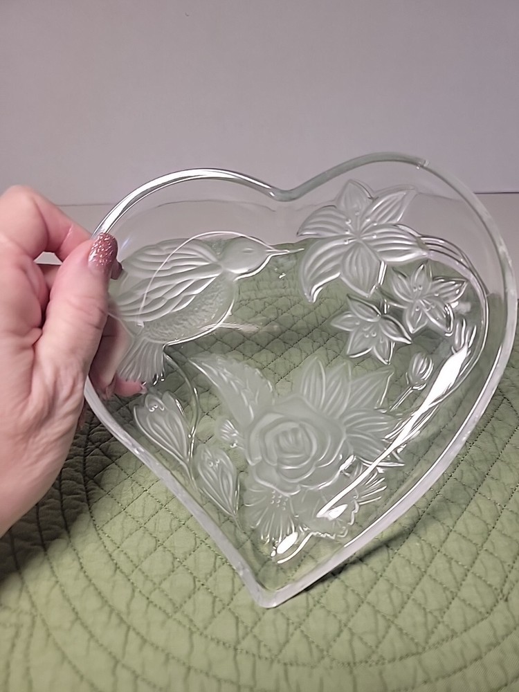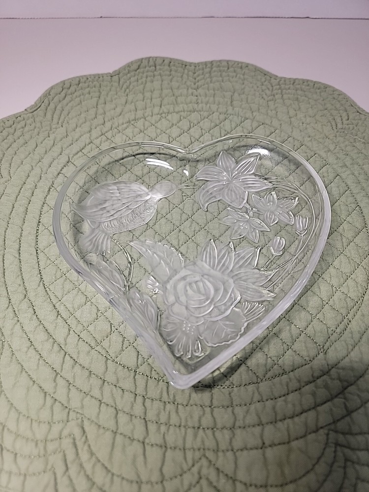 Crystal Clear Studio Serving Dish - Paradise Garden - Hummingbirds 6 1/4". Please see all the pictures. Upon very close inspection, there is a small speck in the glass from production. There are zero nicks or cracks. This is a beautiful and romantic dish. No box included.