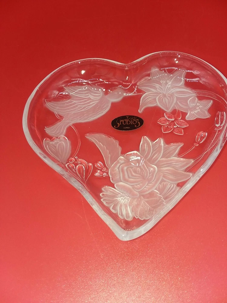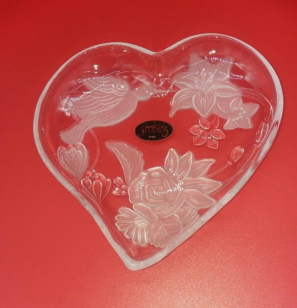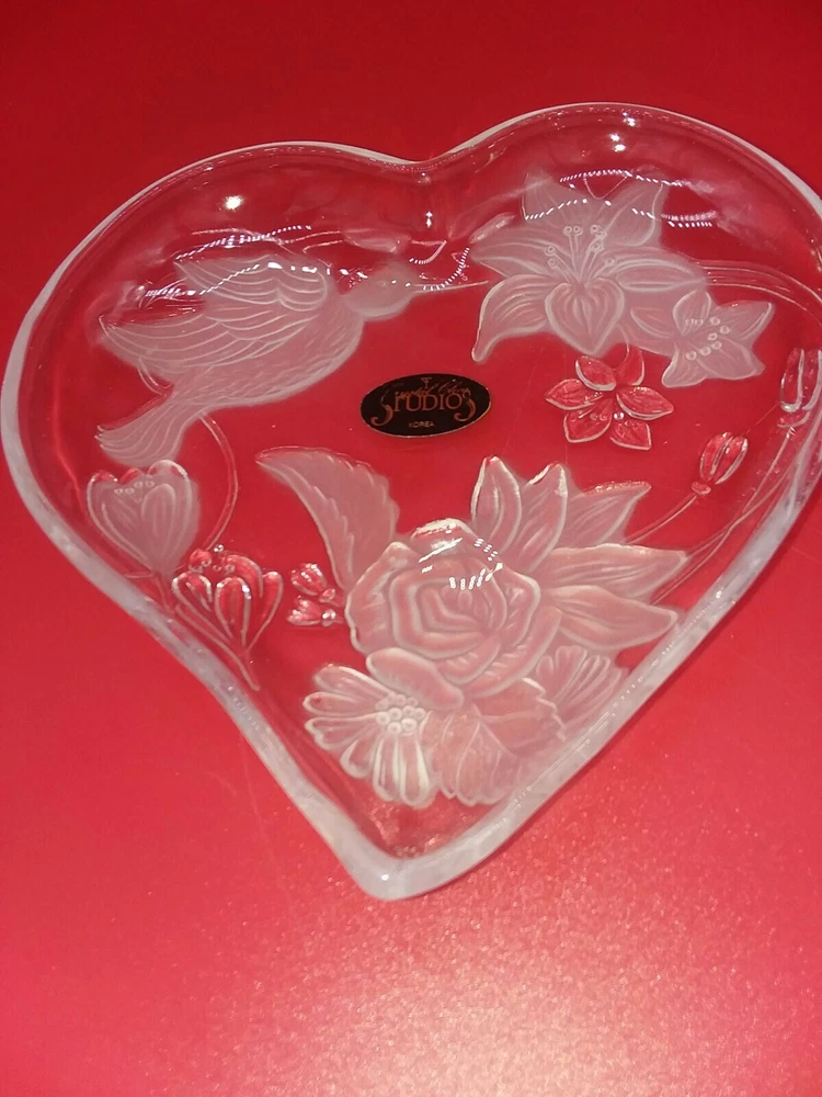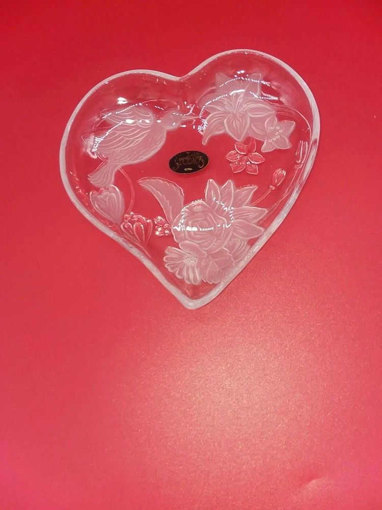Crystal Clear Studios 6" Heart Shaped Etched Hummingbird & Floral Trinket Dish....