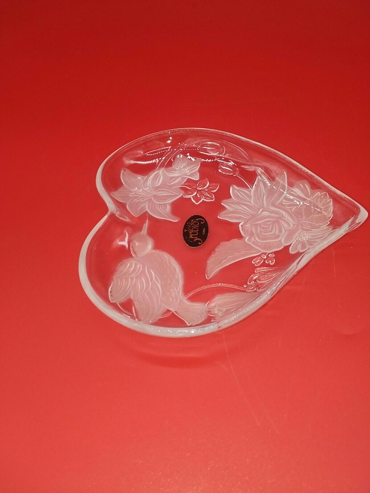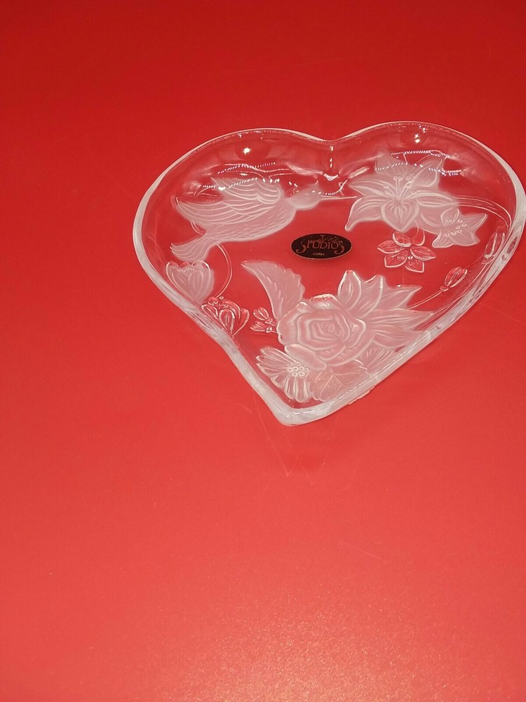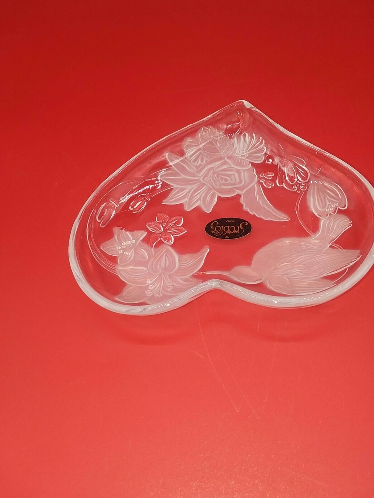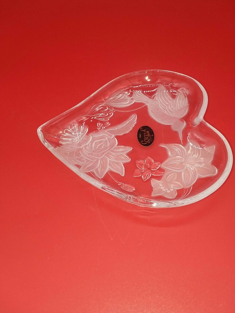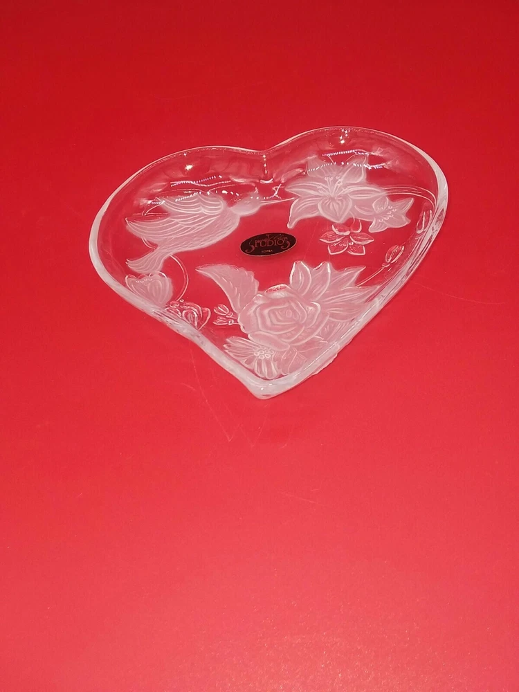 Crystal Clear Studios 6" Heart Shaped Etched Hummingbird & Floral Trinket Dish....