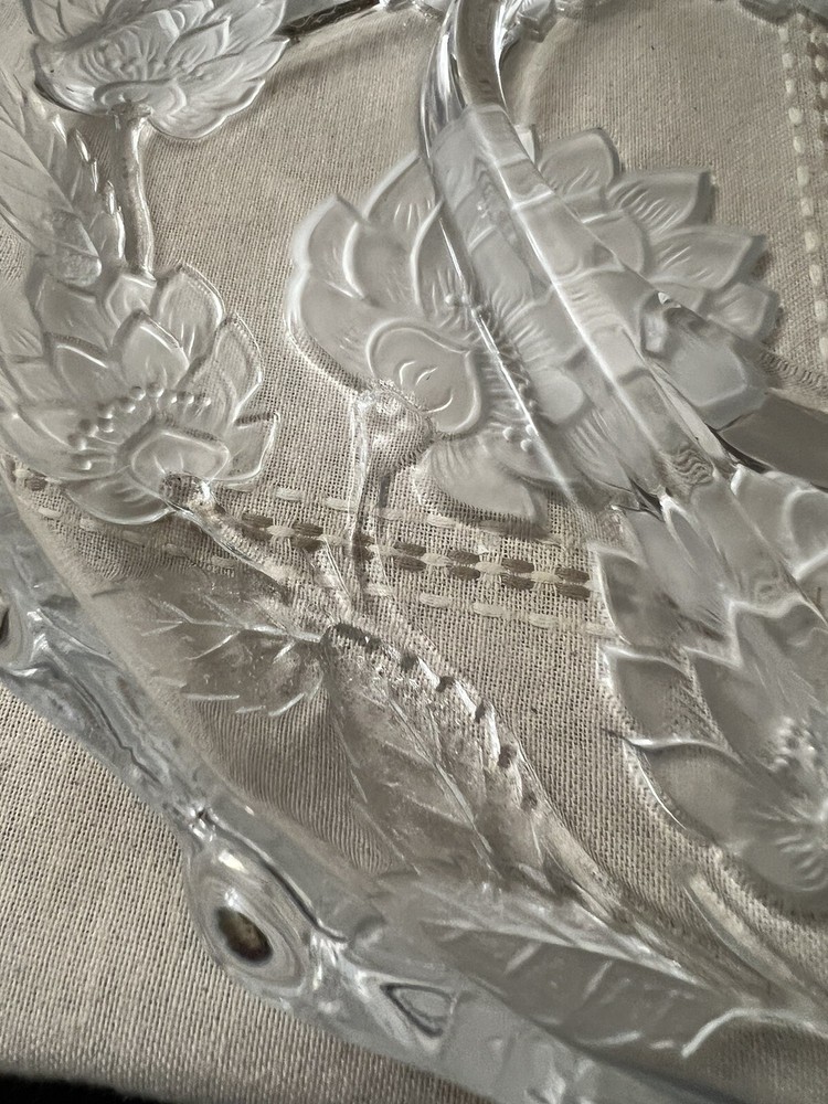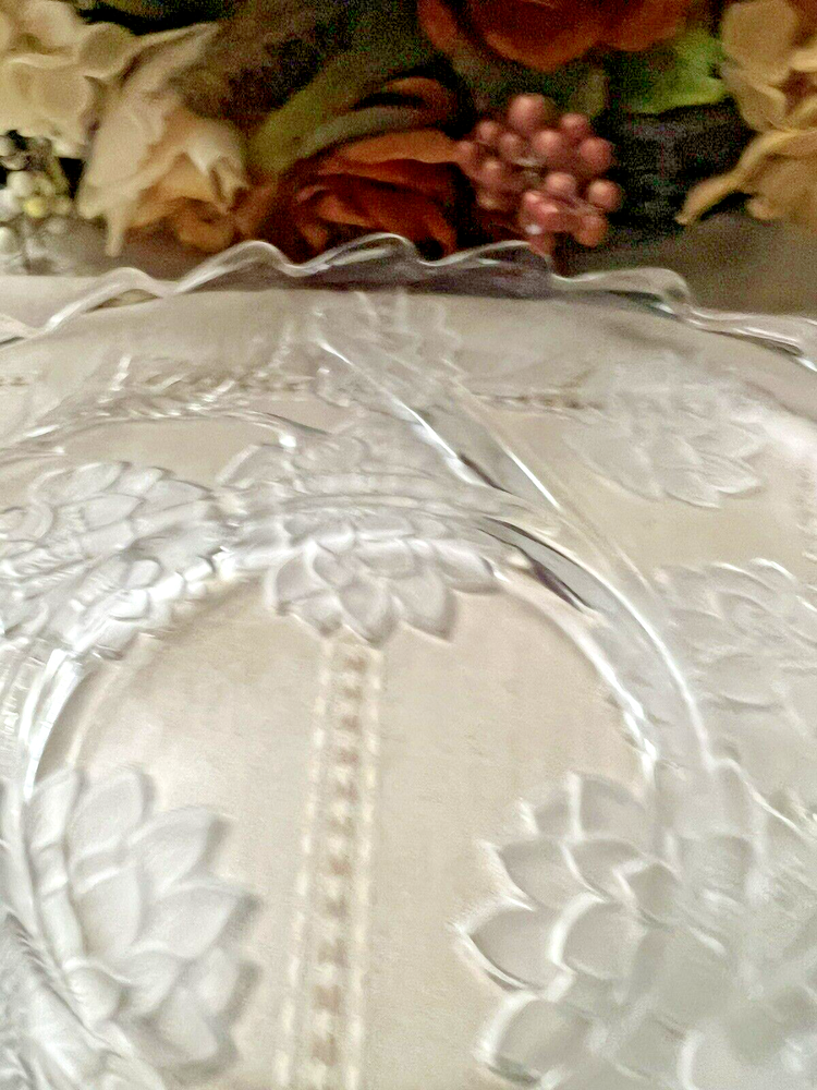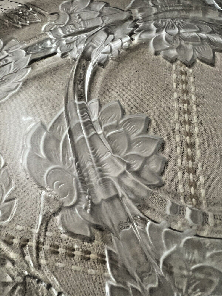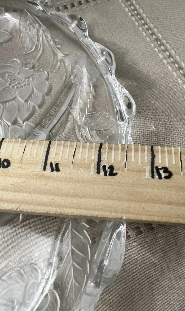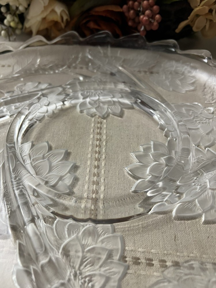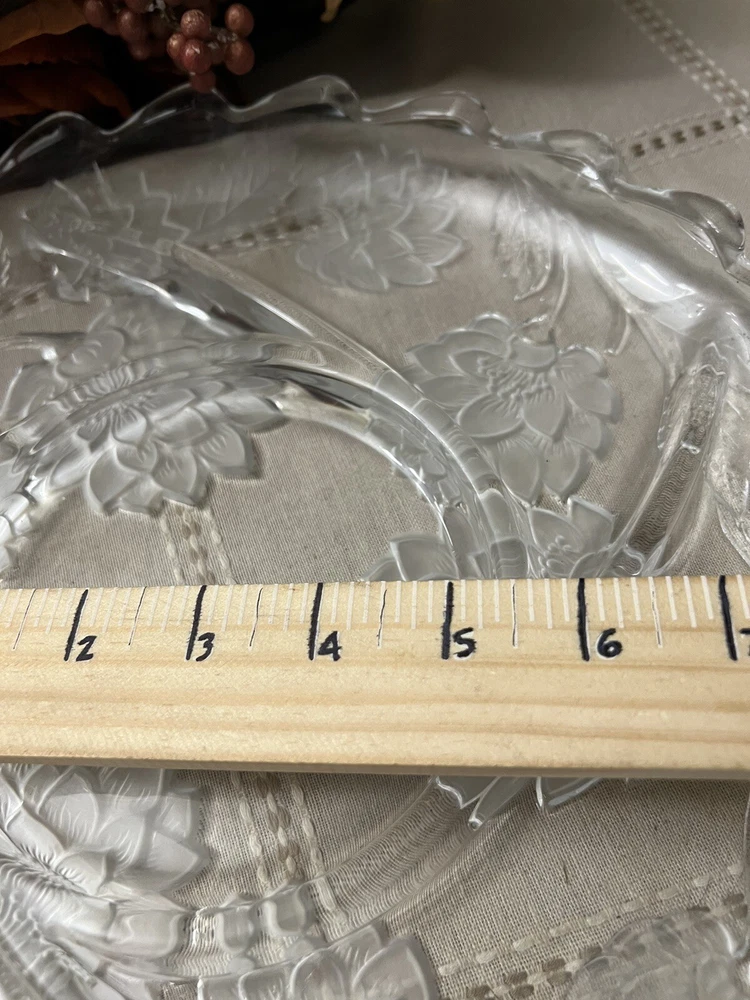 This elegant chip and dip tray is made of high-quality crystal glass and features a beautiful floral design that will enhance the presentation of any party or gathering. Measuring 13 inches in width, it is perfect for serving a variety of snacks and appetizers. Crafted with precision and care, this tray is truly a work of art. It is versatile and can be used for both formal and casual occasions. Its origin is unknown, but its beauty and functionality speak for themselves. Add this stunning crystal glass chip and dip tray to your collection today!