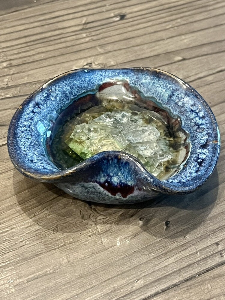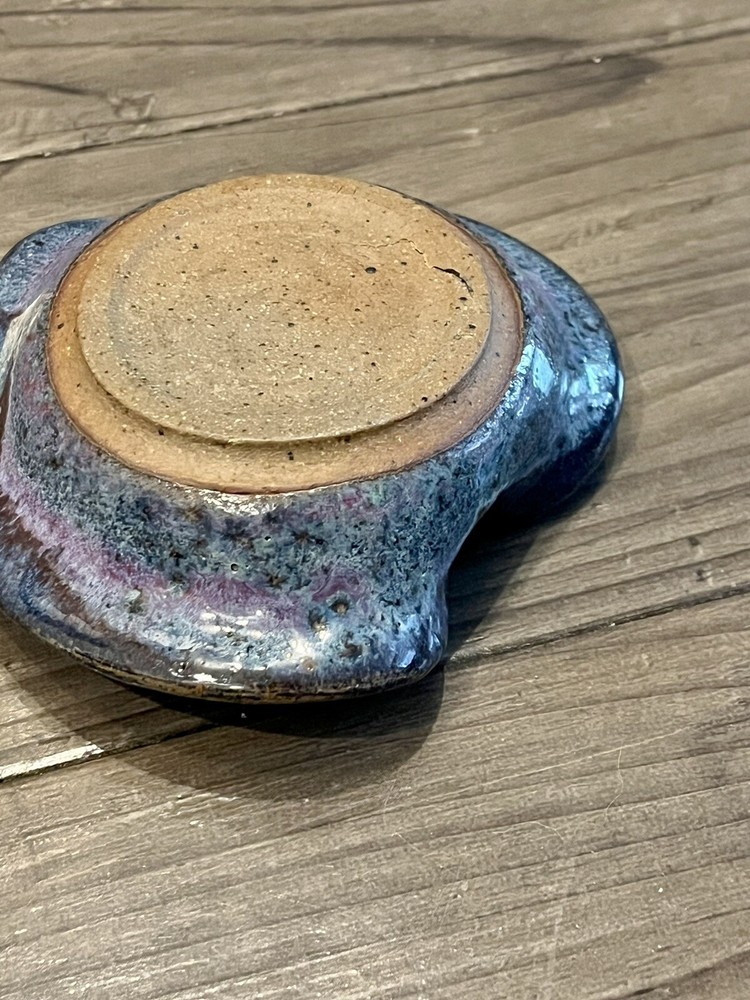 Studio Art Pottery Blue/Crystal Heart Shaped Glazed Trinket Dish Blues Greens. 3.5 by 4 inches. Great gift idea! I make every attempt to use recycled packaging and shipping materials. Cat-free smoke-free household. Feel free to message me if you have any questions.