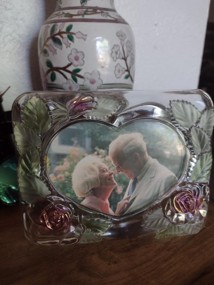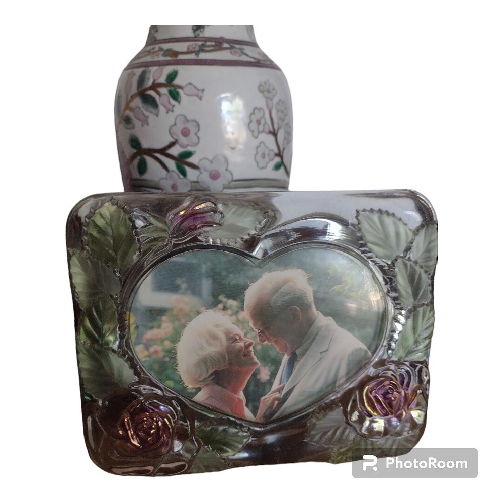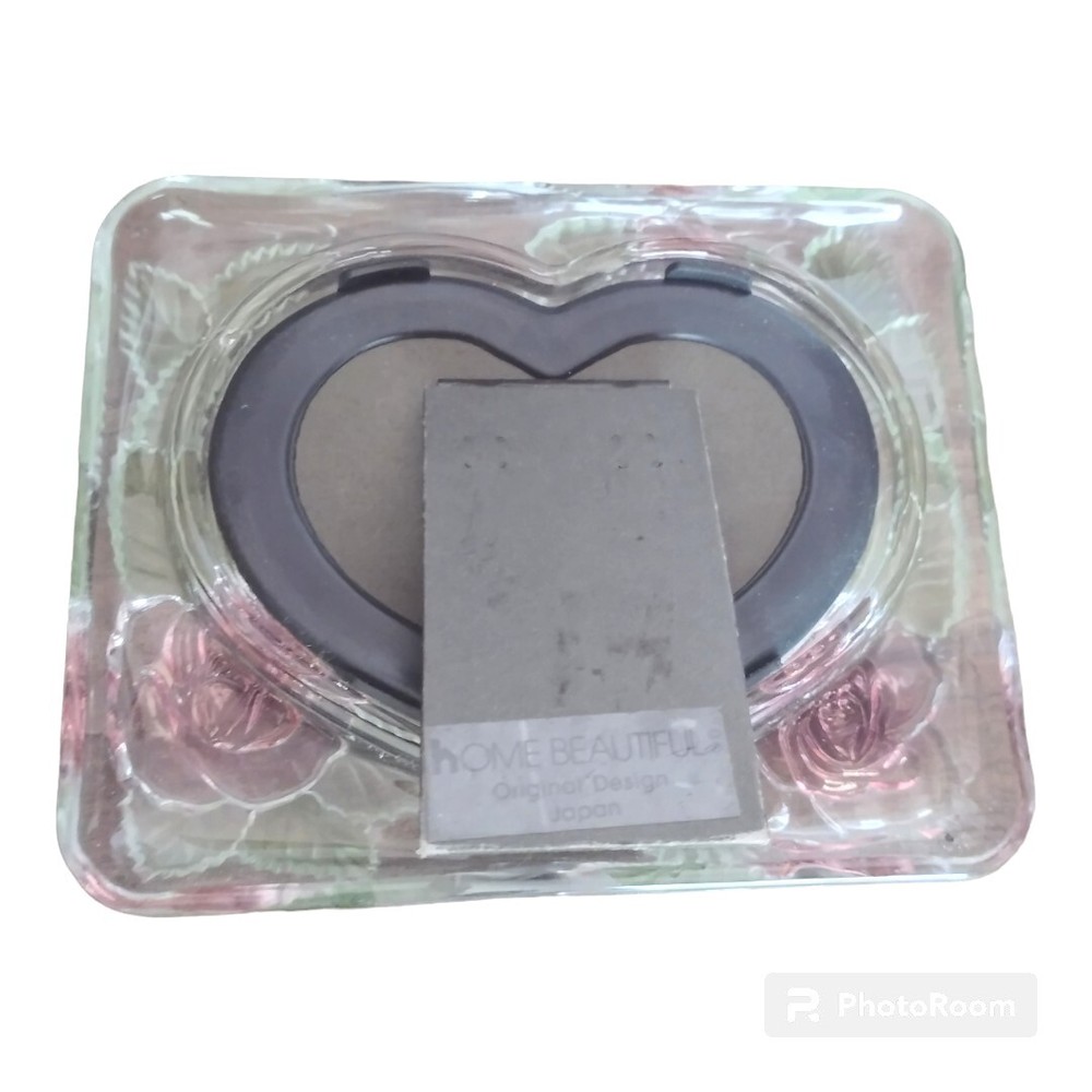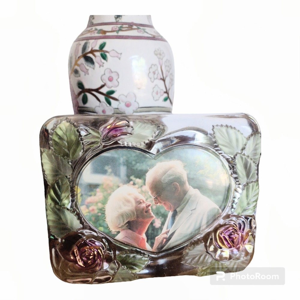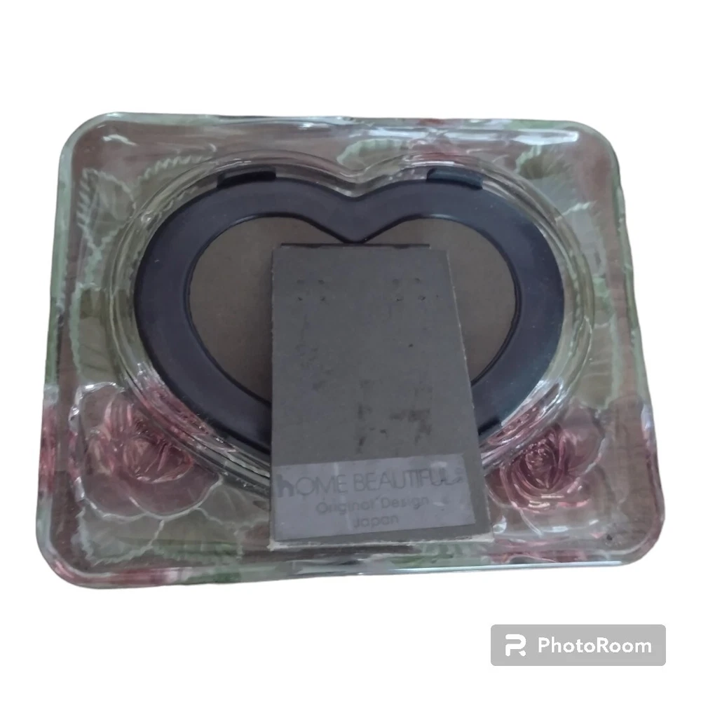 Showcase your cherished memories with this exquisite Crystal Roses Heart Shaped Desk Picture Frame by Home Studio, crafted from high-quality glass. This stunning photo frame is designed in a contemporary style and features a beautiful rose pattern that adds an elegant touch to any room. The frame can hold a 3.5 x 5 inch portrait photo and can be displayed in landscape orientation. Its foldable design makes it easy to store when not in use. The vintage frame is an original piece and was made in Japan. Give your favorite photograph the attention it deserves with this timeless and enchanting Crystal Roses Heart Shaped Desk Picture Frame. New Without Box
