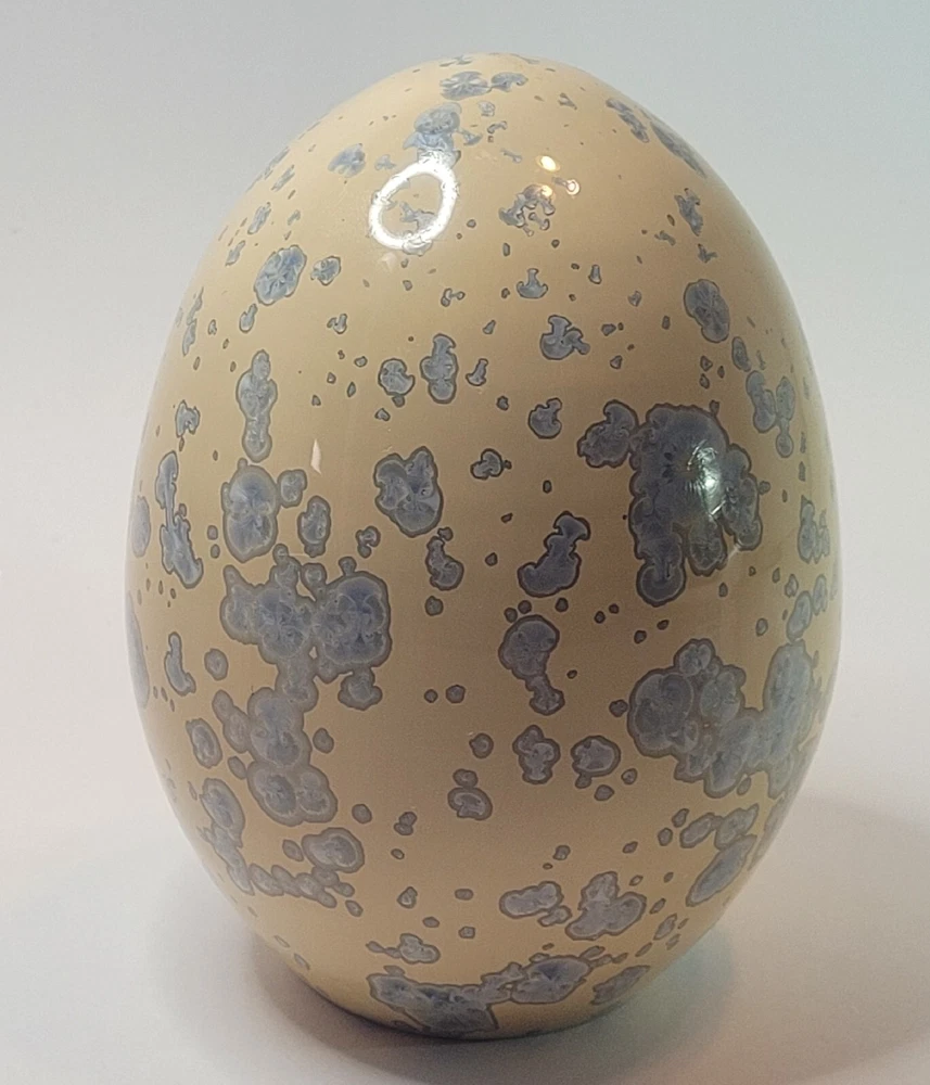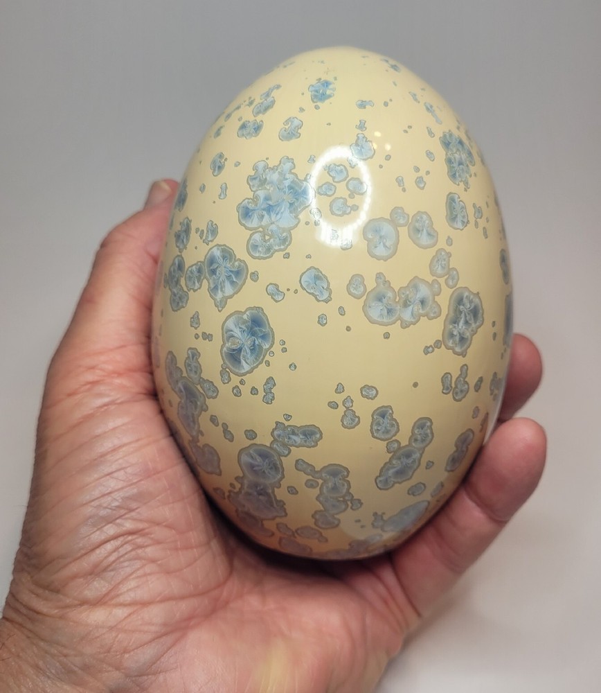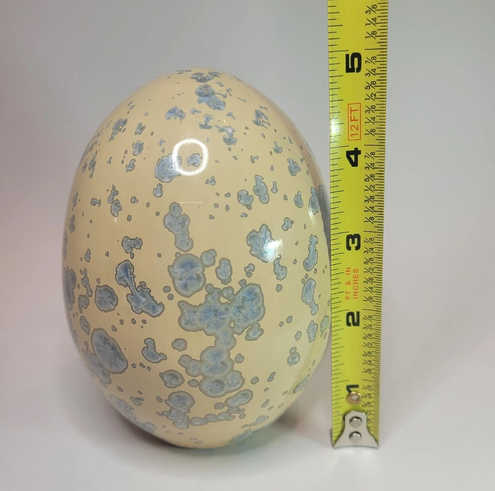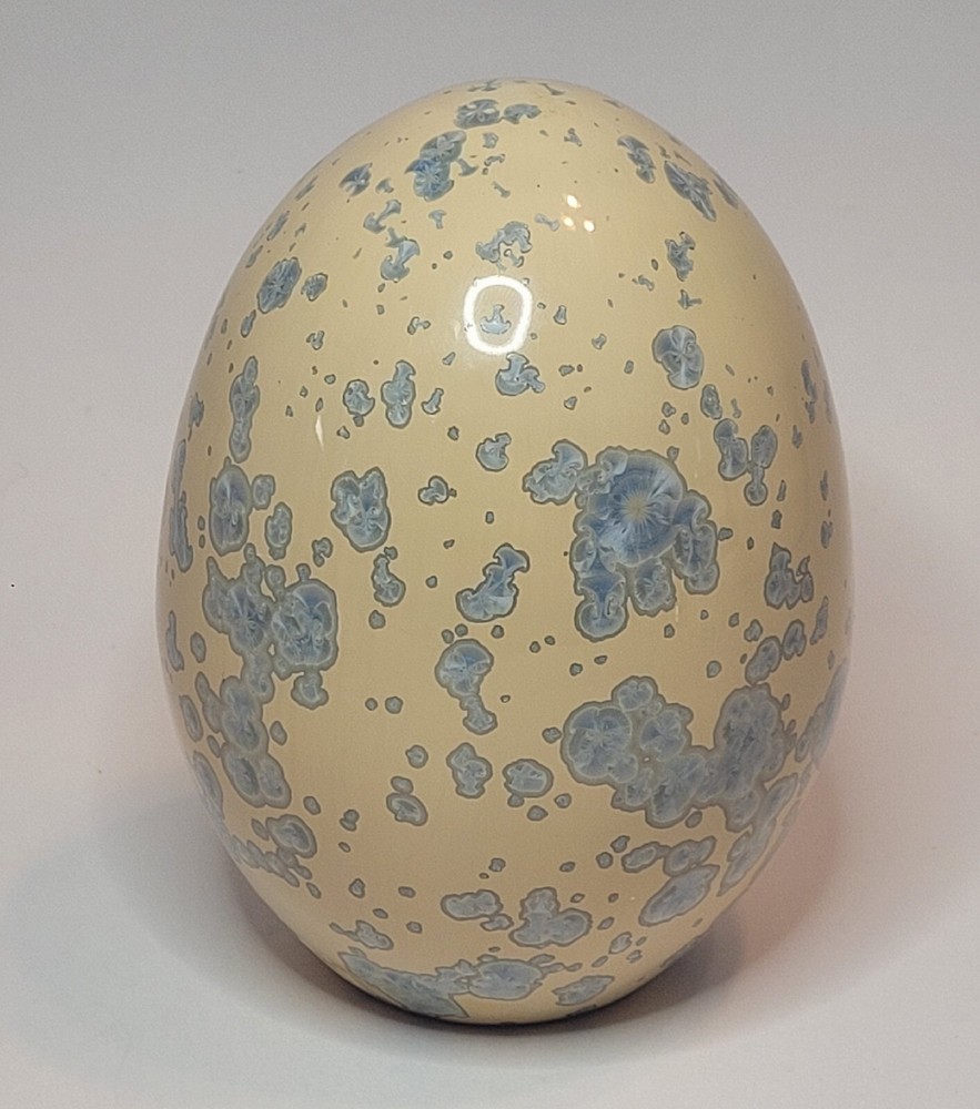 Vtg Crystalline Art Pottery Egg Cream W/ Blue Crystals Cabinet/Shelf Art 5" '90s. Hollow. Lovely pottery egg with a blue crystalline design. Great addition to a pottery collection. Egg is in good preowned vintage condition. No chips or cracks. Please enlarge pics.
