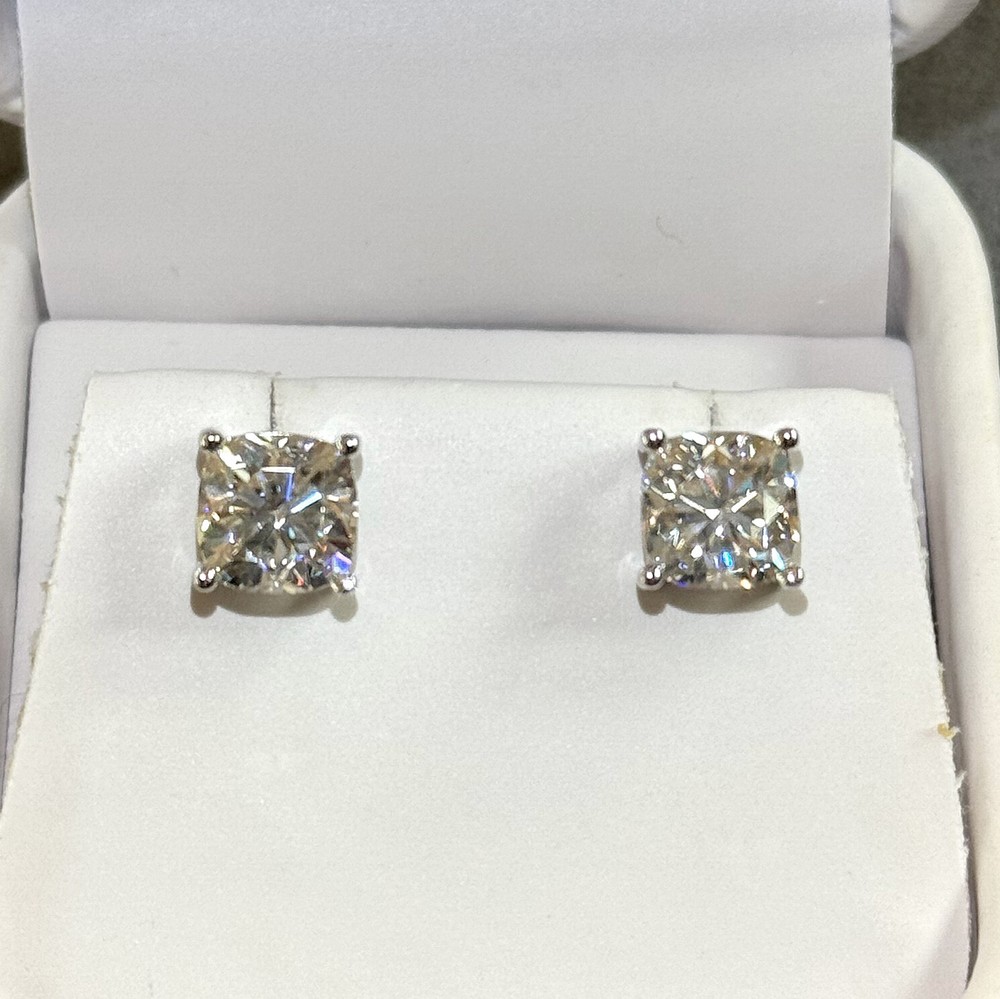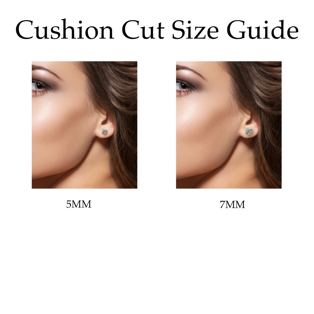 Premium top level moissanite with the best shine! Don't settle for cheap. Unique and luxurious cushion cut always stands out from the crowd. Moissanite offers timeless beauty and exceptional value. The stones we use are GRA certified VVS1 clarity Moissanite. The details matter so we do not buy simply the cheapest stones on the market. We only purchase the most beautiful ideal cut moissanite stones that offer the highest fire and brilliance. This is the best compromise between cheap fakes (CZ, crystal, rhinestone) and extremely expensive diamond solitaire stones. Natural diamond equivalent earrings cost $4000+. Get the same look at a much better price! -VVS1 Clarity D Color GRA certified Moissanite Stones -Ideal Round Cut With Excellent Rating -9.5 Hardness Rating. Diamonds are perfect 10, cheap fakes are 3-4. This means Moissanite won't dull over time. -925 Sterling Silver With Rhodium Plating (Same finish as white gold) or 14K yellow Gold -Passes many commonly used Diamond Testers