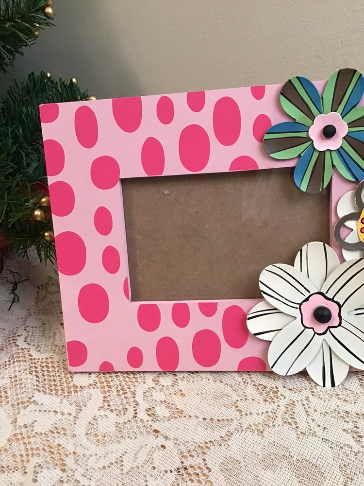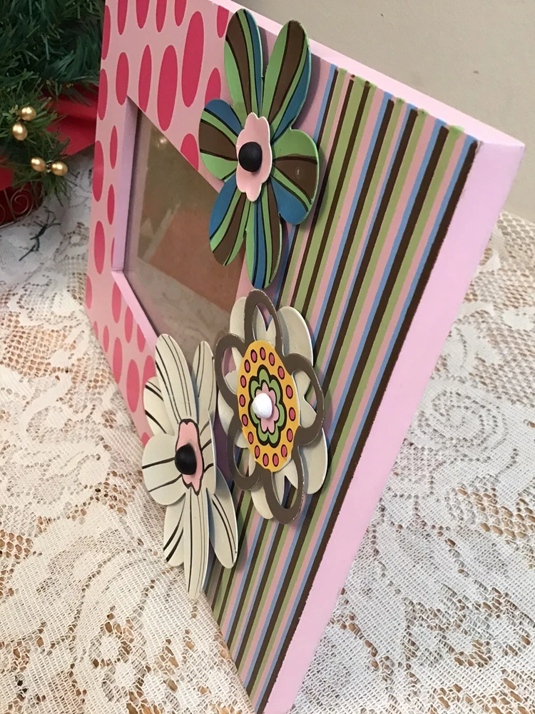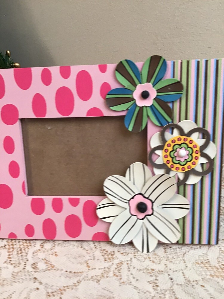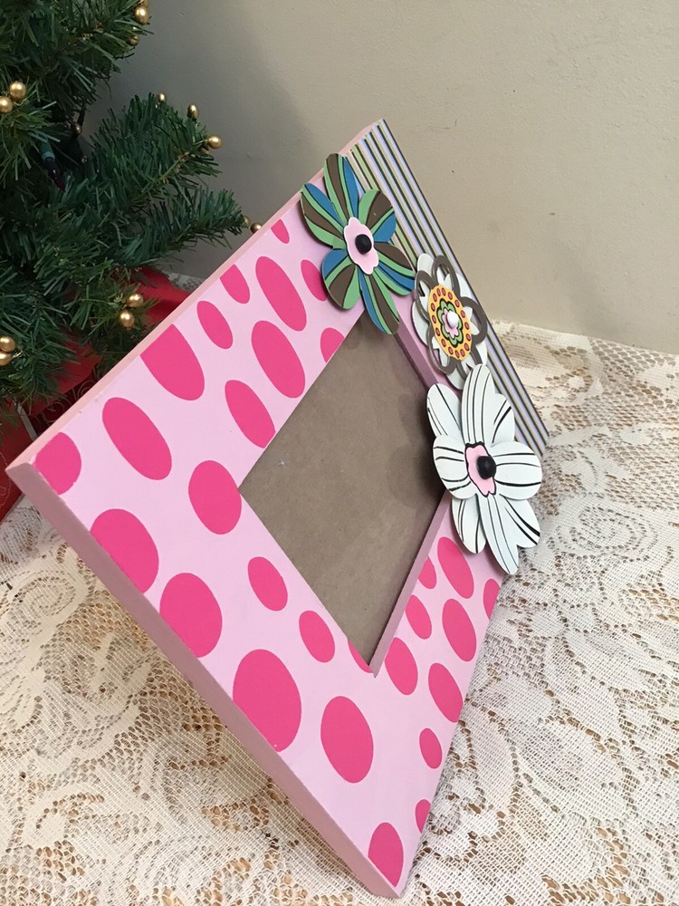 Cute brother sister design studio picture frame. Pink Dots and multi strips with attached painted flowers. Great addition to any Little girl room. Holds 5 3/4” x 3 3/4” photo. Measures for 11x8”. Condition is "Used". Shipped with USPS Priority Mail.