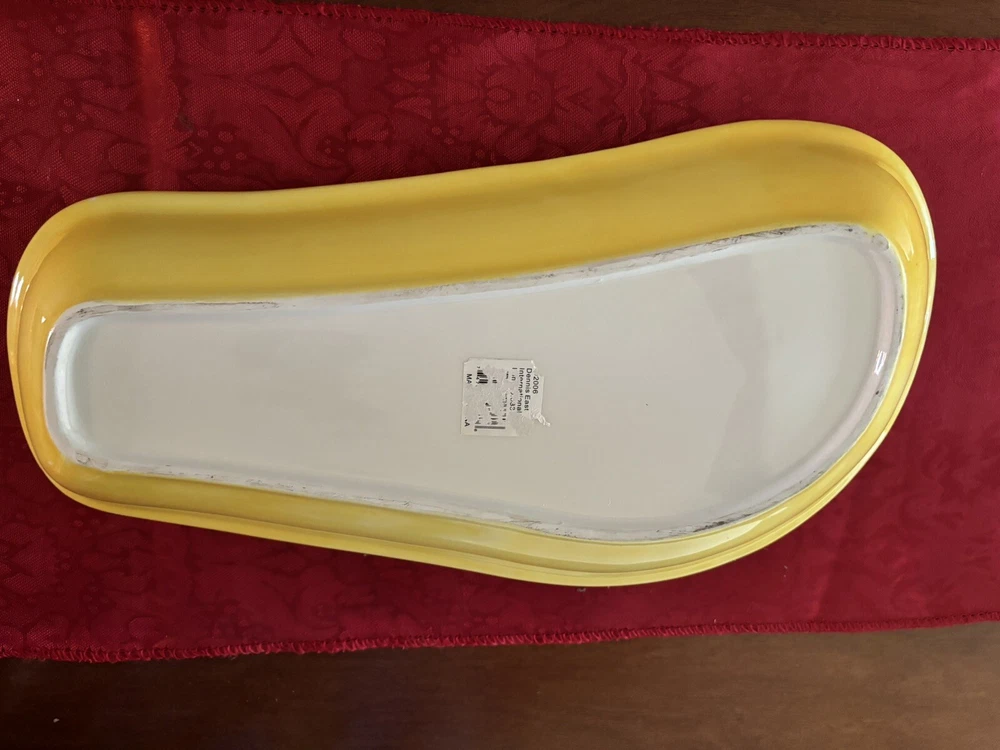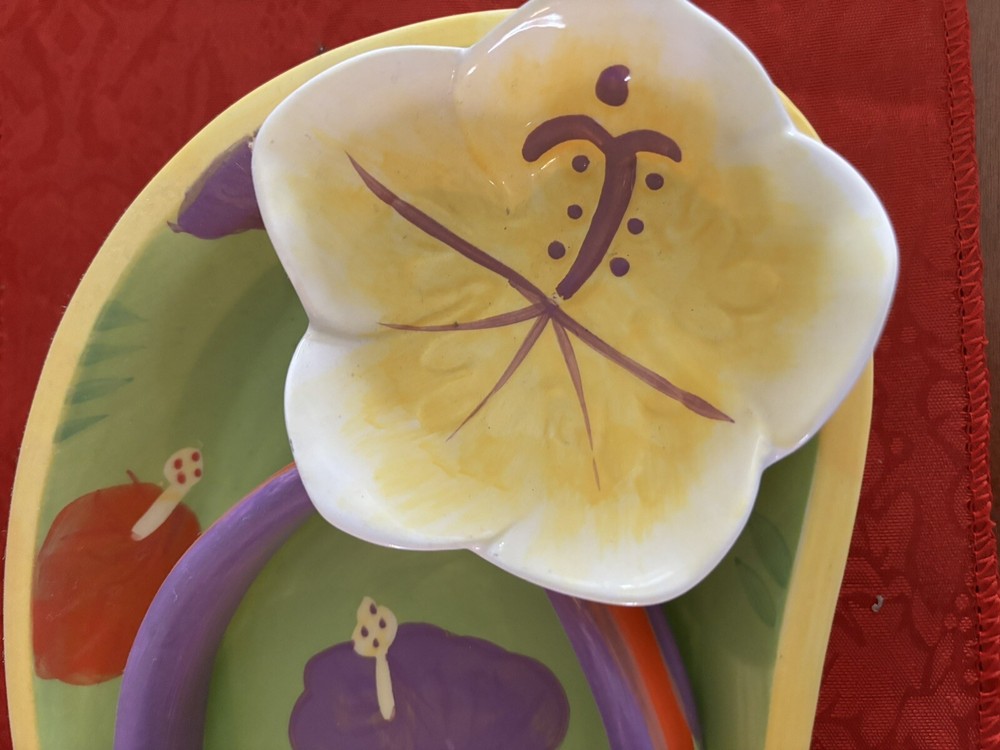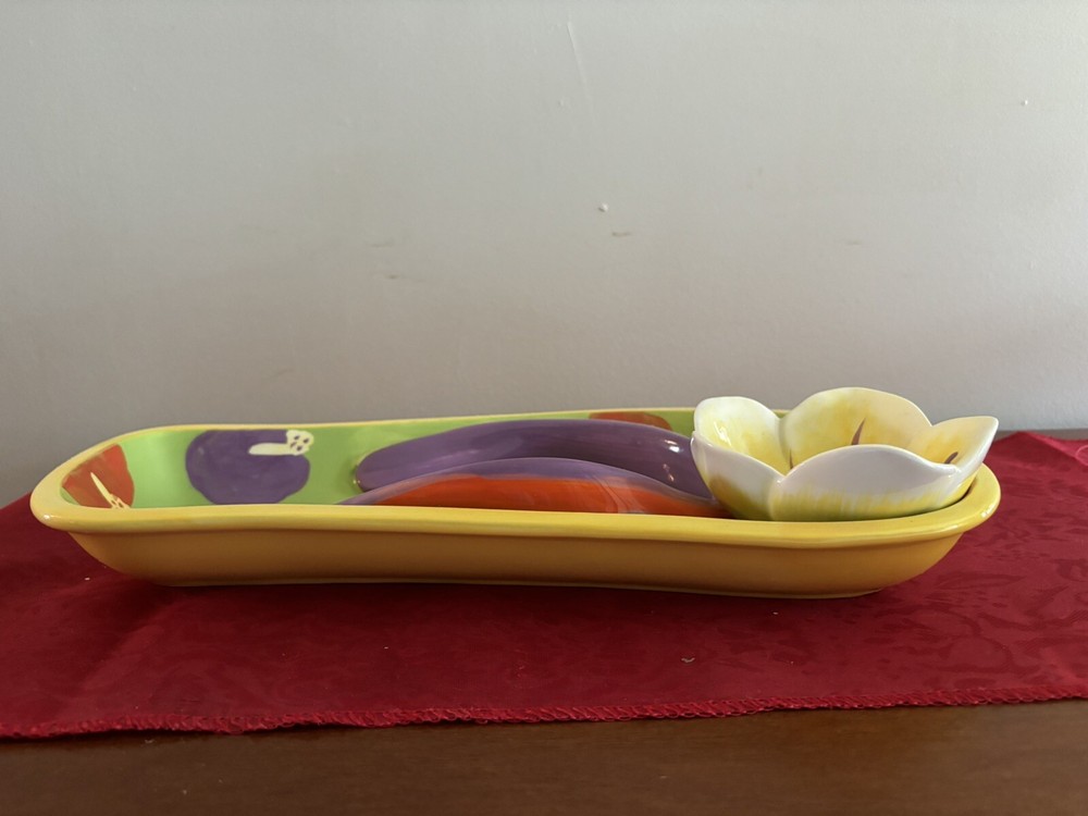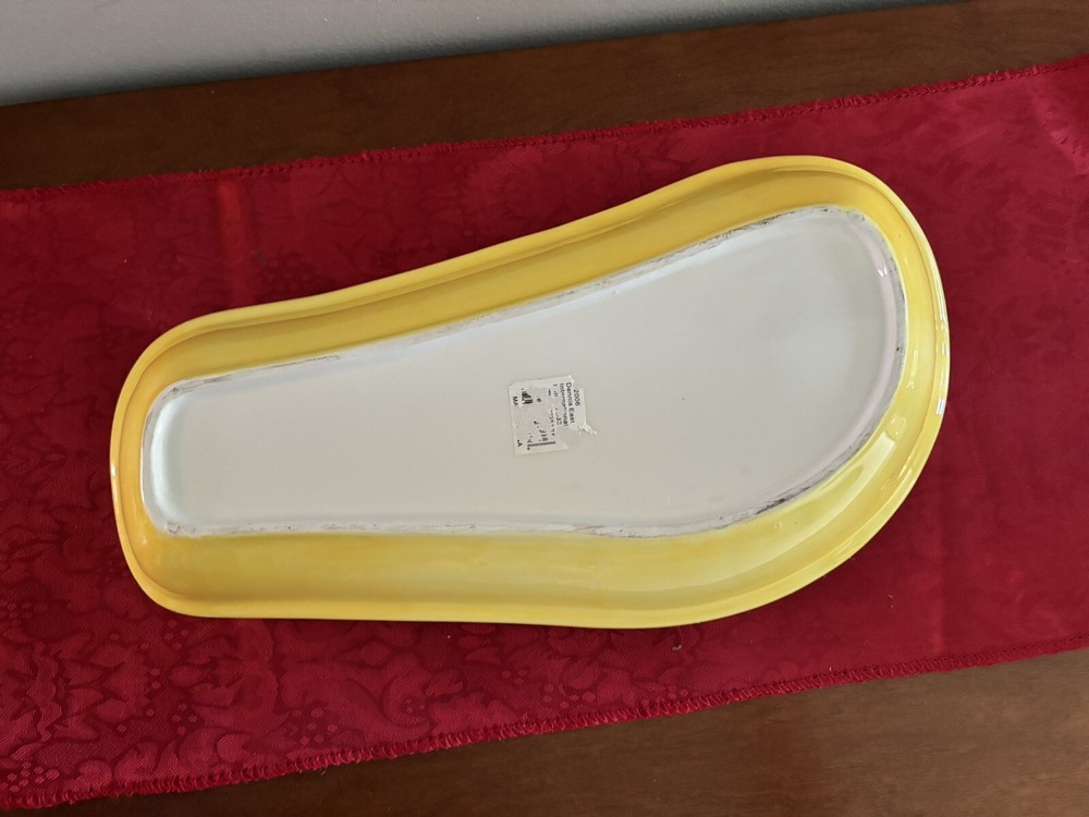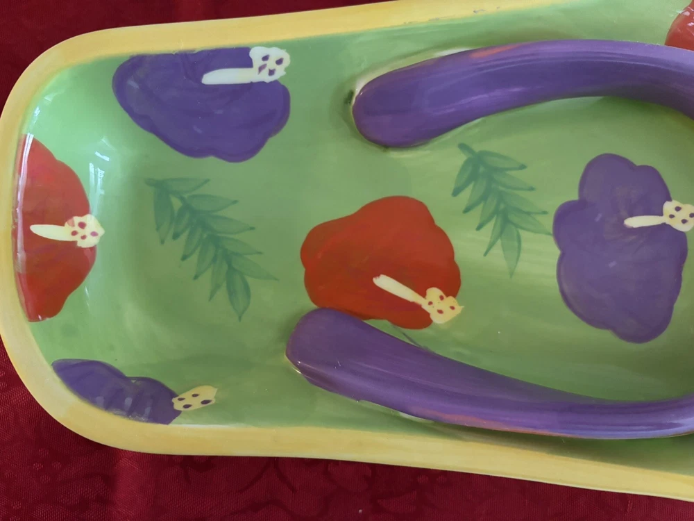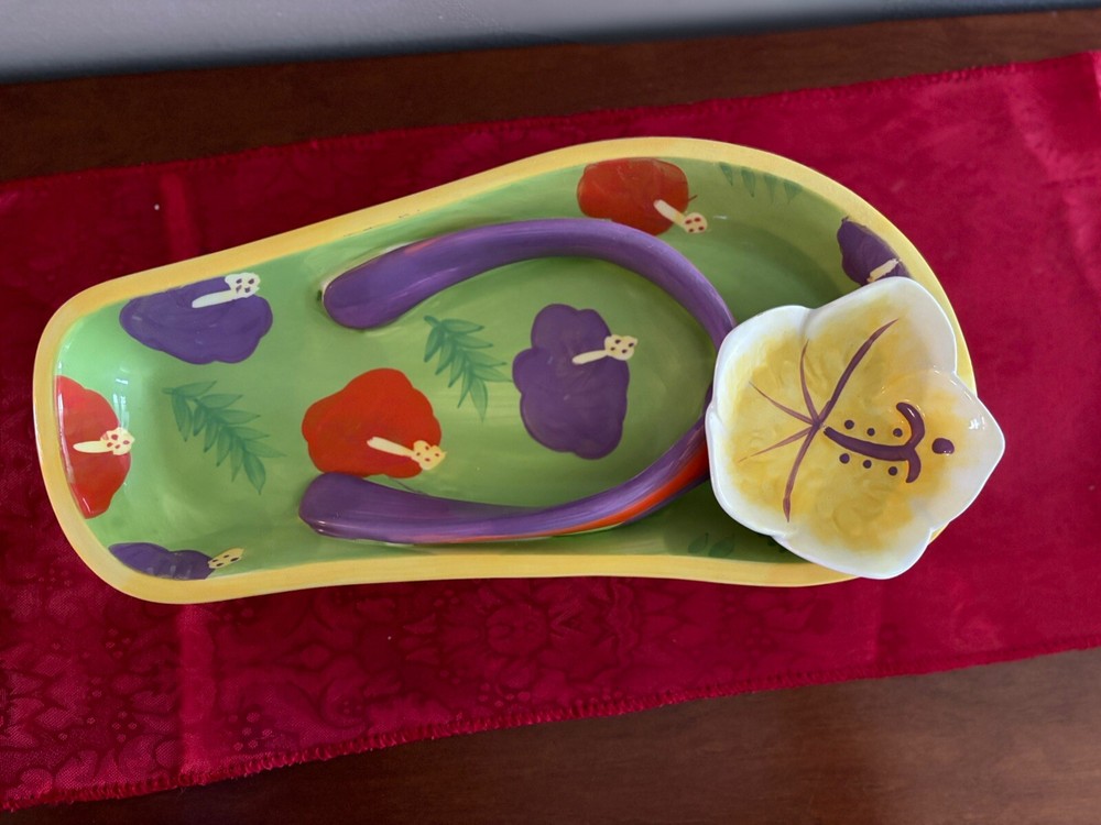 This cute large ceramic chip and dip platter features a playful flip flop design, perfect for summer parties, BBQs, and luaus. The platter is adorned with a polka dot pattern in a vibrant multicolor scheme, adding a festive touch to any gathering. With its beach and tropical theme, this plate is ideal for serving snacks and appetizers in a fun and stylish way. Made by Dennis East, this dish is a charming addition to any kitchen or dining decor.