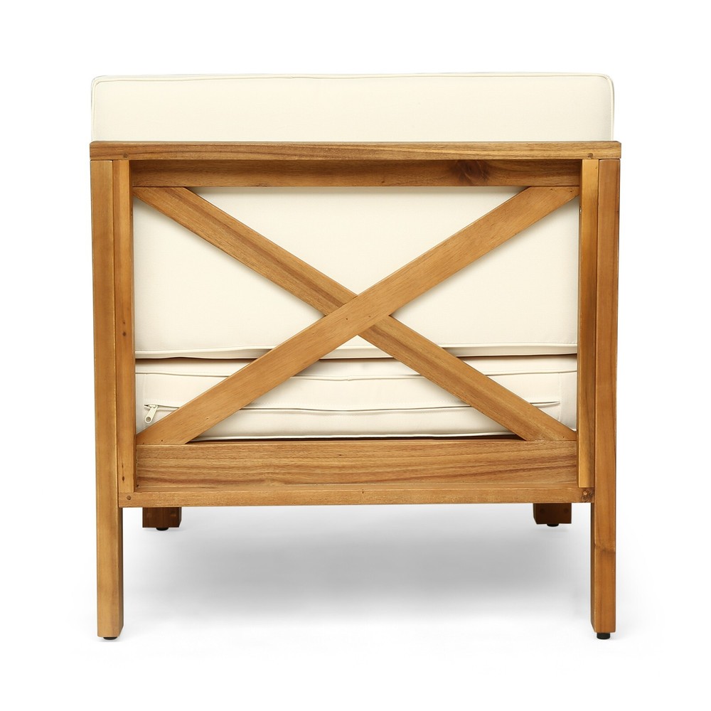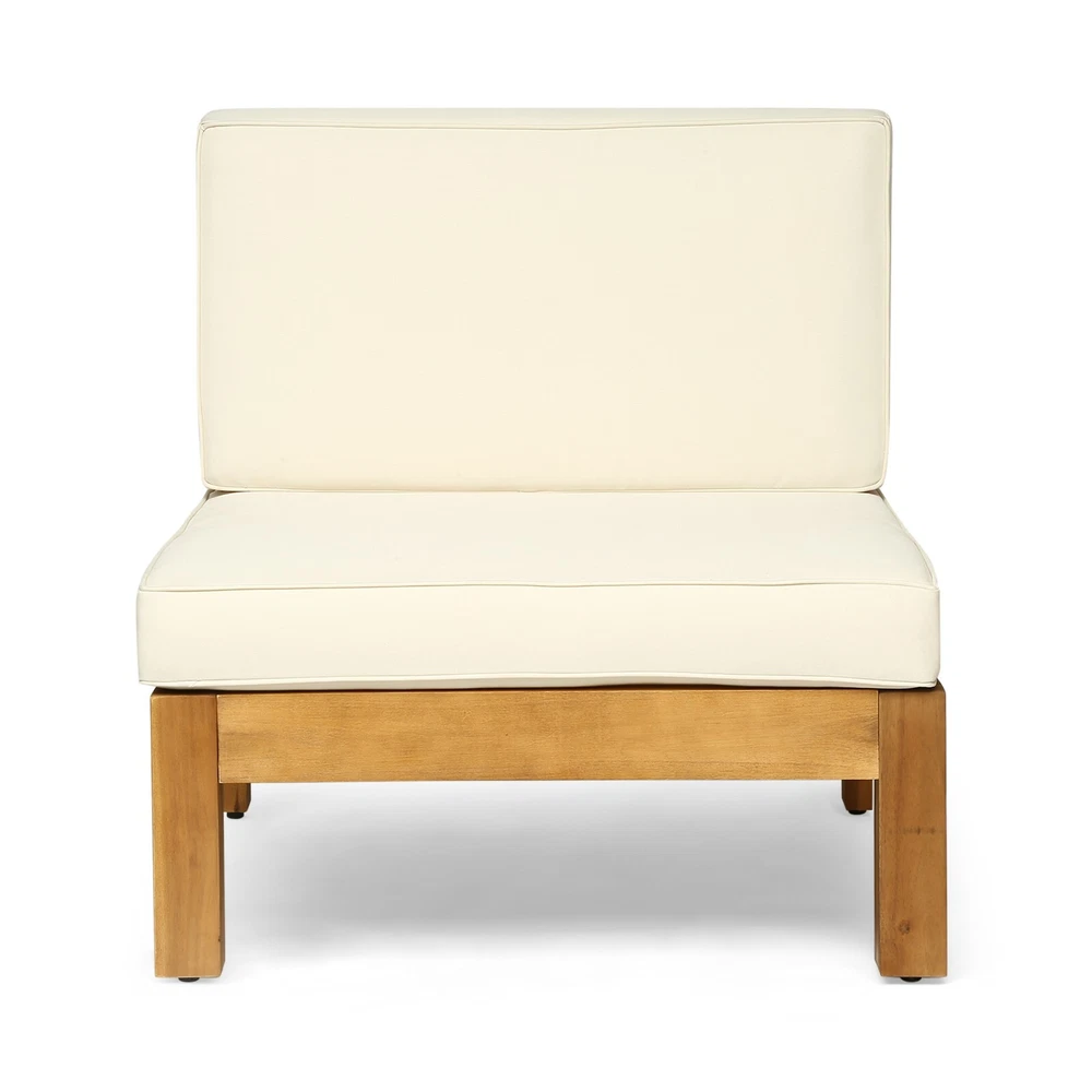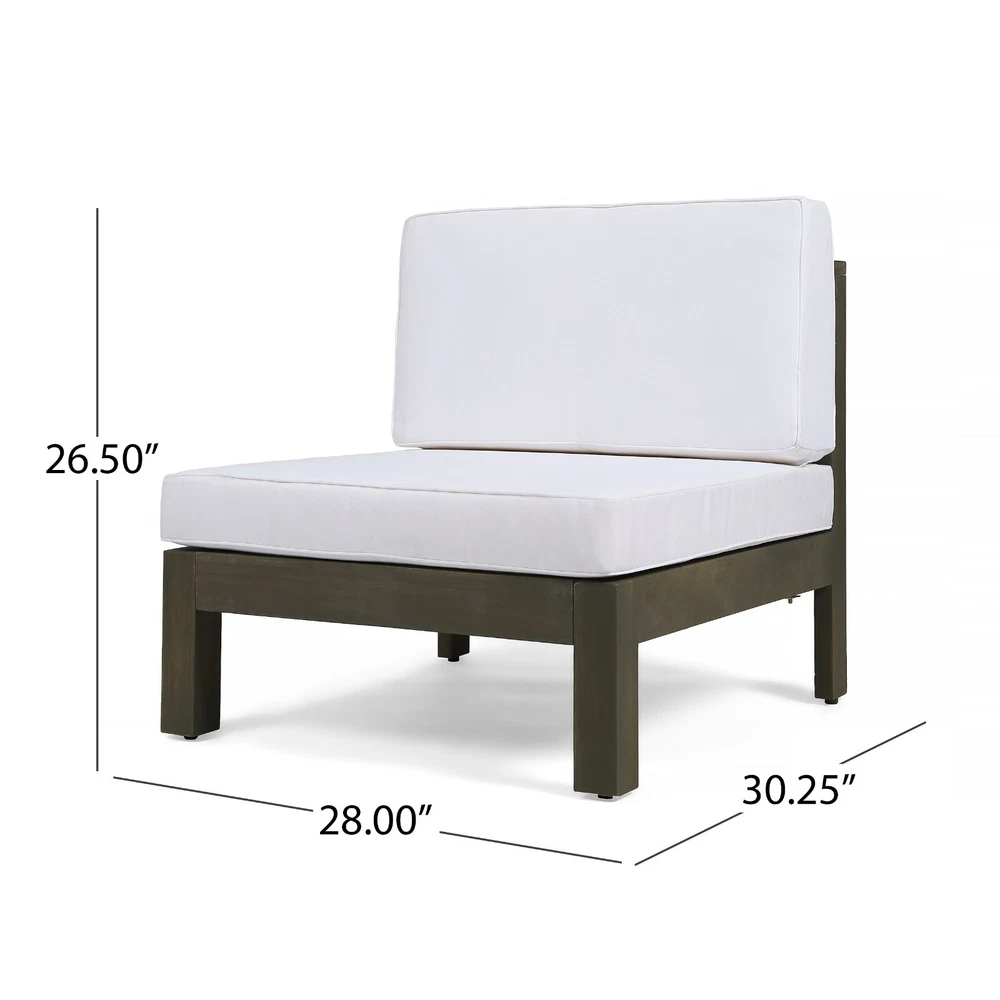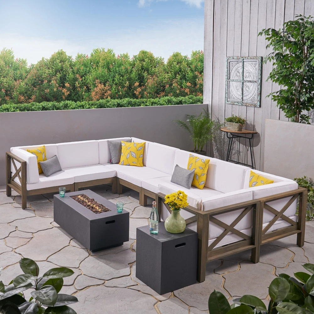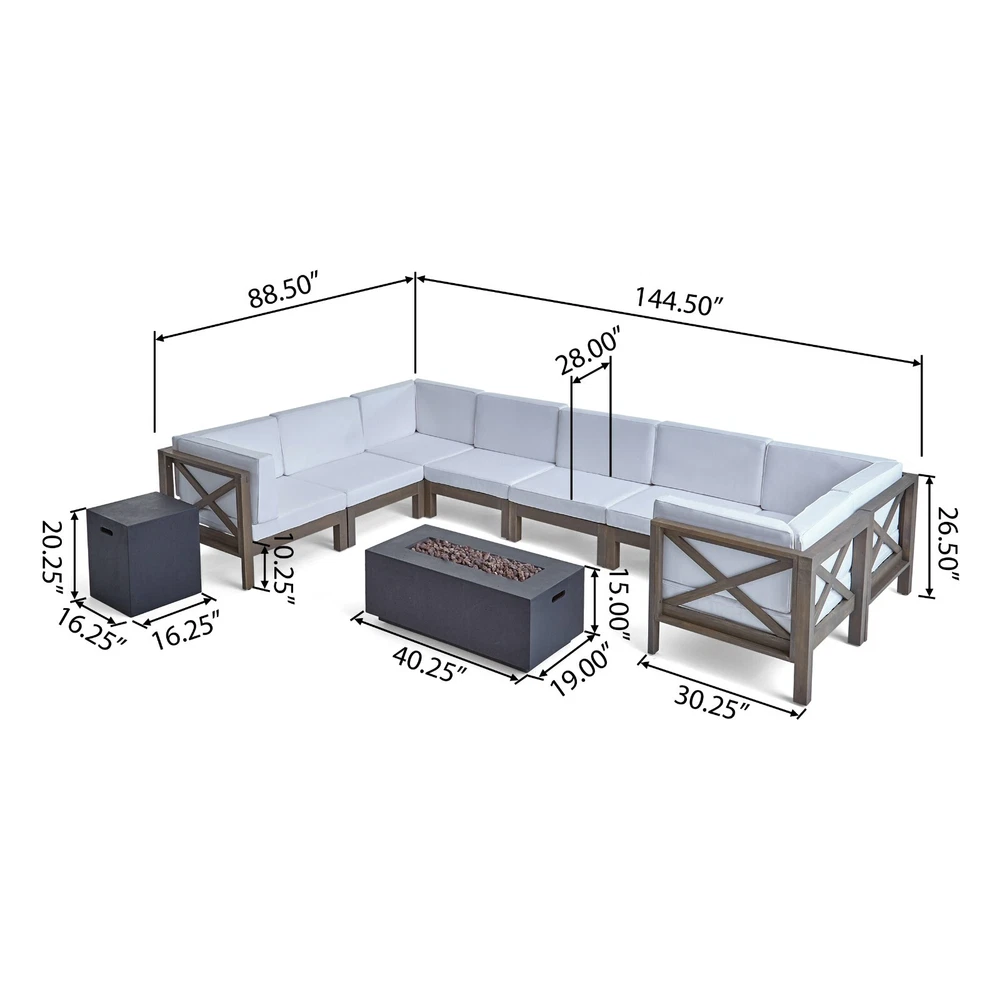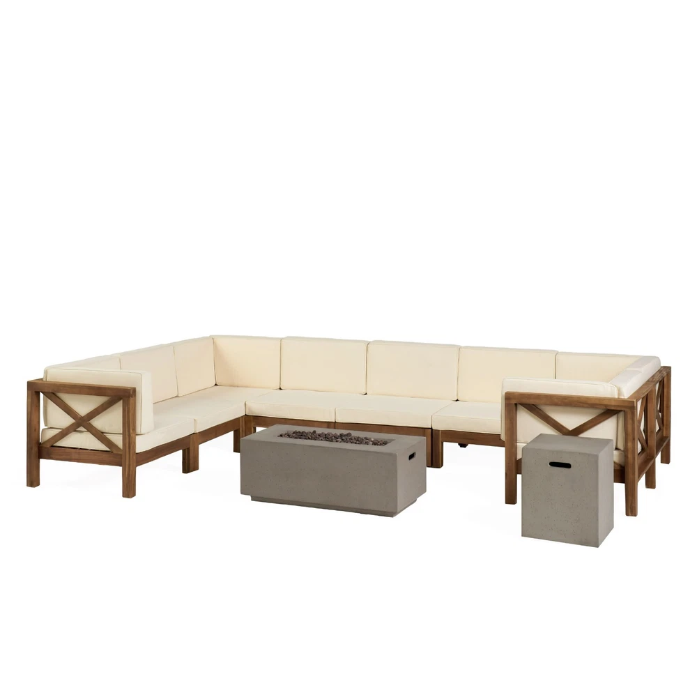 Don't leave your guests standing in the dark after the sun goes down - our 8-seater outdoor sectional sofa and fire pit set will change barbecues and late-night soirees at home forever. This estate collection comes fully outfitted with everything you need to show all of your favorite people the time of their lives - included along with the fire pit and tank holder are one right-side armchair, one left-side armchair, two corner pieces, and four armless segments; as a fully modular assemblage of outdoor furniture, you have the freedom to customize your configuration to suit your patio or deck's floor plan without limitation. Includes: One (1) Right-Side Armchair, One (1) Left-Side Armchair, Two (2) Corner Pieces, Four (4) Armless Pieces, One (1) Fire Pit, One (1) Tank Holder Frame Material: Acacia Wood Cushion Material: Water-Resistant Fabric Fabric Composition: 100% Polyester Fire Pit and Tank Holder Material: Lightweight Concrete and Iron Frame Finish: Teak / Gray Cushion Color:Beige / White Fire Pit and Tank Holder Color: Light Gray / Dark Gray Hand-Crafted Details Some Assembly Required Right-Side Armchair Dimensions: 30.25 inches deep x 30.25 inches wide x 26.50 inches high Right-Side Armchair Seat Dimensions: 28.00 inches deep x 28.00 inches wide x 10.25 inches high Right-Side Armchair Arm Height: 26.50 inches Left-Side Armchair Dimensions: 30.25 inches deep x 30.25 inches wide x 26.50 inches high Left-Side Armchair Seat Dimensions: 28.00 inches deep x 28.00 inches wide x 10.25 inches high Left-Side Armchair Arm Height: 26.50 inches Corner Piece Dimensions: 30.25 inches deep x 28.00 inches wide x 26.50 inches high Corner Piece Seat Dimensions: 28.00 inches deep x 28.00 inches wide x 10.25 inches high Armless Piece Dimensions: 30.25 inches deep x 28.00 inches wide x 26.50 inches high Armless Piece Seat Dimensions: 28.00 inches deep x 28.00 inches wide x 10.25 inches high Fire Pit Dimensions: 19.00 inches deep x 40.25 inches wide x 15.00 inches high Tank Holder Dimensions: 16.25 inches deep x 16.25 inches wide x 20.25 inches high PROP 65 WARNING
