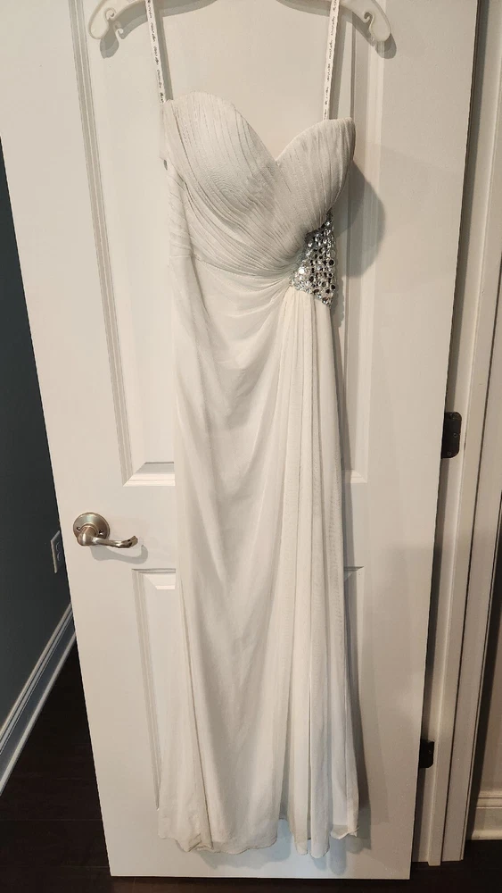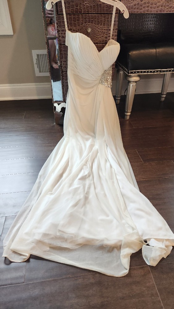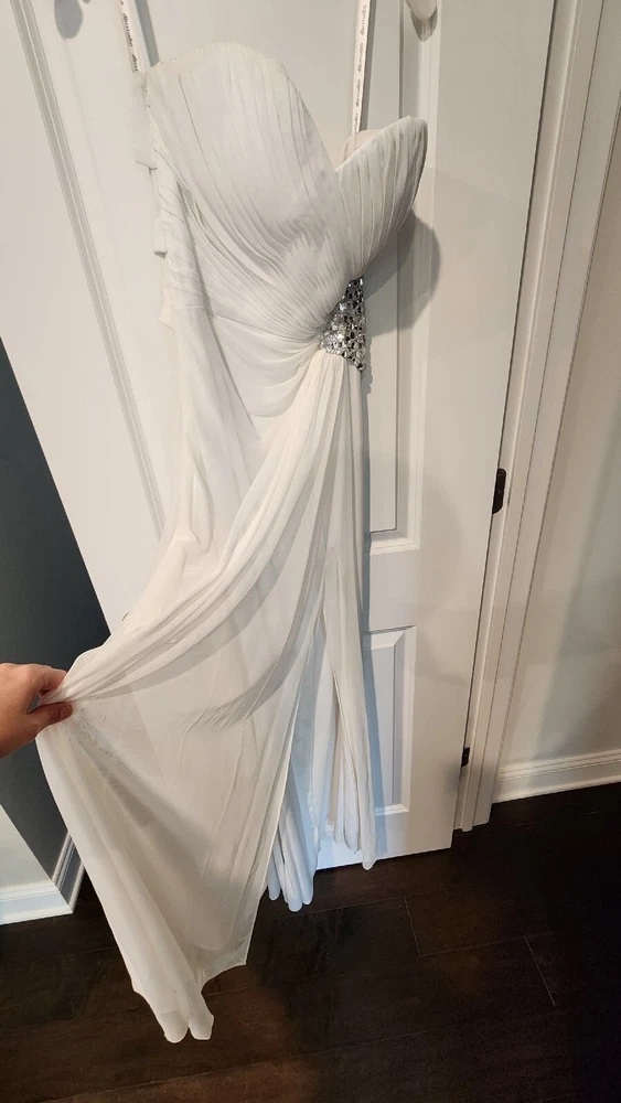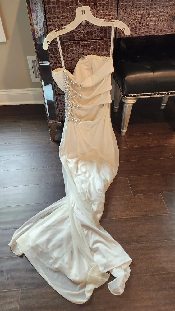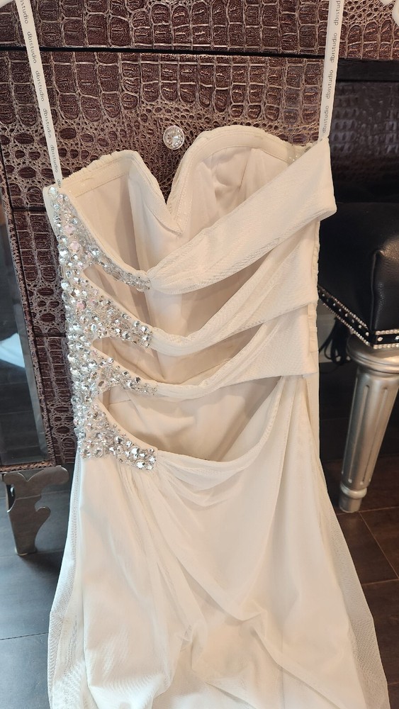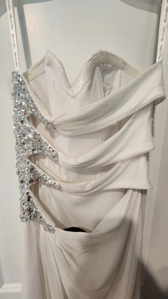 DB STUDIO Wedding Dress Strapless Sheath Slit Rhinestones White 4. Beautiful wedding dress with back cutouts and rhinestones on left side. Zipper on side. Sweetheart neckline, chiffon overlay with slight staining along bottom front of chiffon, not very noticeable. Only worn for 3 hours during beach photo shoot.