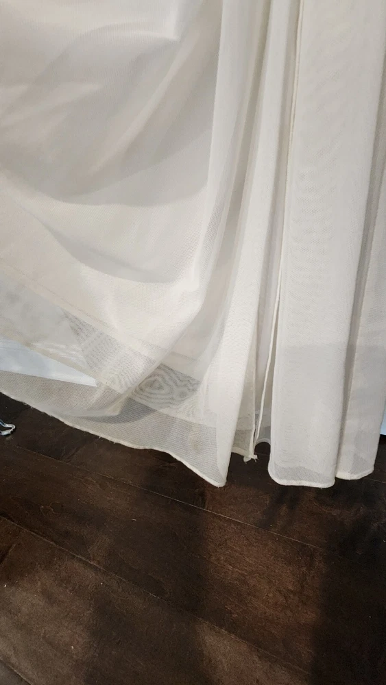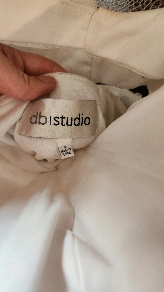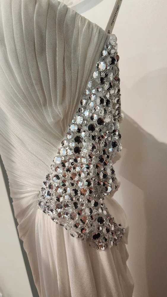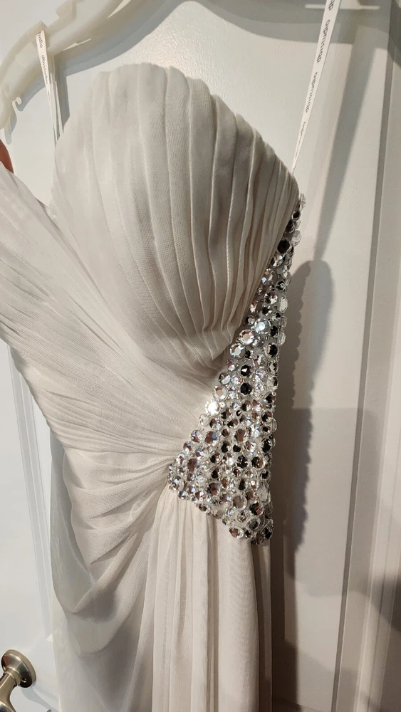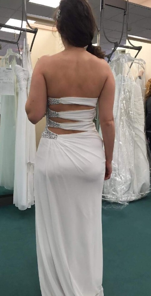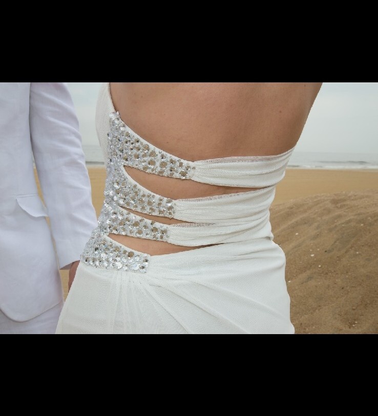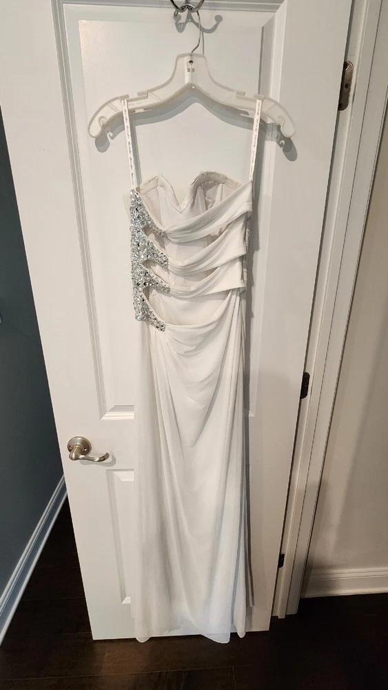 DB STUDIO Wedding Dress Strapless Sheath Slit Rhinestones White 4. Beautiful wedding dress with back cutouts and rhinestones on left side. Zipper on side. Sweetheart neckline, chiffon overlay with slight staining along bottom front of chiffon, not very noticeable. Only worn for 3 hours during beach photo shoot.