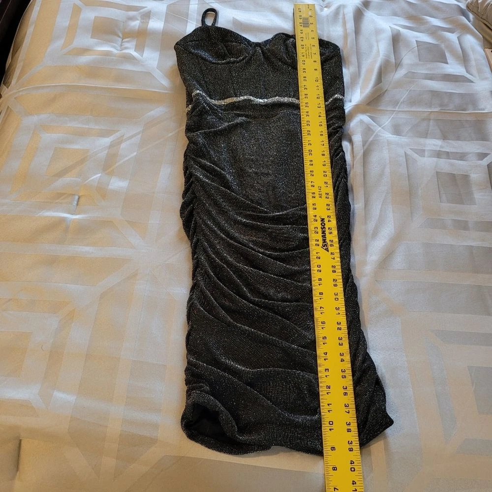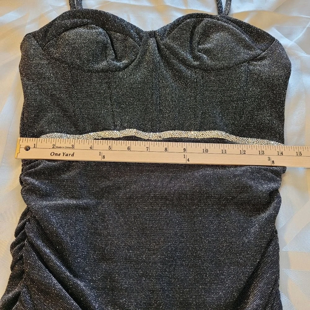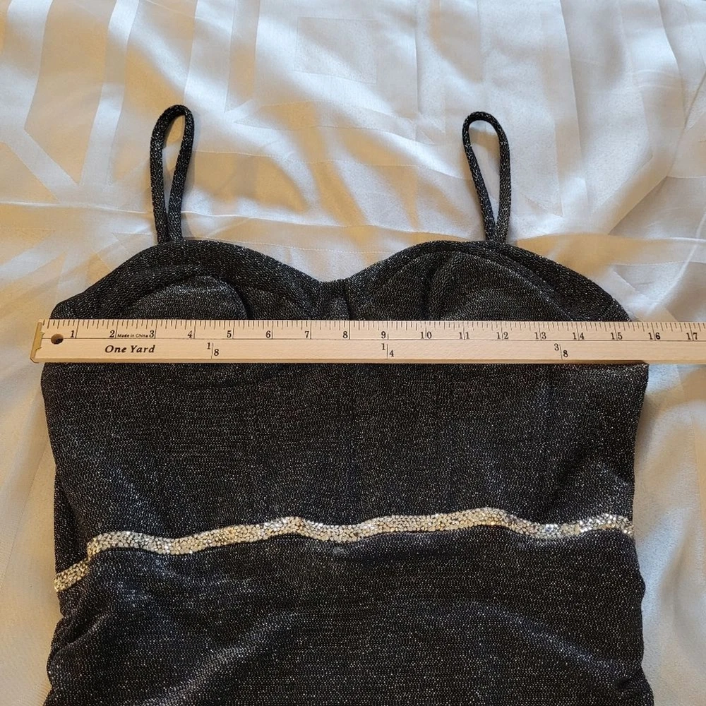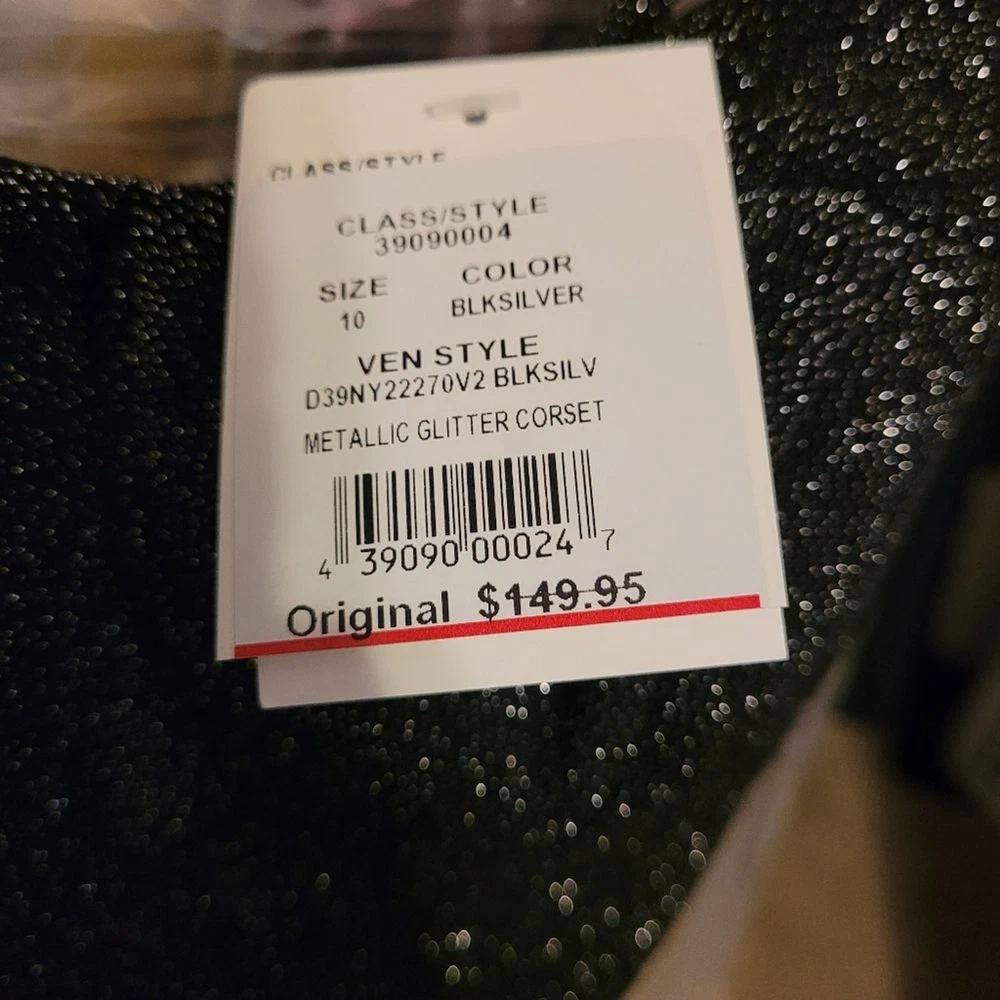 DB Studio Black Metallic Sweetheart Corset Midi Dress - New With Tags - Size: 10 - Color: Black Metallic - Shimmering Sparkle Stretch Dress - Hi-Waist Silver Detail - Corset Detail - Party Dress, Black Dress, Semi-Formal Dress, Cocktail Dress - Homecoming, Holiday, Christmas, Prom, New Year's Eve - Hidden Back zipper - Fully lined - 89% Nylon, 8% Metallic, 3% Spandex - Smoke-Free Home
