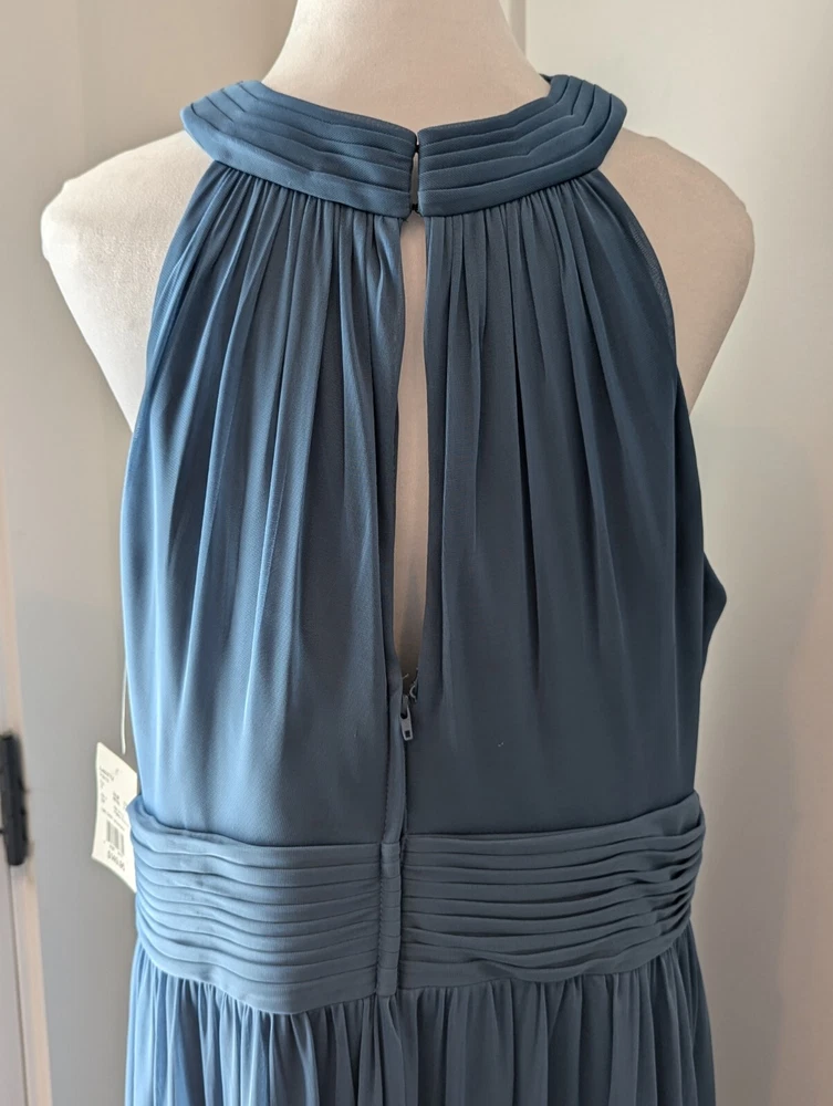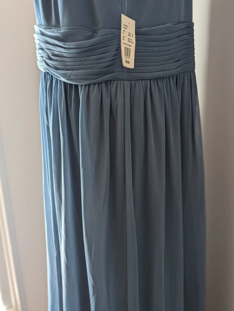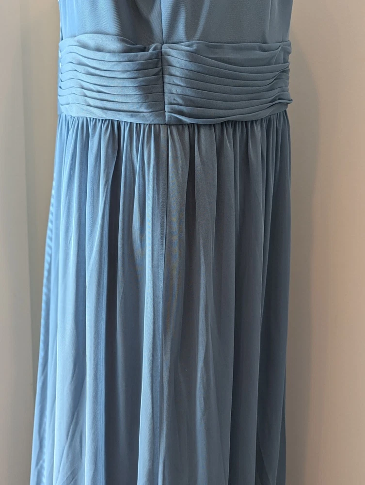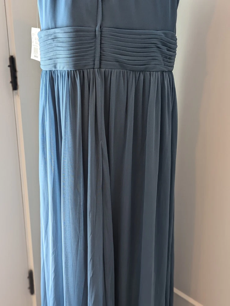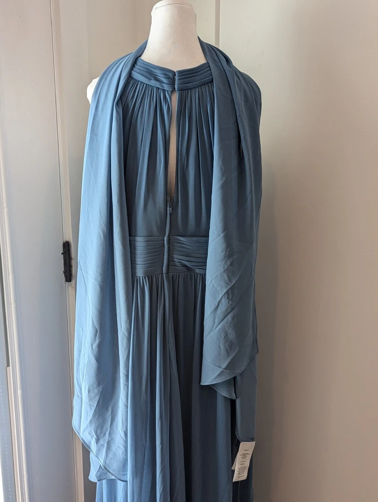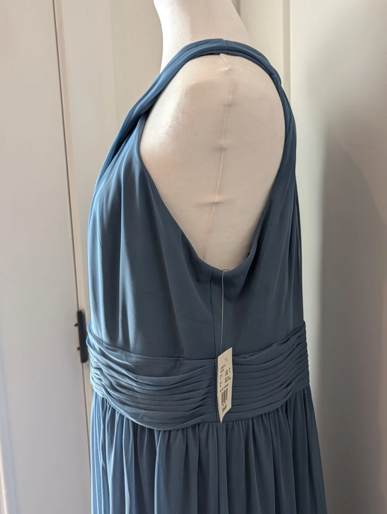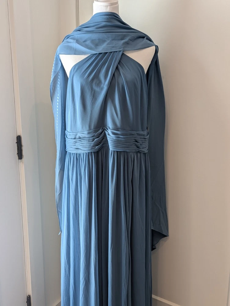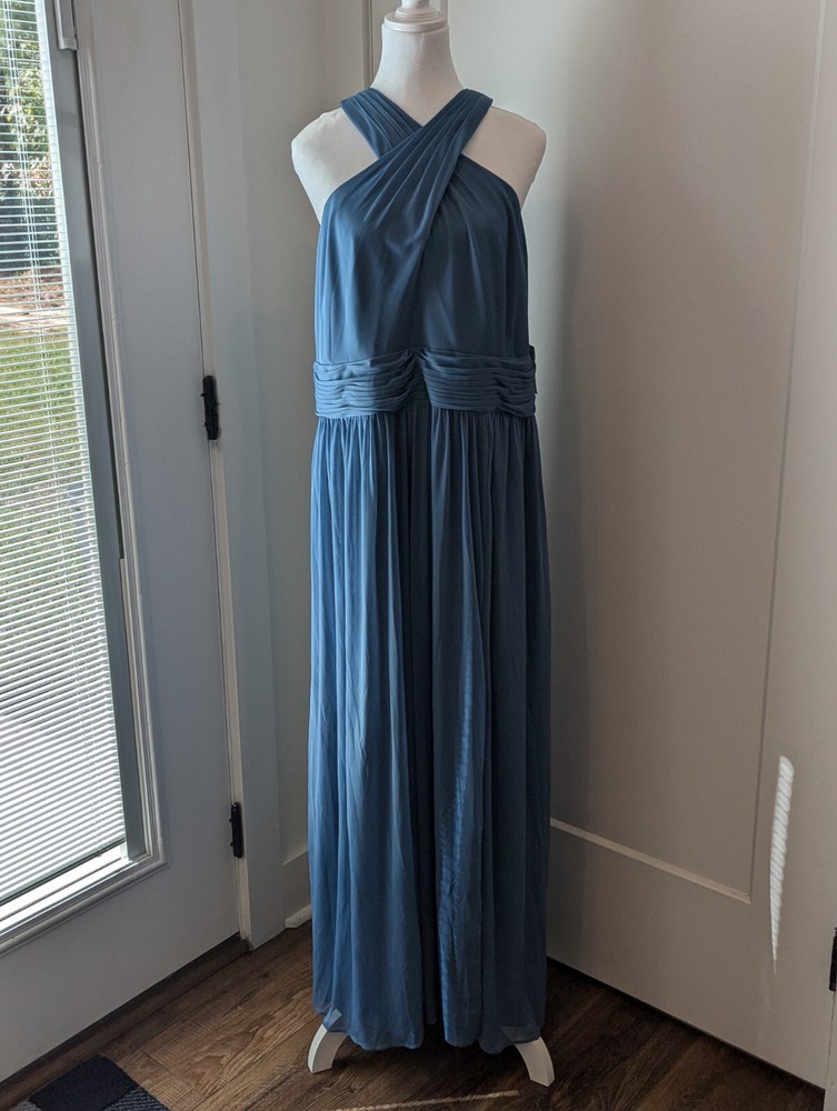 This stunning steel blue chiffon dress From David's Bridal by DBStudio is the perfect choice for any formal occasion. With a flattering crisscross neckline and pleated waist sash, this dress is both elegant and comfortable. The high waist and long A-line skirt add a touch of sophistication, while the pleated crisscross neck straps and zip closure create a unique and stylish look. Made from 100% polyester, this dress is easy to care for and perfect for any season. Whether you're attending a wedding, prom, or cocktail party, this dress is sure to turn heads. Available in size 18 and designed for plus-sized women, this dress is a must-have for any fashion-conscious individual. Includes the chiffon wrap! NWT Measurements are in the photos