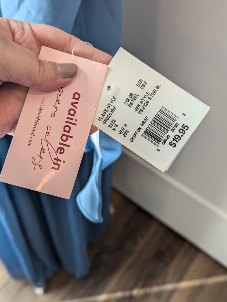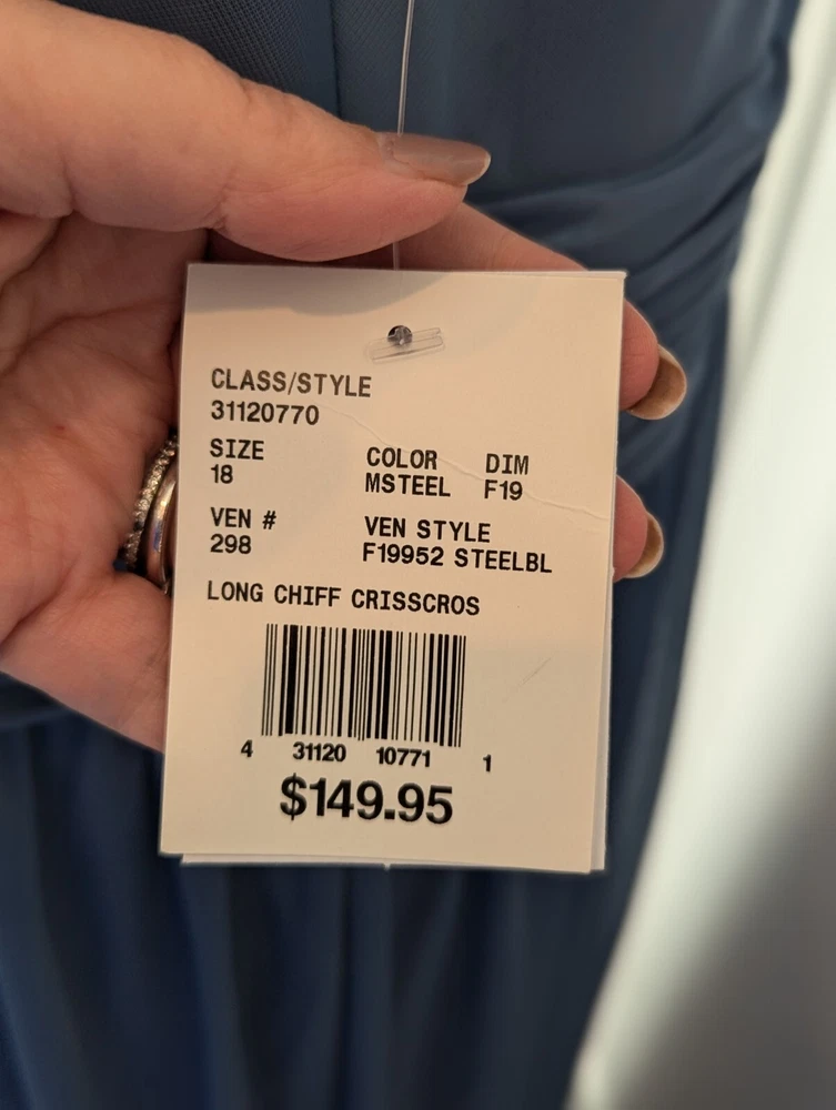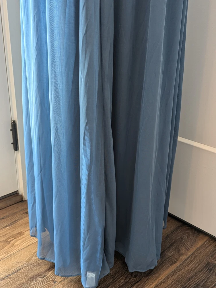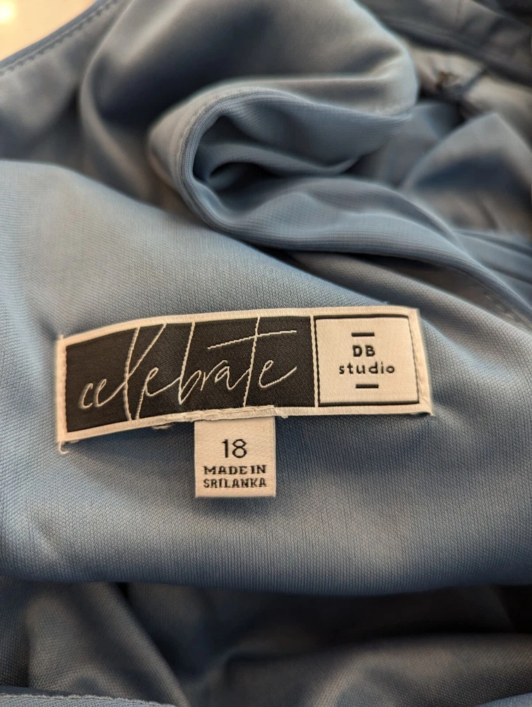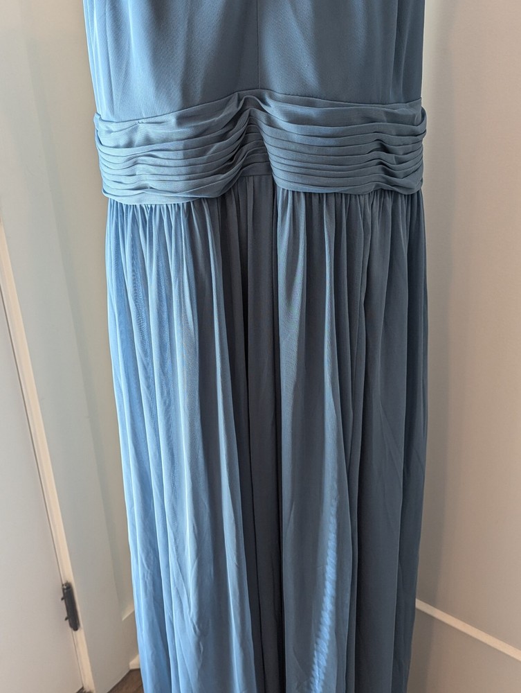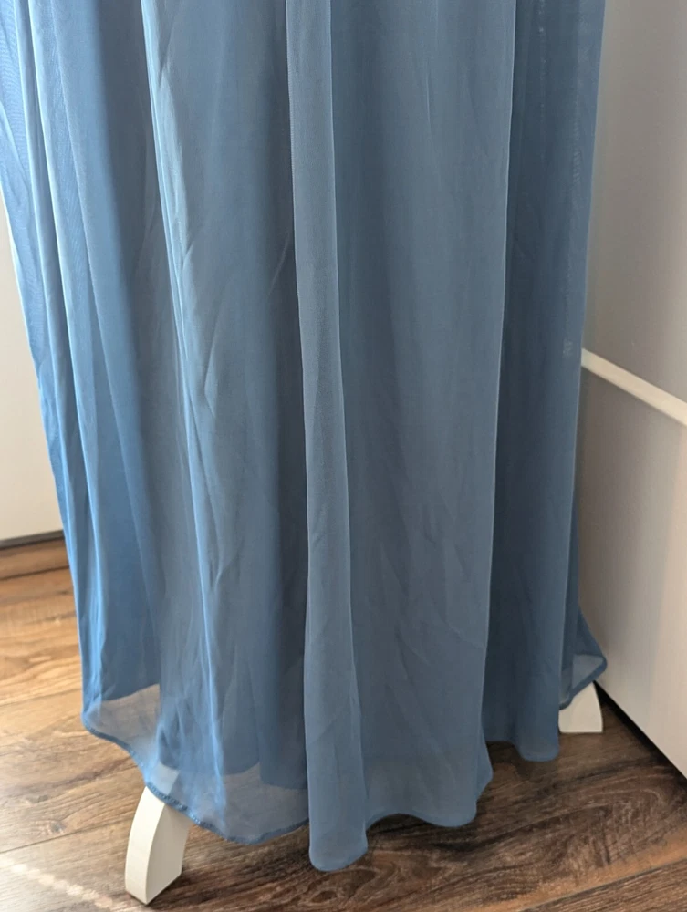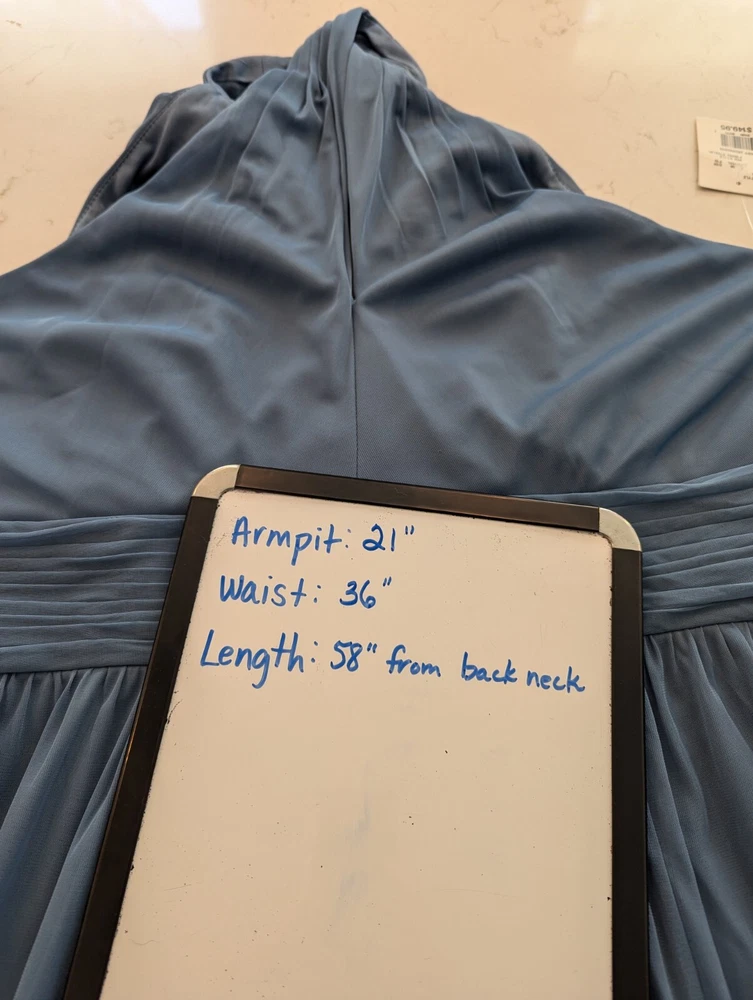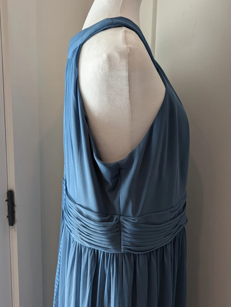 This stunning steel blue chiffon dress From David's Bridal by DBStudio is the perfect choice for any formal occasion. With a flattering crisscross neckline and pleated waist sash, this dress is both elegant and comfortable. The high waist and long A-line skirt add a touch of sophistication, while the pleated crisscross neck straps and zip closure create a unique and stylish look. Made from 100% polyester, this dress is easy to care for and perfect for any season. Whether you're attending a wedding, prom, or cocktail party, this dress is sure to turn heads. Available in size 18 and designed for plus-sized women, this dress is a must-have for any fashion-conscious individual. Includes the chiffon wrap! NWT Measurements are in the photos