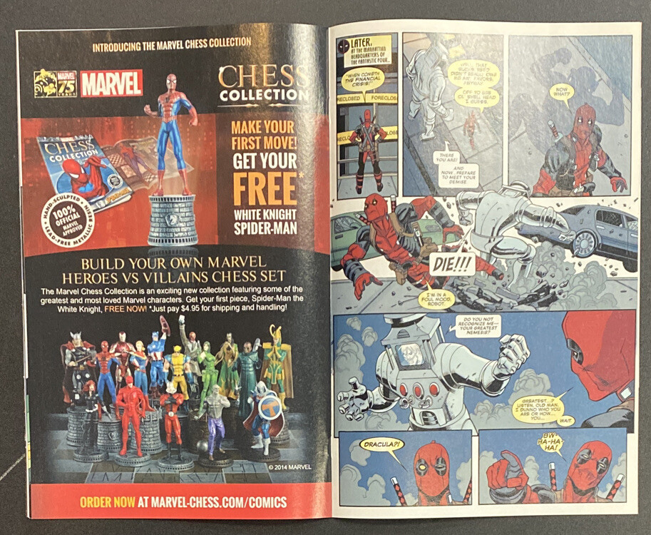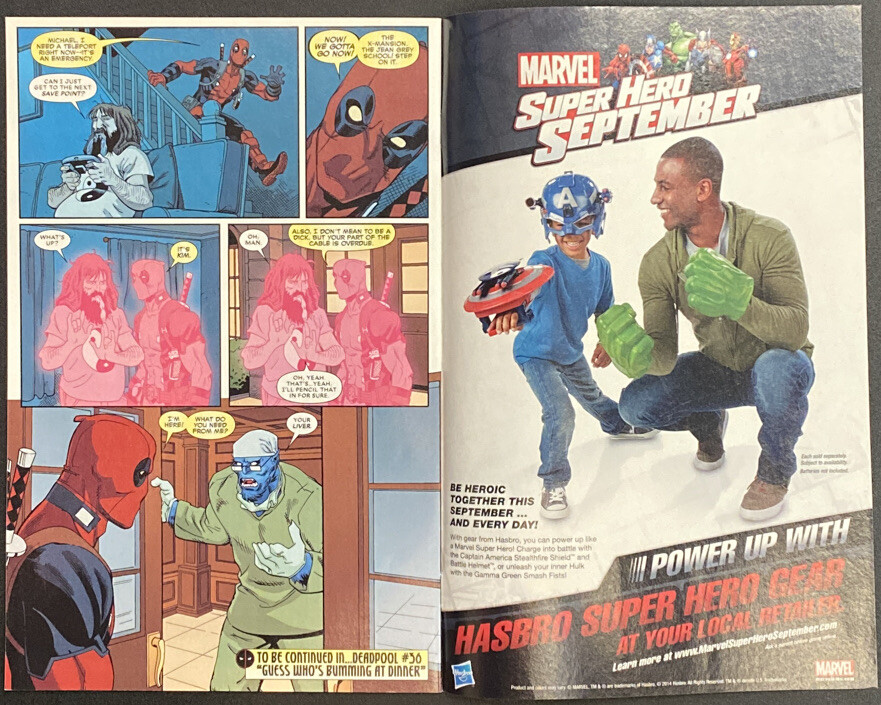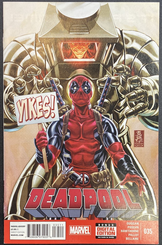 DEADPOOL #35 This is a great lot for fans & collectors of Deadpool The winner of this lot will receive: DEADPOOL #35 Written by Gerry Duggan and Brian Posehn. Art by Mike Hawthorne and Terry Pallot. Cover by Mark Brooks. Our wall-crawling hero is stalked by a classic SPIDER-SLAYER! Wait. This isn't a Spider-Man book. What is a Spider-Slayer doing here??? Auction is for a lot of 1 Comic Book. Included is Issue #35. Book was published by Marvel in 2014. Book is in VF condition. First Printing. Photos are of actual book. Book is bagged and boarded.