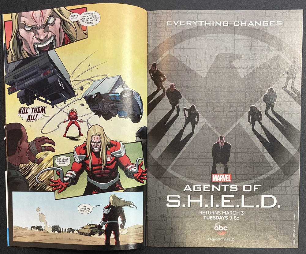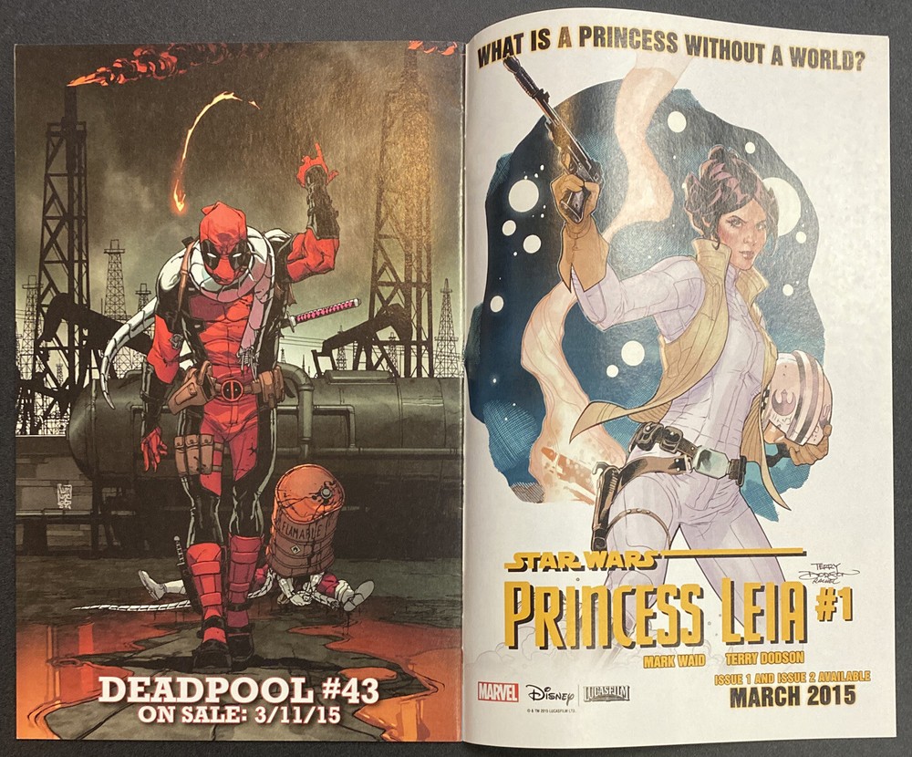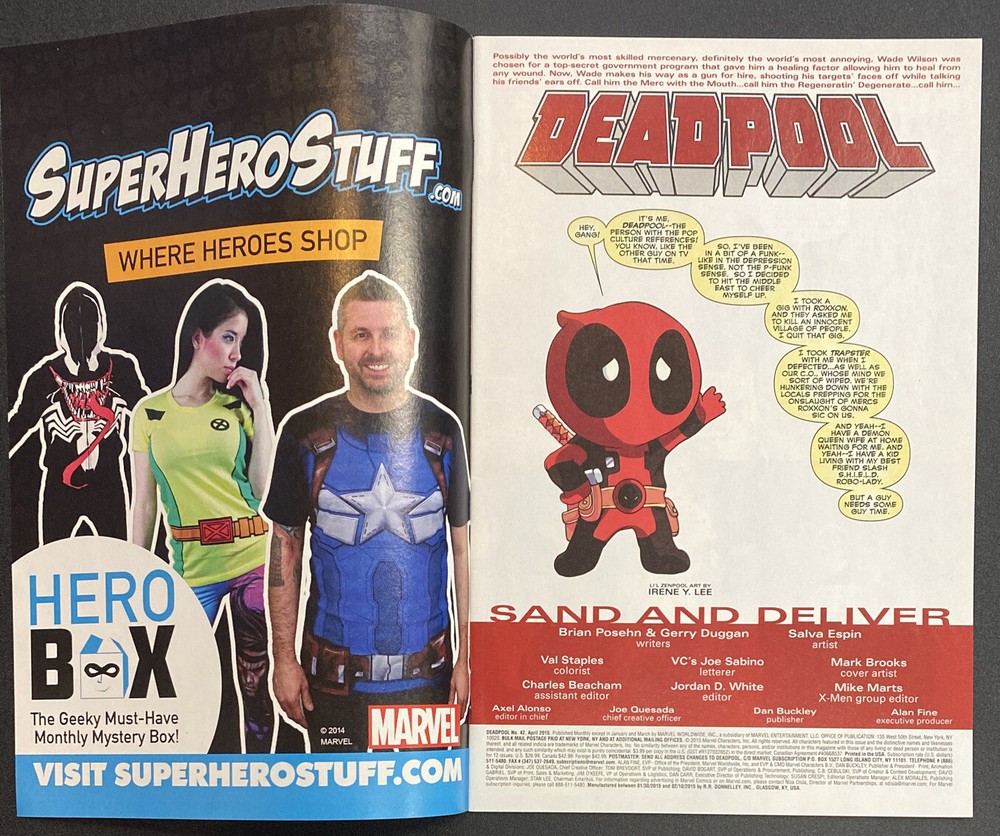 DEADPOOL #42 This is a great lot for fans & collectors of Deadpool The winner of this lot will receive: DEADPOOL #42 Written by Gerry Duggan and Brian Posehn. Art by Salva Espin. Cover by Mark Brooks. Deadpool has been through a lot recently...he needs to relax. Time for a good, old fashioned, simple merc job. Deadpool in the Middle East. Should be nice and uncomplicated. 28 pages, full color. Parental Advisory Auction is for a lot of 1 Comic Book. Included is Issue #42. Book was published by Marvel in 2015. Book is in VF condition. First Printing. Photos are of actual book. Book is bagged and boarded.