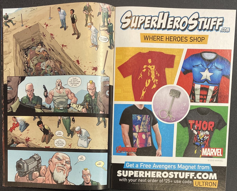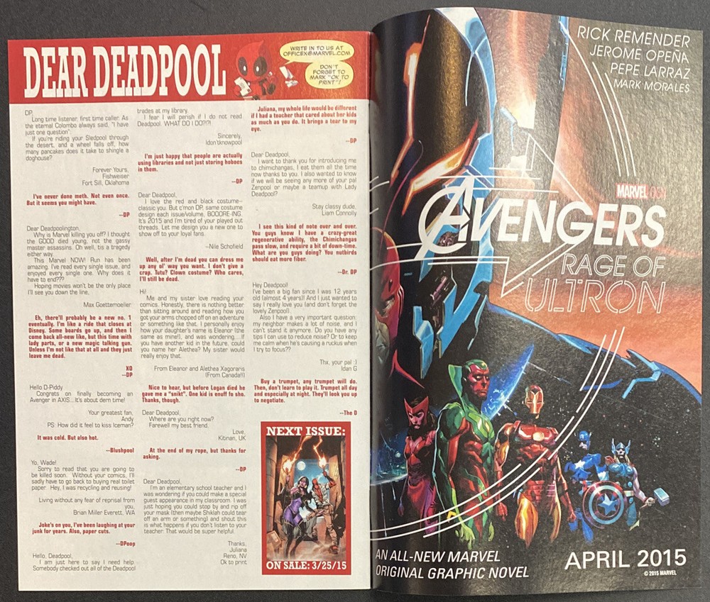 DEADPOOL #43 This is a great lot for fans & collectors of Deadpool The winner of this lot will receive: DEADPOOL #43 Written by Gerry Duggan and Brian Posehn. Art by Salva Espin. Cover by Guisseppe Cammuncoli. First: Deadpool let loose in an oil field! Then: Deadpool & Shiklah enter the Tomb of Scariness! Guest-starring Omega Red and damned dirty bamfers! 28 pages, full color. Parental Advisory Auction is for a lot of 1 Comic Book. Included is Issue #43. Book was published by Marvel in 2015. Book is in VF condition. First Printing. Photos are of actual book. Book is bagged and boarded.
