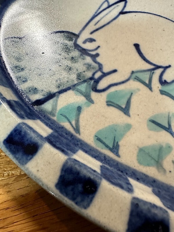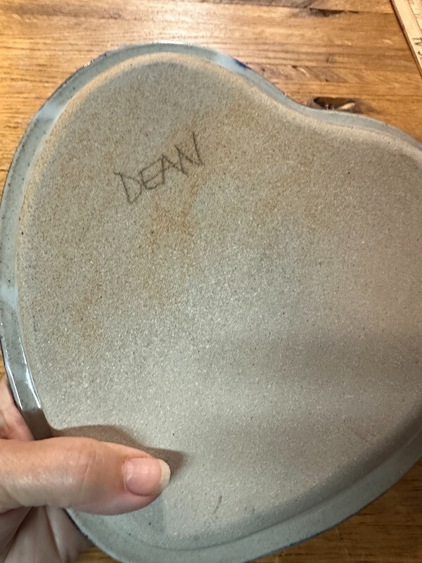 DEBBIE DEAN Bunny You are viewing a whimsical piece of studio pottery by Debbie Dean. Classic blue checkerboard border. Crouching Bunny motif Heart-Shaped Plate/Dish that measures Approx 9 X 9. In excellent, pre-owned condition. Buyer to pay $9 shipping.