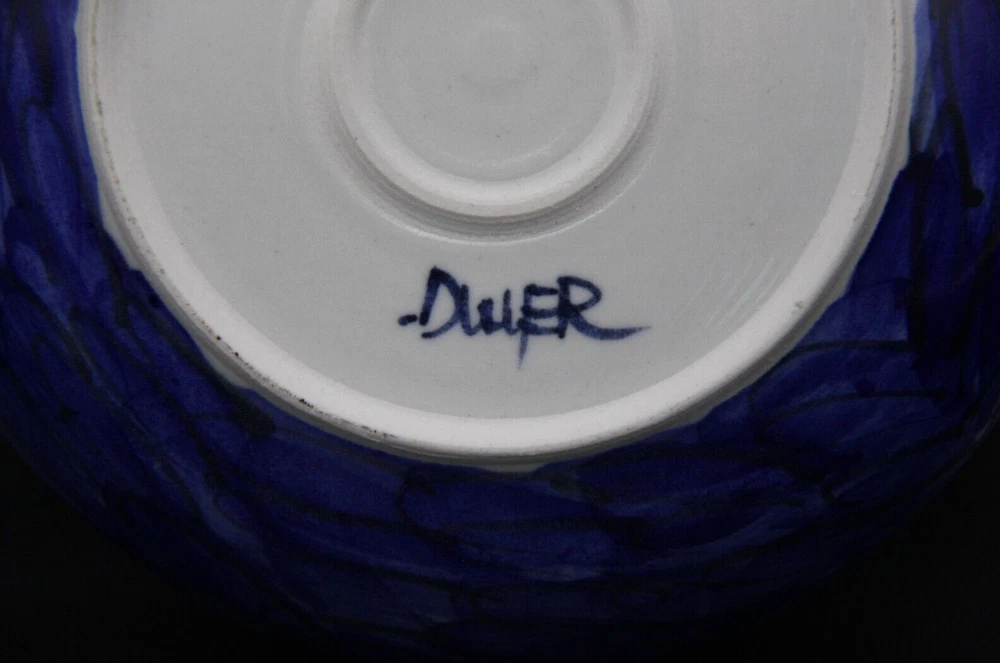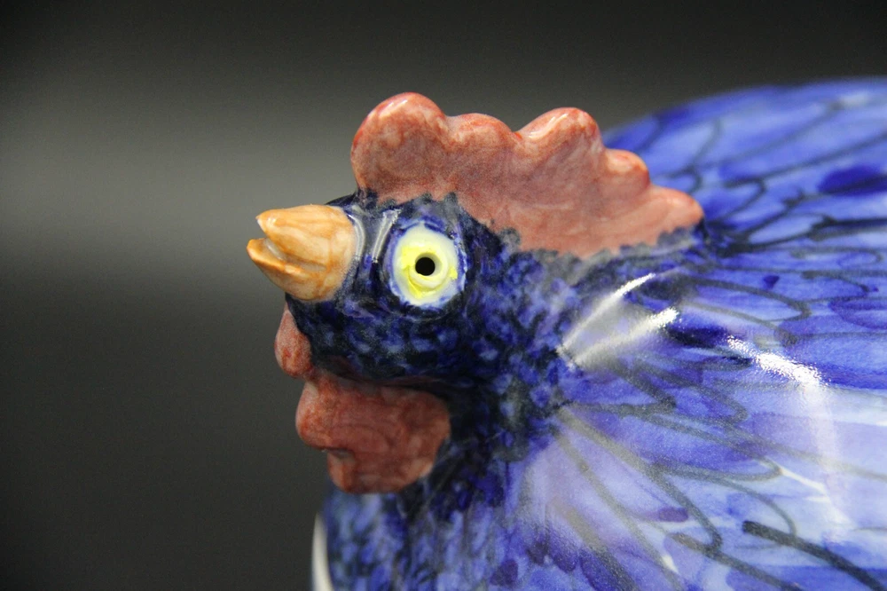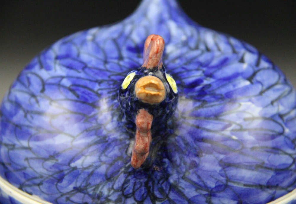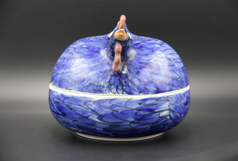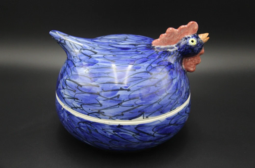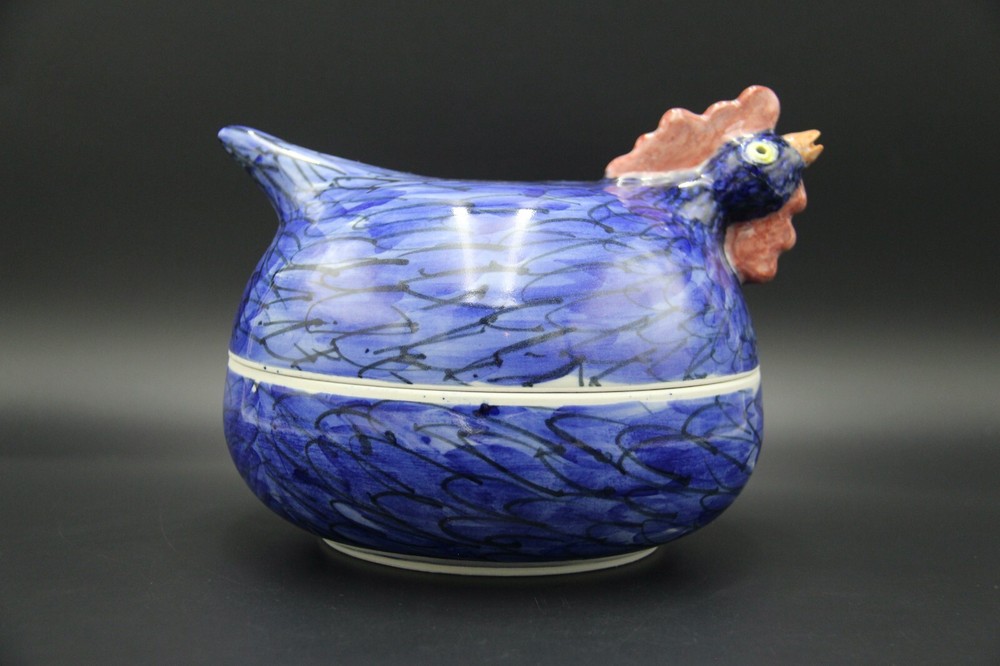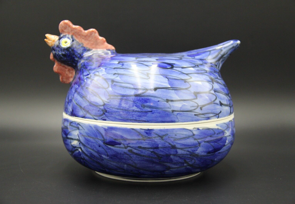 Vintage Dennis Dwyer Australian studio pottery hand painted blue chicken shaped covered egg dish. Great condition with no chips or cracks, general wear consistent with age. Measurements are approx. 21.5cm x 19cm x 16.5cm. Please refer to photographs for visual condition as they are part of the description and check item specifics for more information about item. Shipping can be combined on multiple purchases. Please request invoice first before paying for adjusted shipping once buyer has committed to sale by clicking buy on each item (this may not be possible if using the eBay app). Please do not hesitate to contact me if you have any questions. Buyers please note that all items are carefully washed, cleaned, wiped or polished prior to photographing and from a smoke free home.