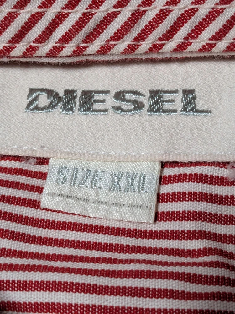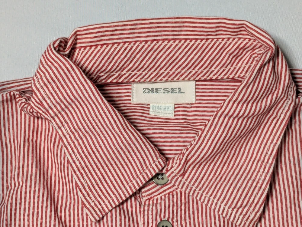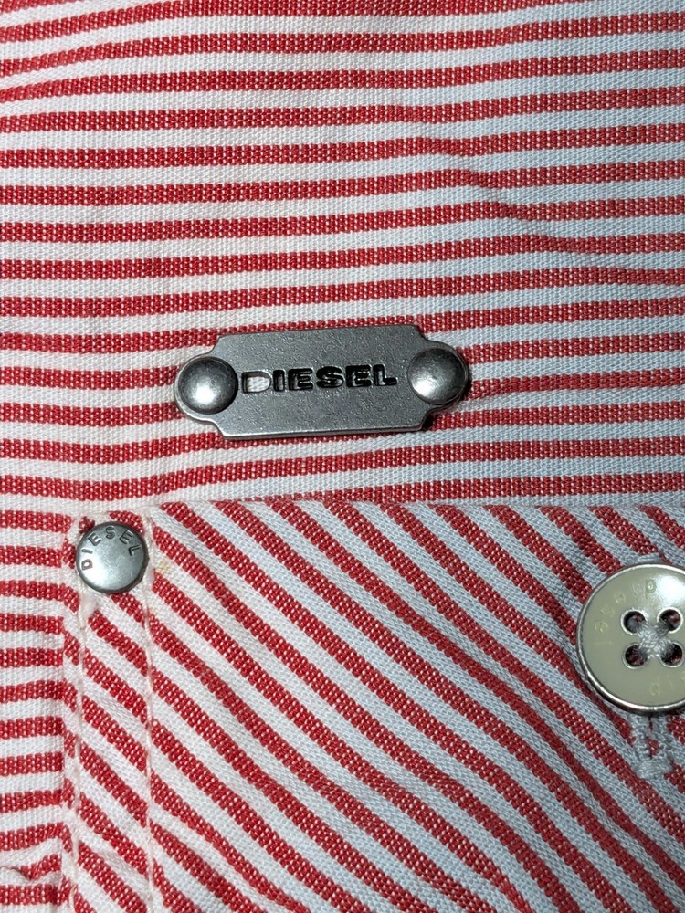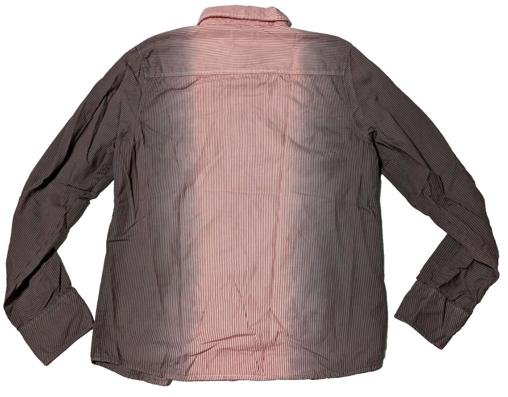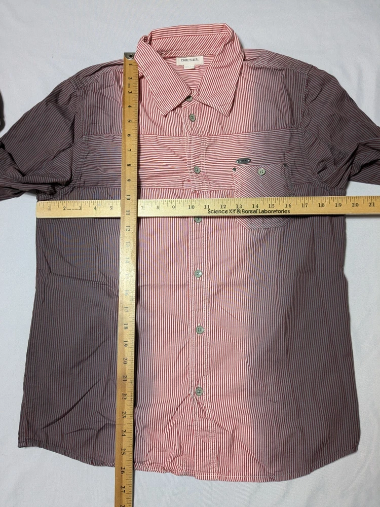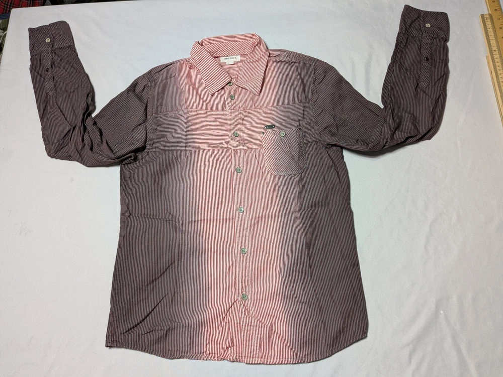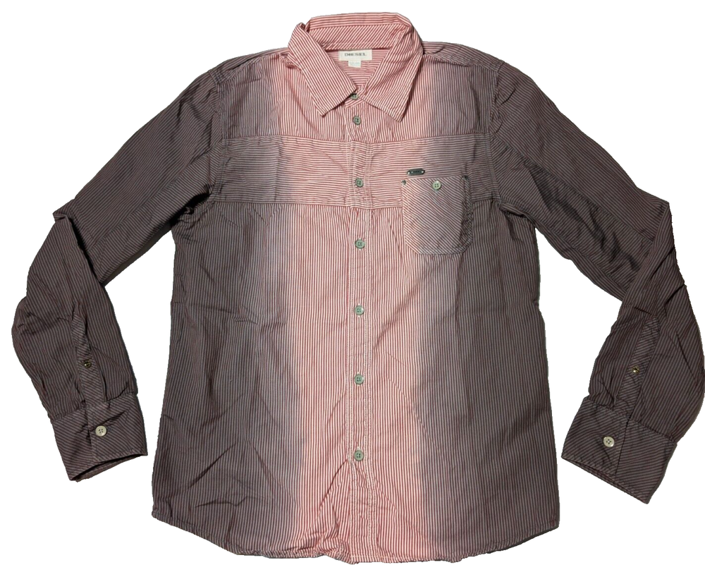 DIESEL Boys 2XL Red Dip Dye Pinstripe Button-Up Long Sleeve Shirt In Great Pre-owned Condition with no major flaws and missing material tag; IMO, if feels like cotton, as pictured. Please see photos, read description for item condition, and check measurements for size. Please note that manufacturers may have different measurements for their sizes, so please check my measurements to ensure item will fit. 19936