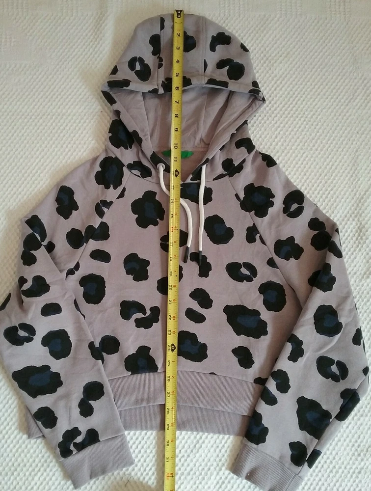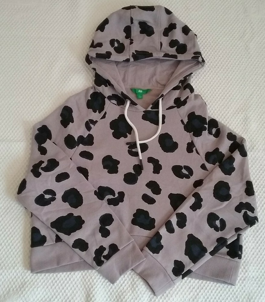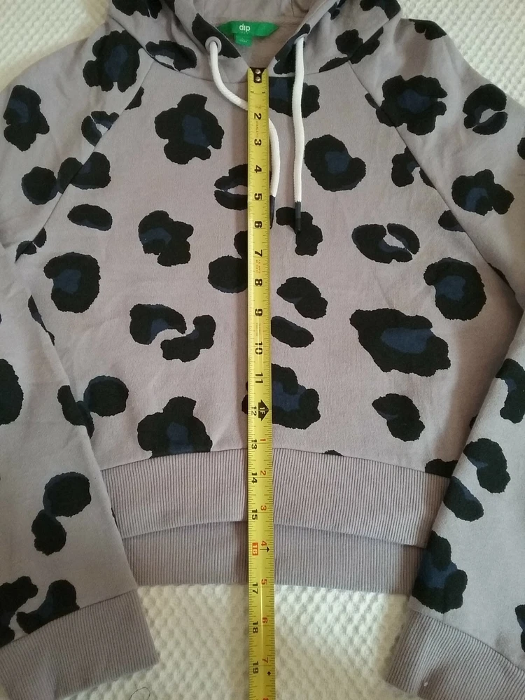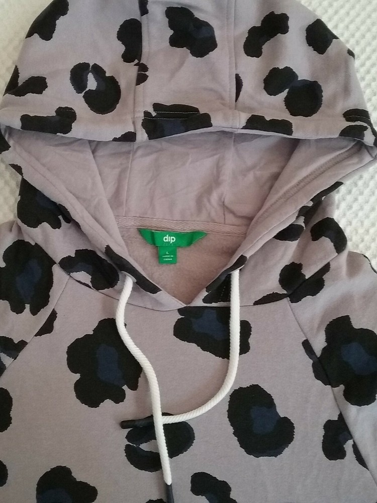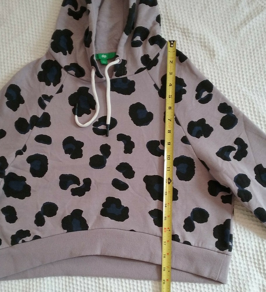DIP Leopard print cropped hoodie Jr size large in purple gray Hi-low style, front is about 1"in higher then the back Black and blue leopard print Ribbed hem and wrist "Pre-owned", used once almost like new condition. Measurements: (laying flat) 21.5"in armpit to armpit 8"in armpit to hem 16"in sleeves, armpit to wrist opening Please check other photos for measurements THANKS FOR LOOKING!
