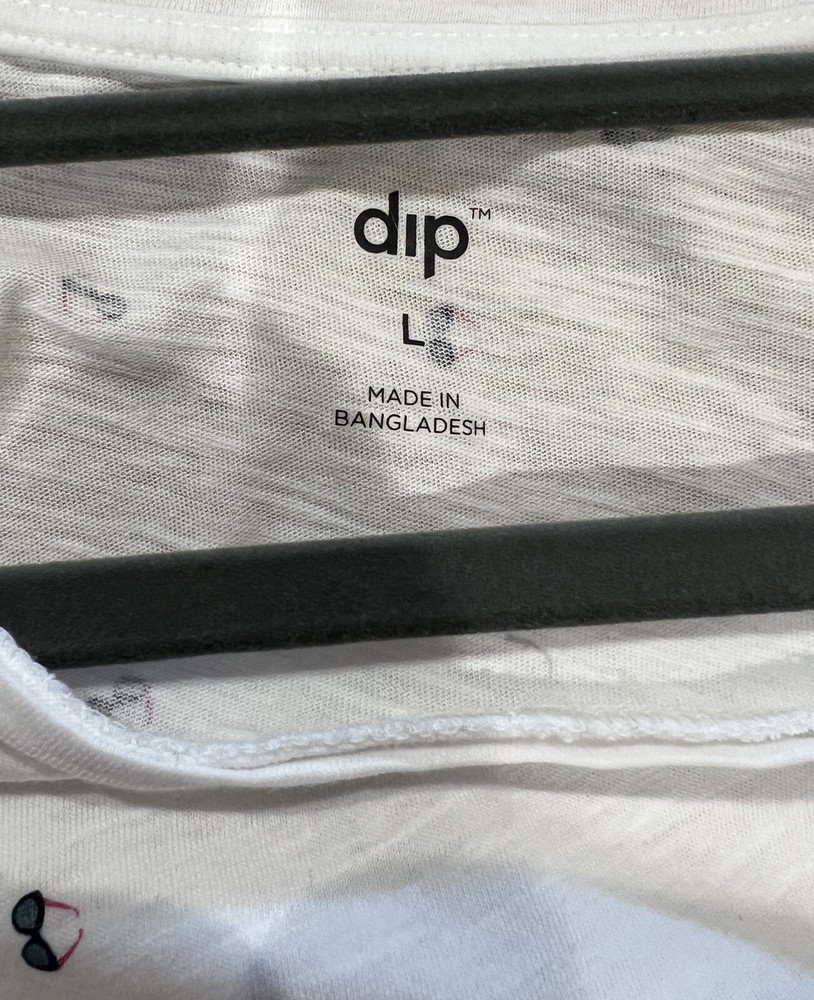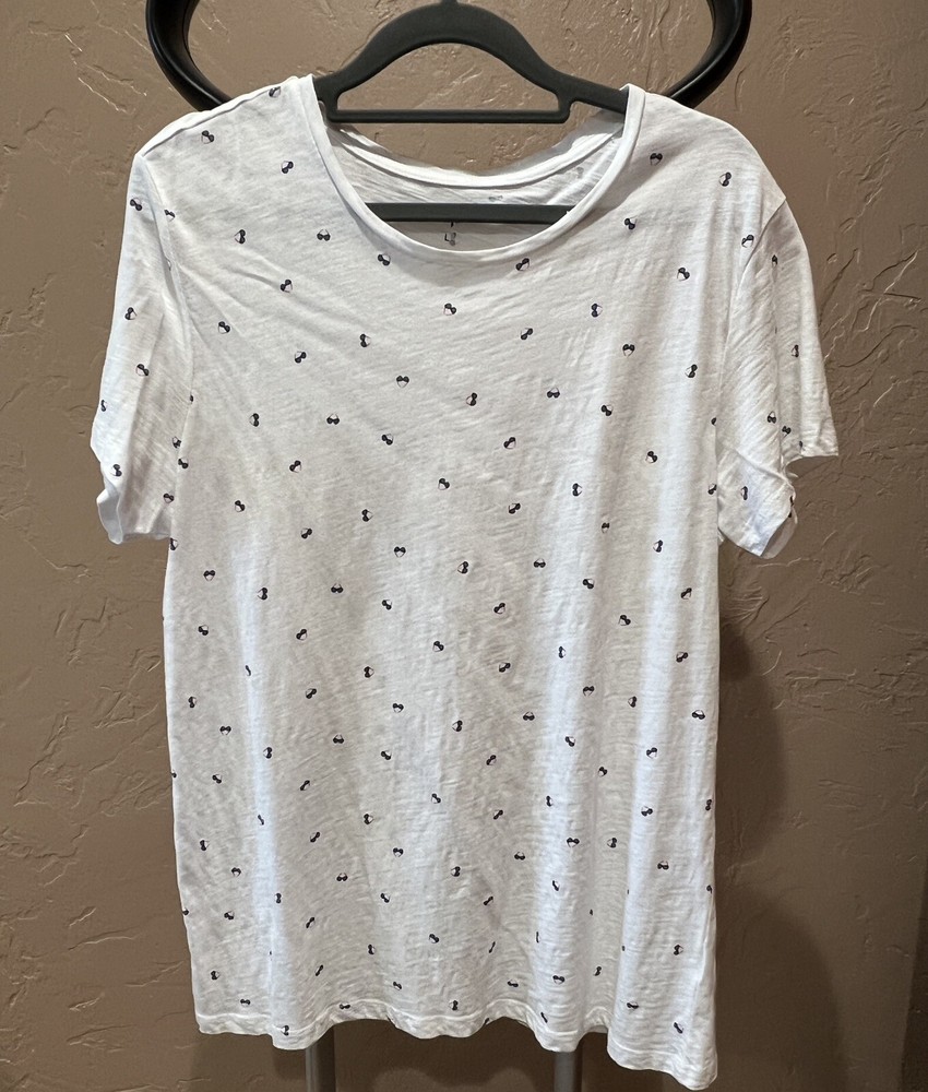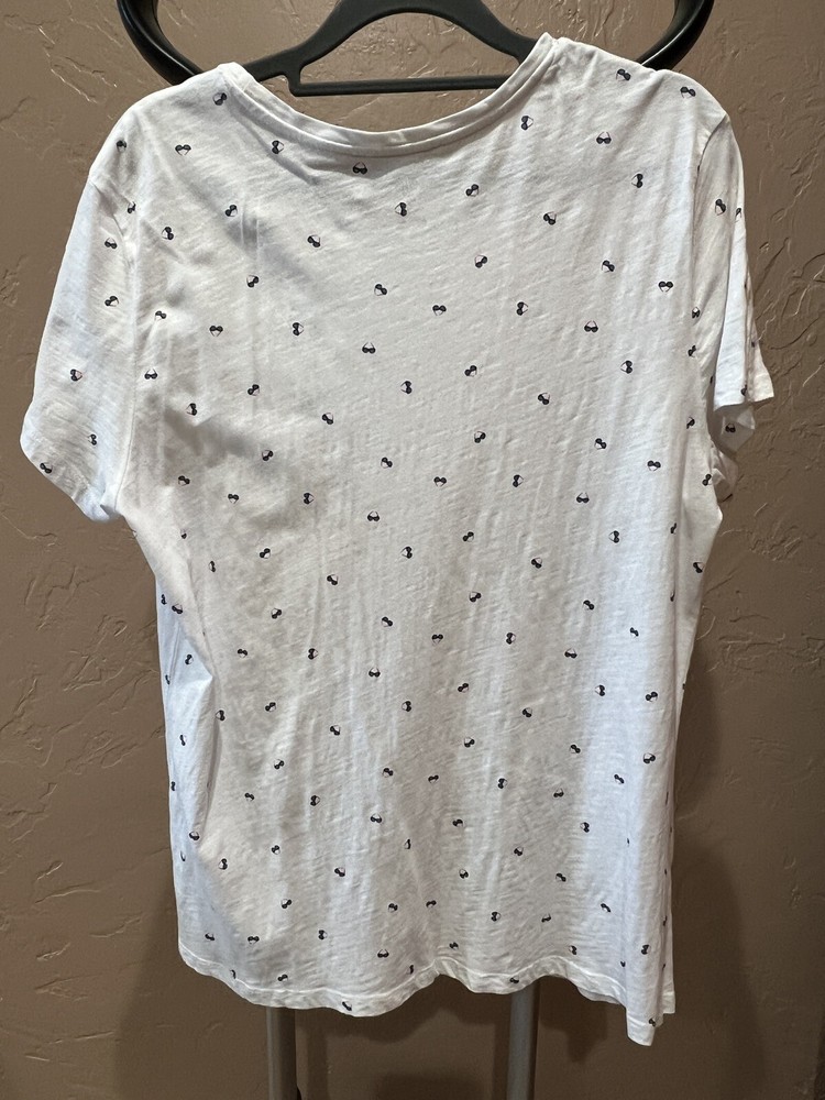 This white short sleeve T-shirt from DIP features a cute Tiny Fruit print on the front. Made of 100% cotton, it is comfortable and perfect for casual wear. The shirt is size L and has a crew neck. The brand is known for its quality clothing and this top is no exception. It is ideal for women who want to add a stylish and unique piece to their wardrobe. The shirt is pre-owned but in excellent condition. Armpit to armpit 20” Front: Top of shirt to bottom 23” Sleeve length 7” Armhole 6.5” Back: Top to bottom 26”