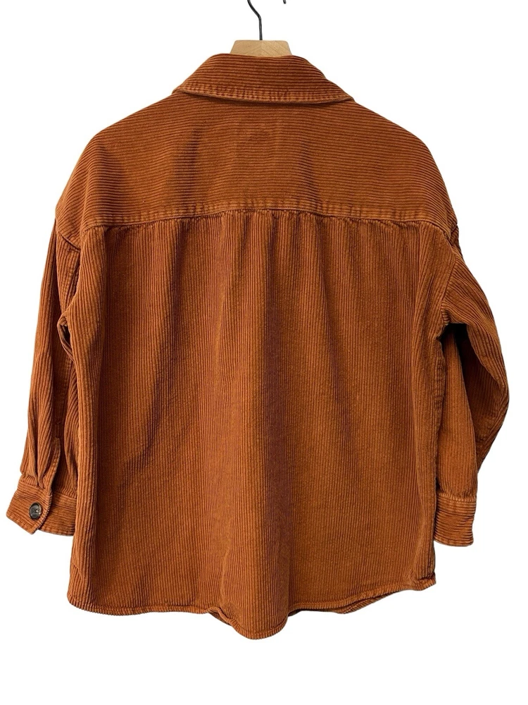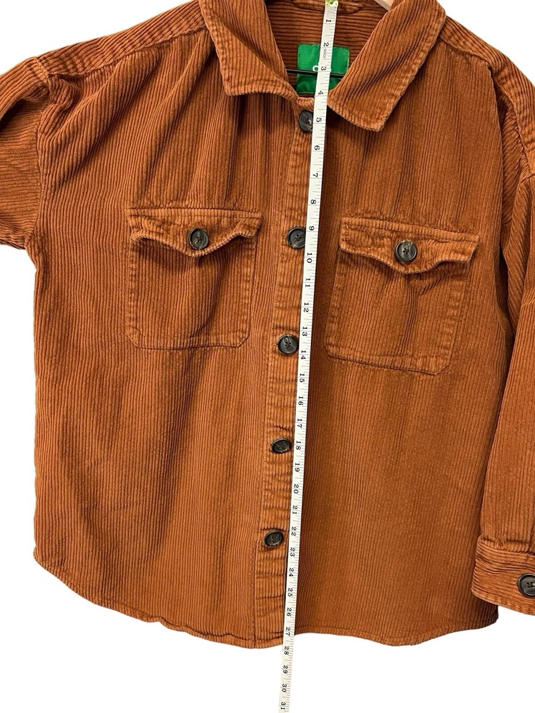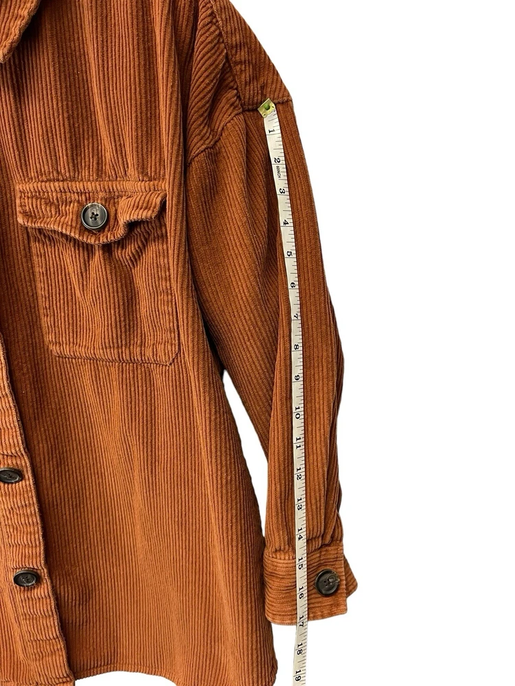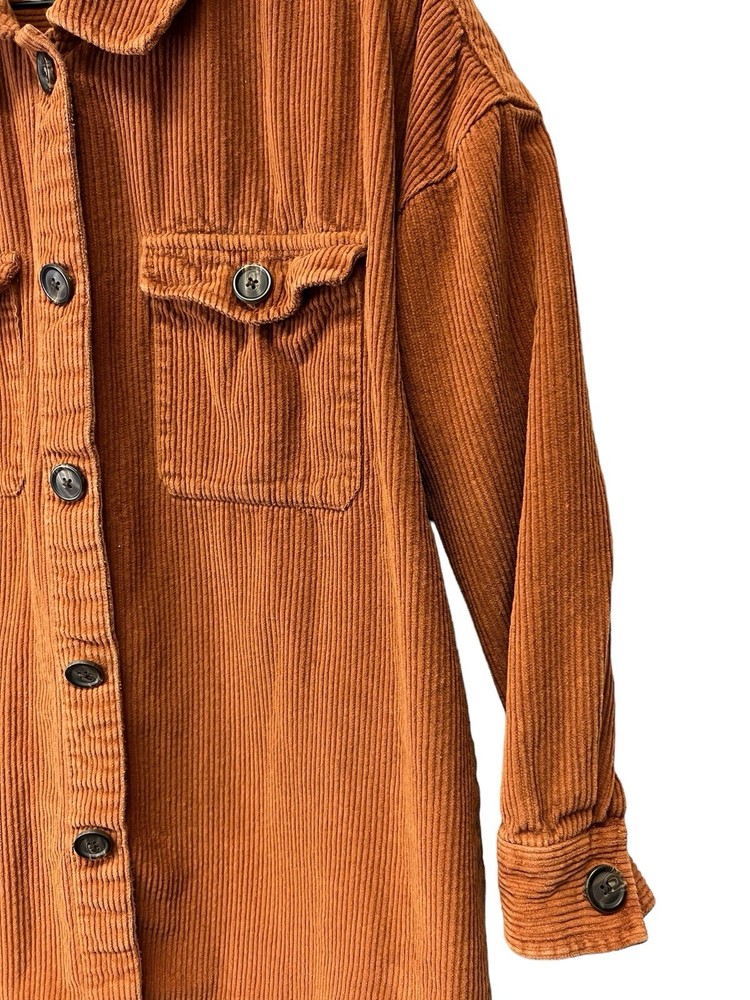 Awesome orange button down shacket. Oversized size large. Sleeves are more of a 3/4 sleeve length. 100% COTTON MACHINE WASH COLO WITH LIKE COLORS TUMBLE DRY LOW COOL IRON IF NEEDED MADE IN INFIA RN 29360